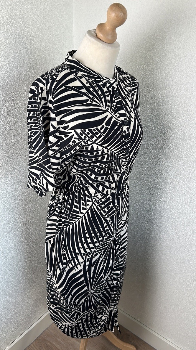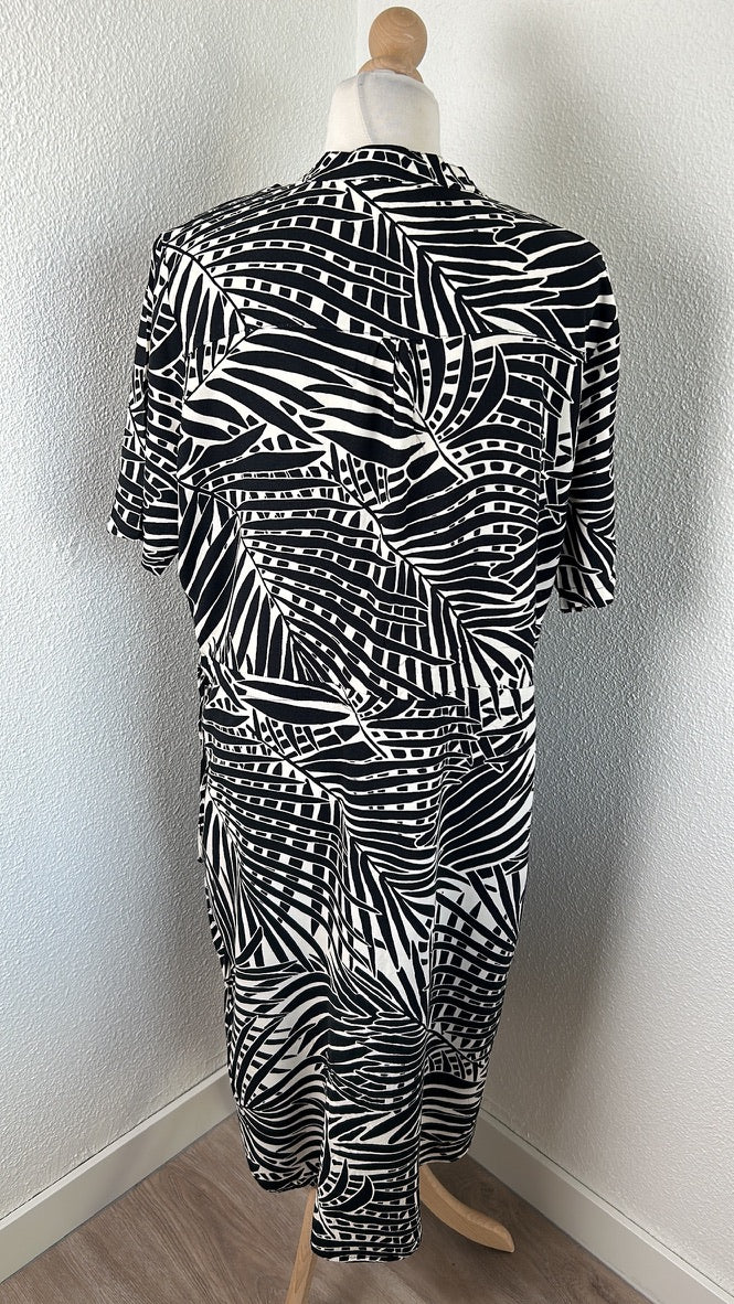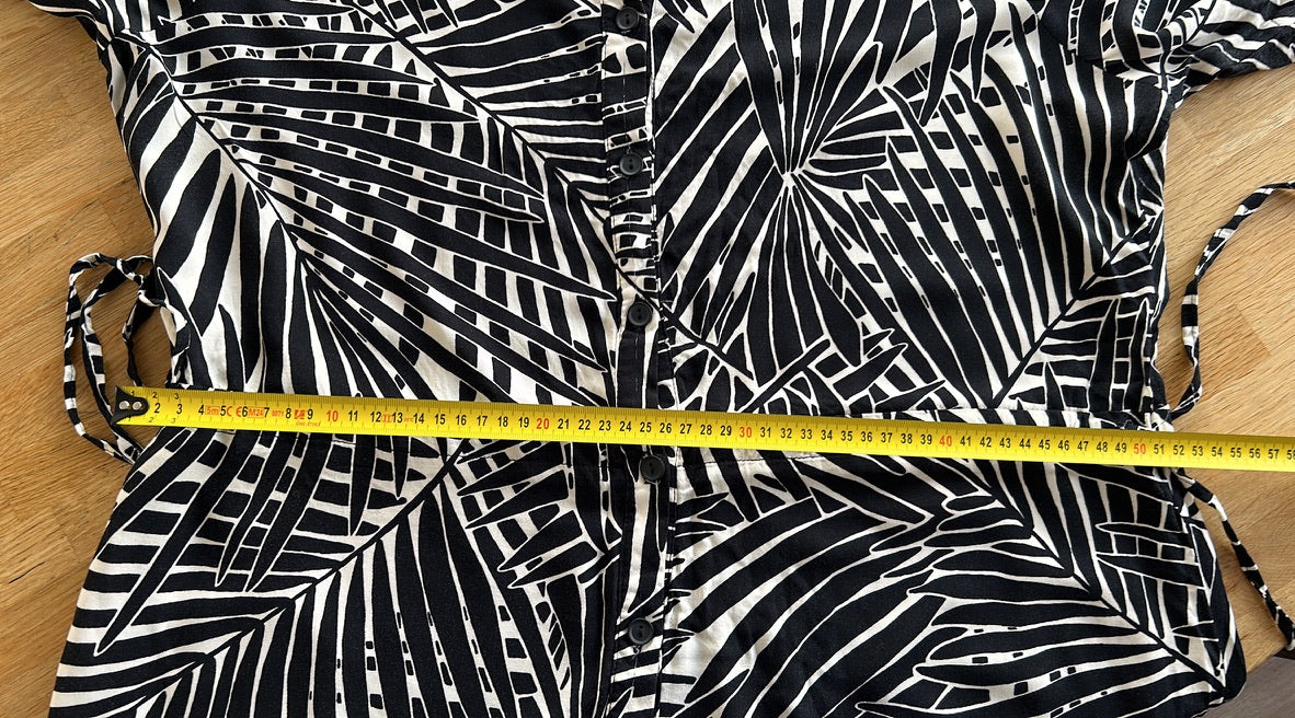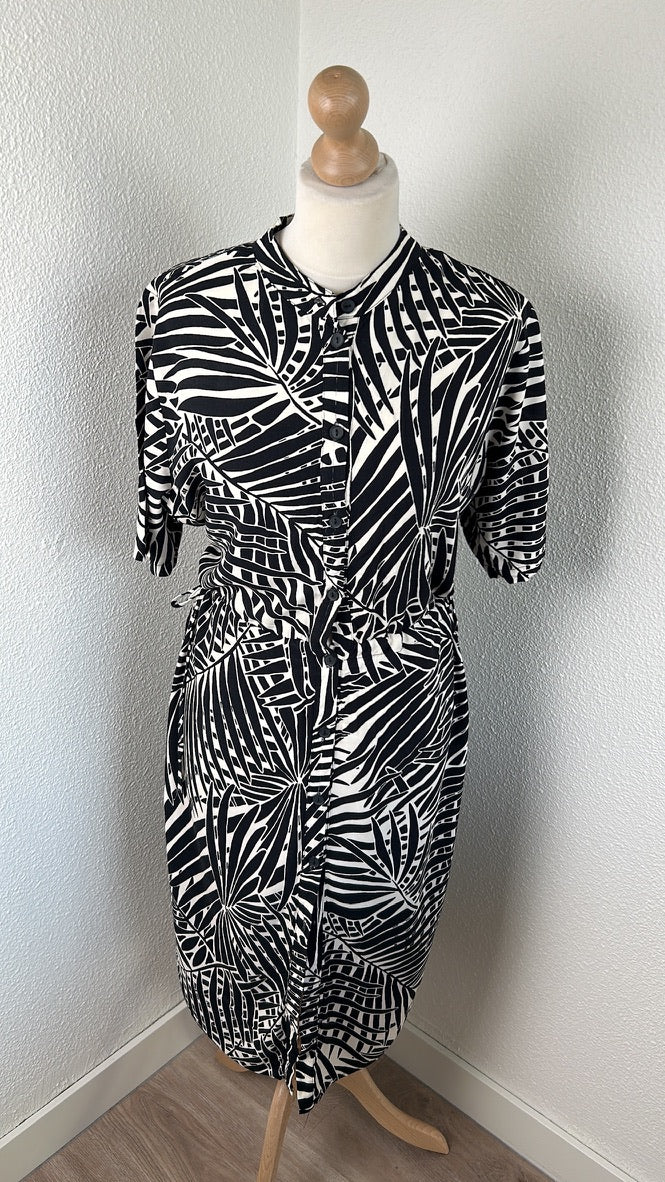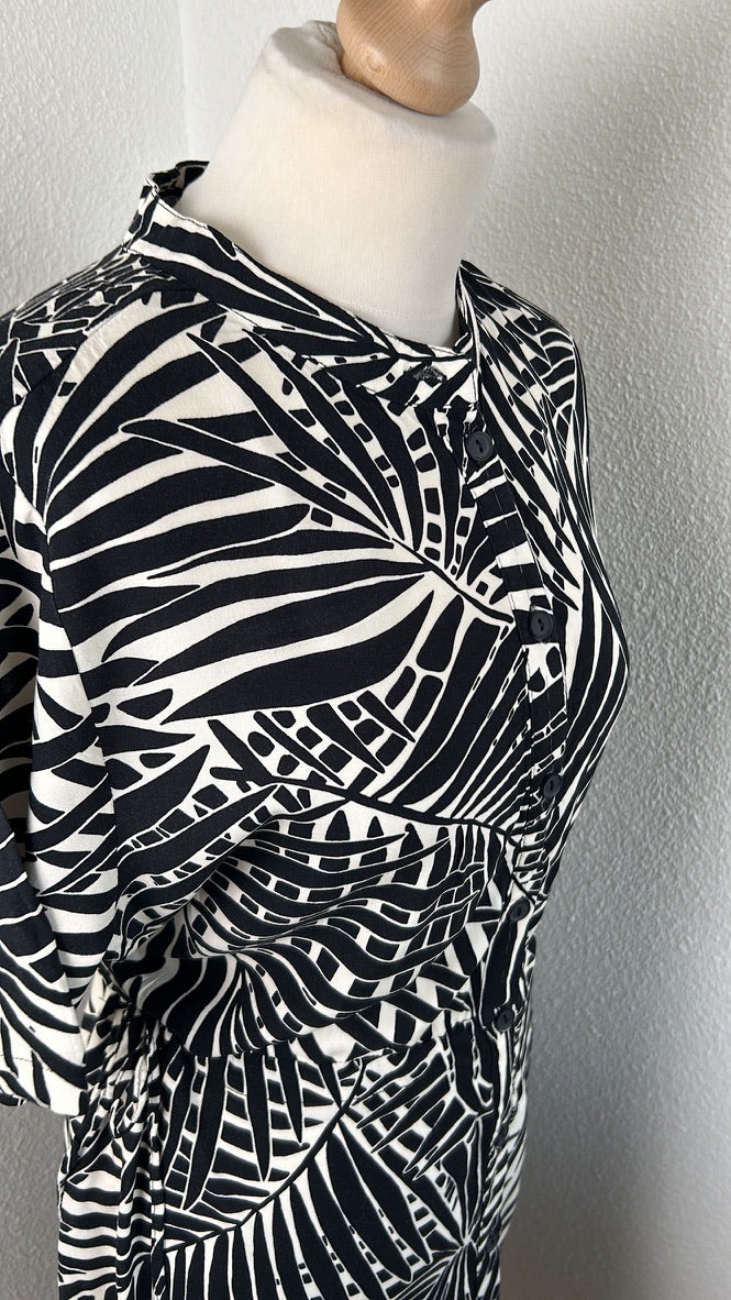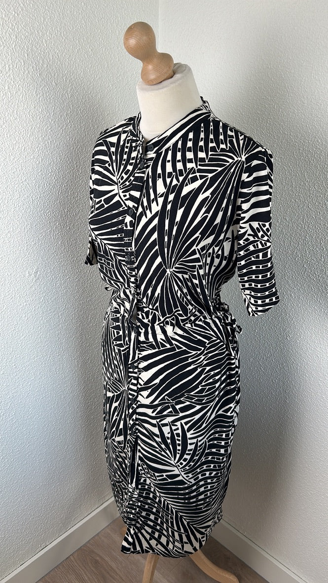 - Ronde halslijn, korte mouwtjes, getailleerd door trekkoordjes in de zij, knoopjes tot onder