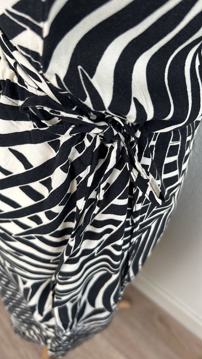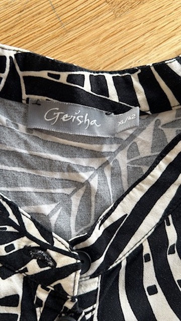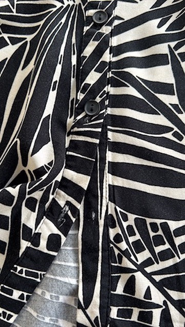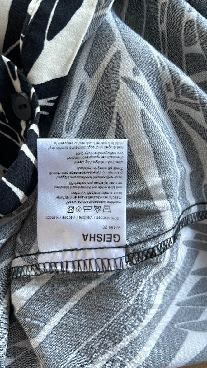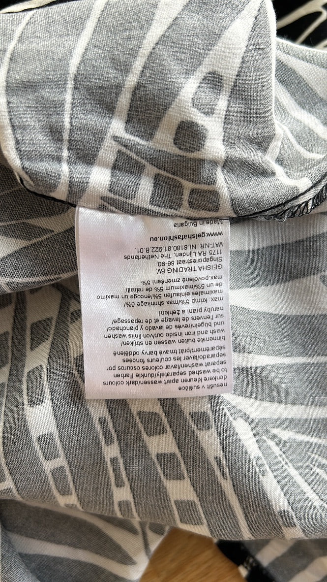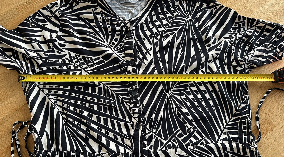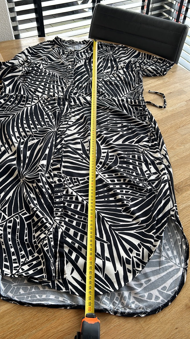- Ronde halslijn, korte mouwtjes, getailleerd door trekkoordjes in de zij, knoopjes tot onder
