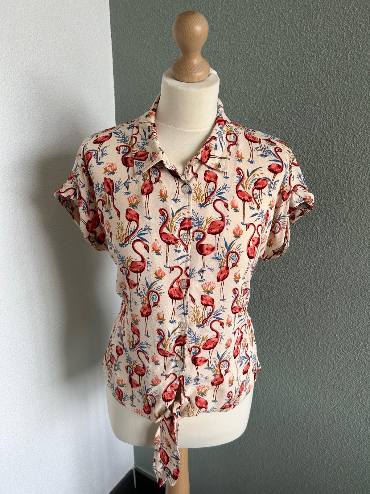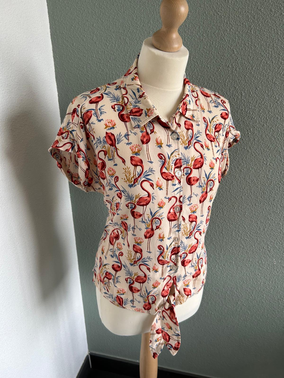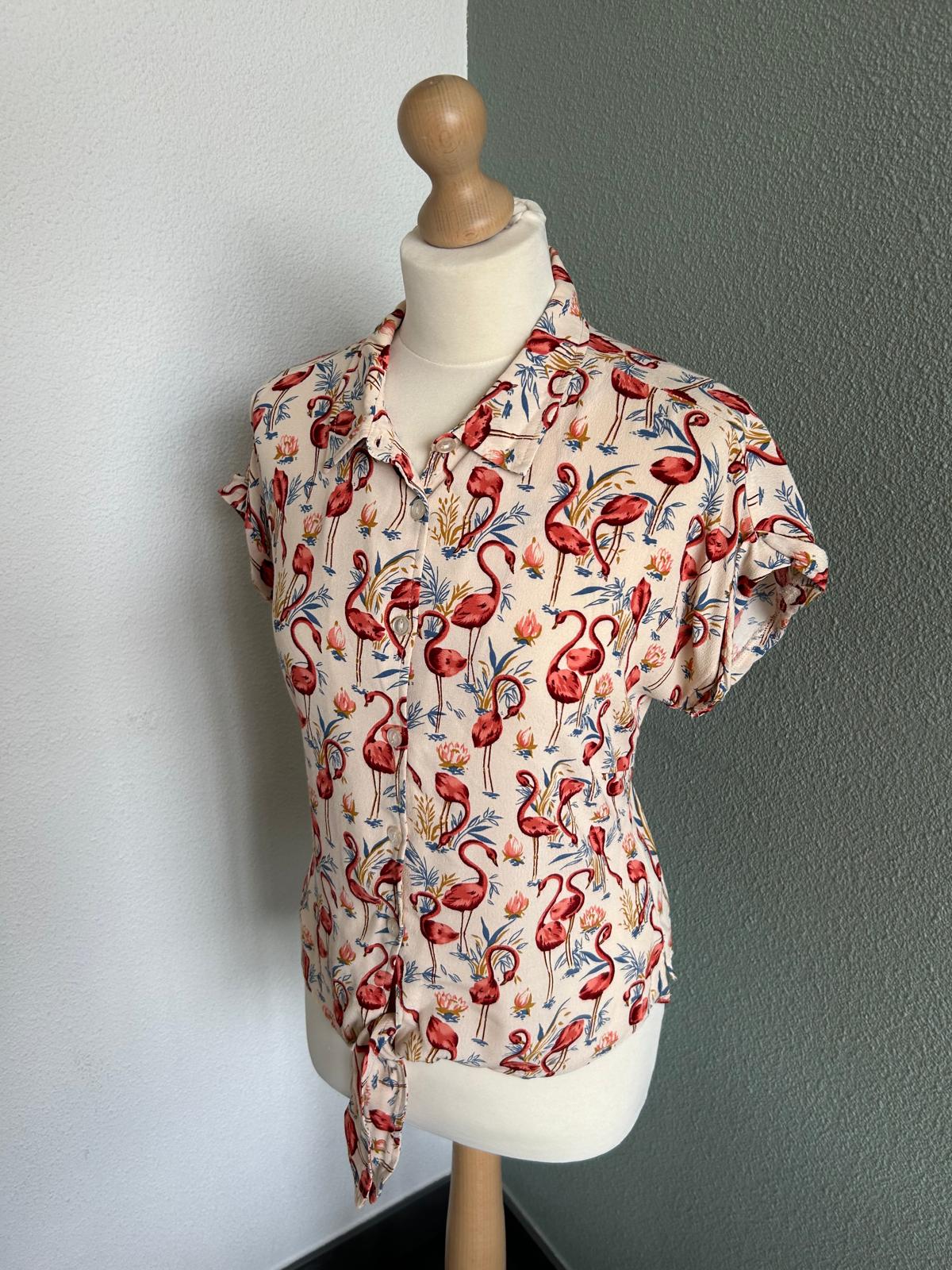 - Kraagje, korte mouwen, leuke knoopjes, knoop detail onderin de top