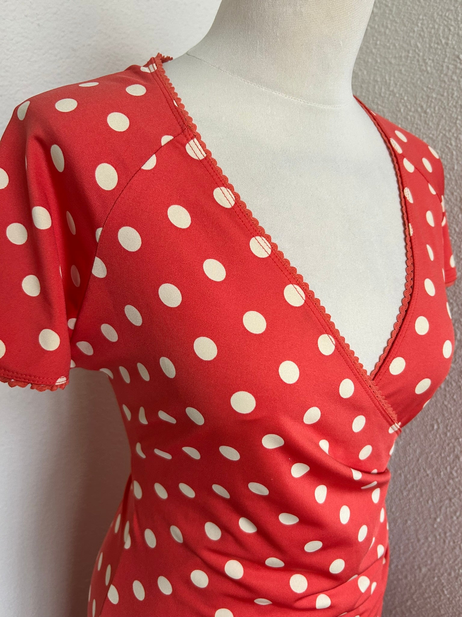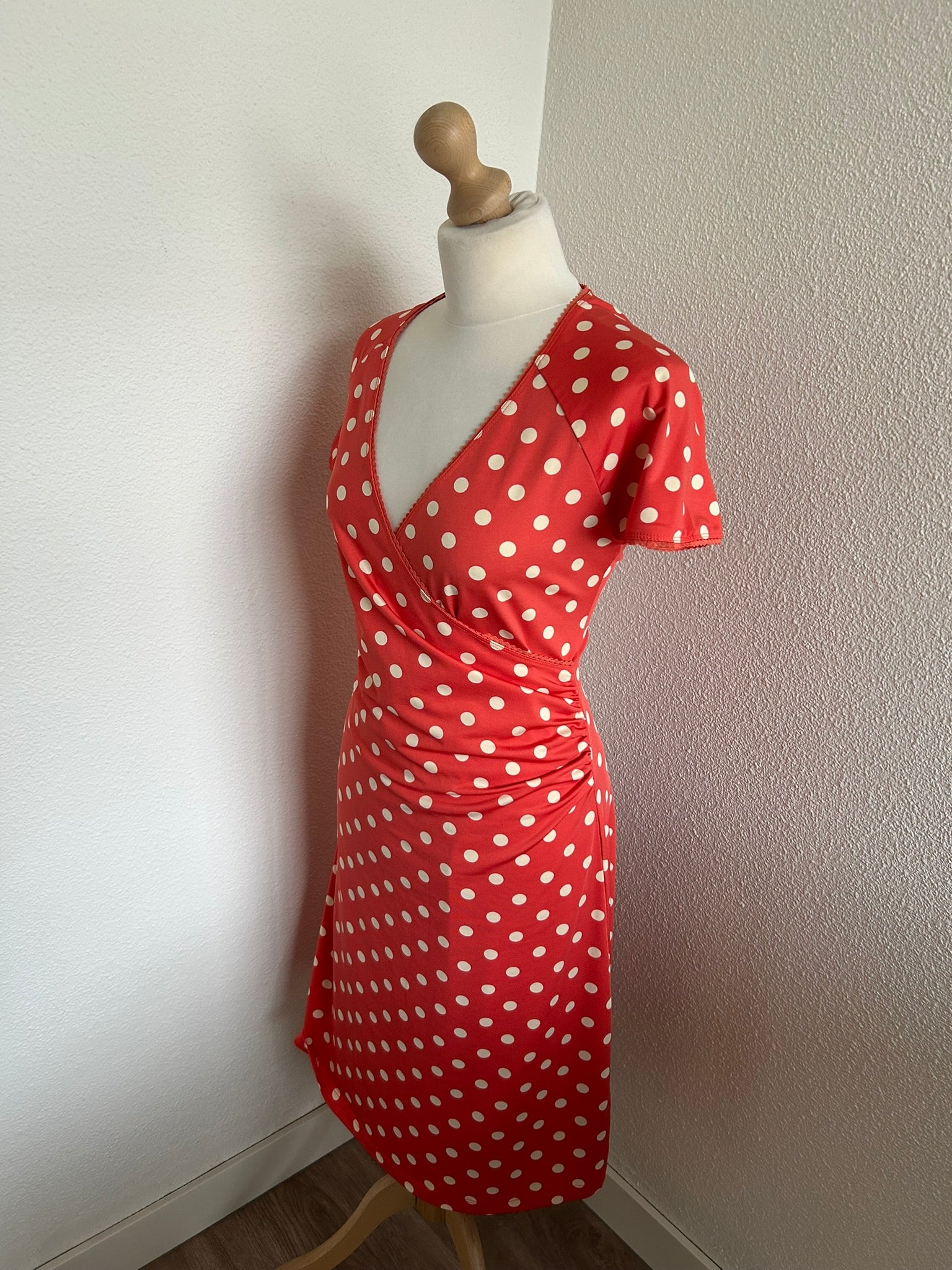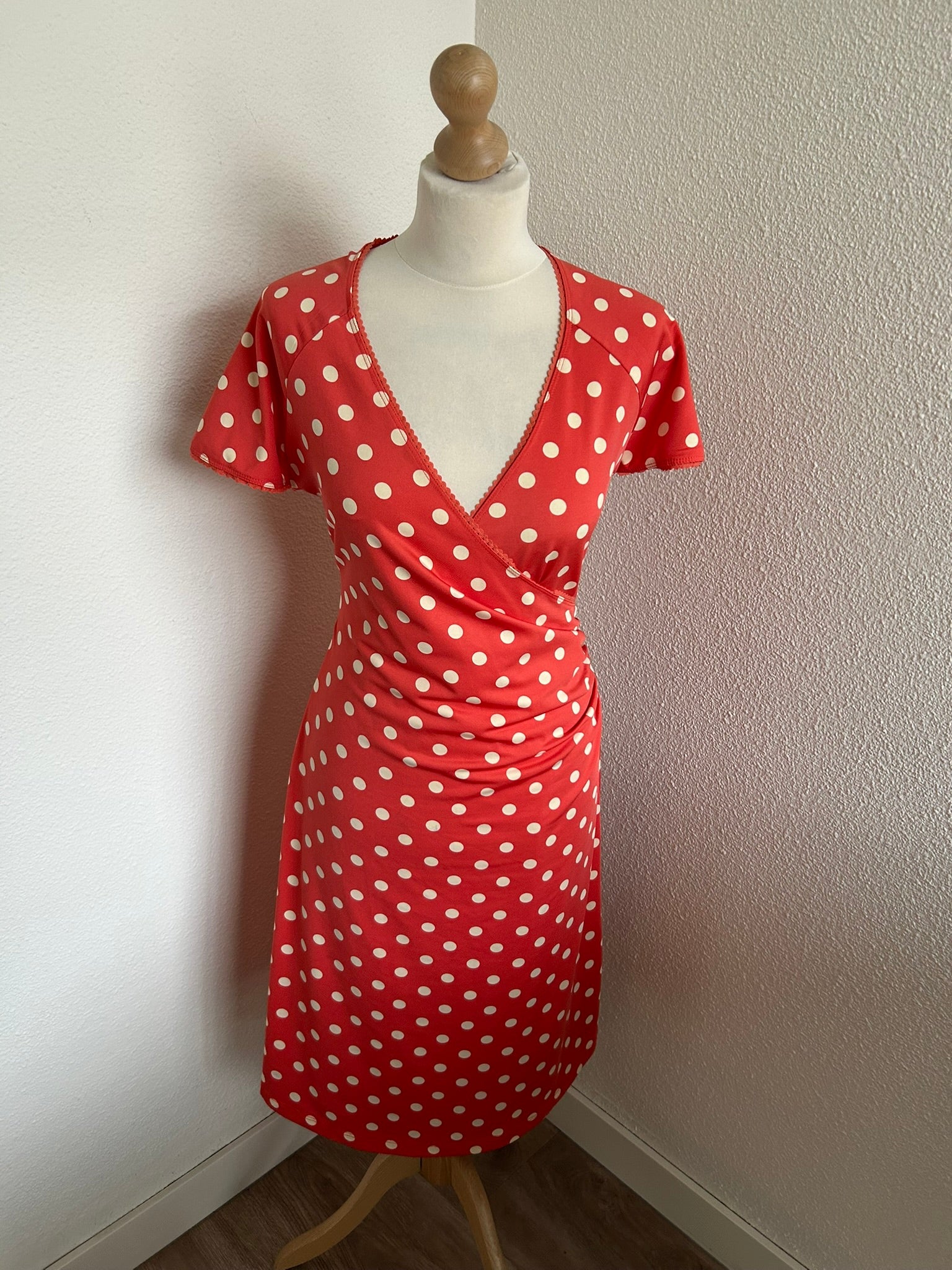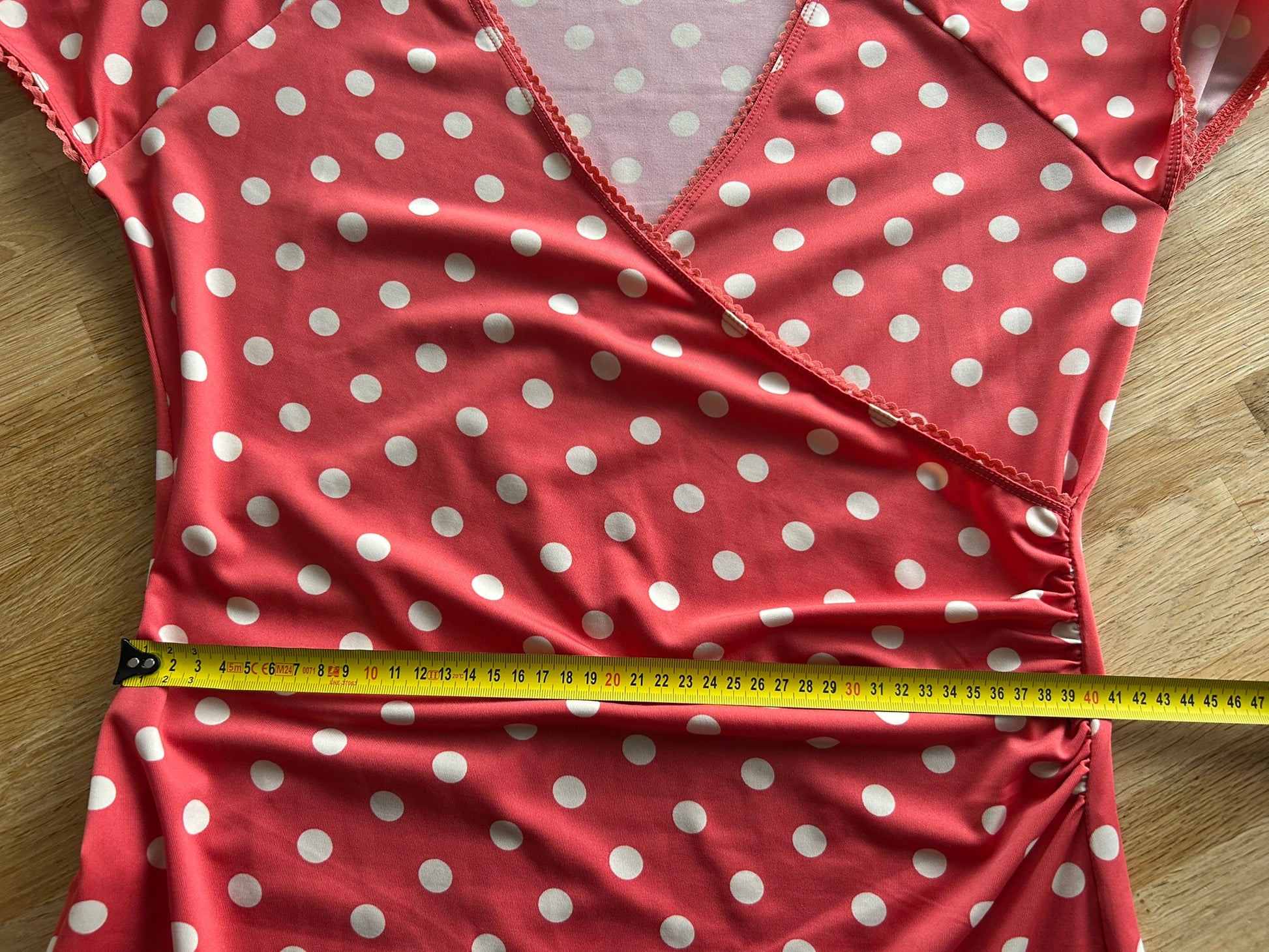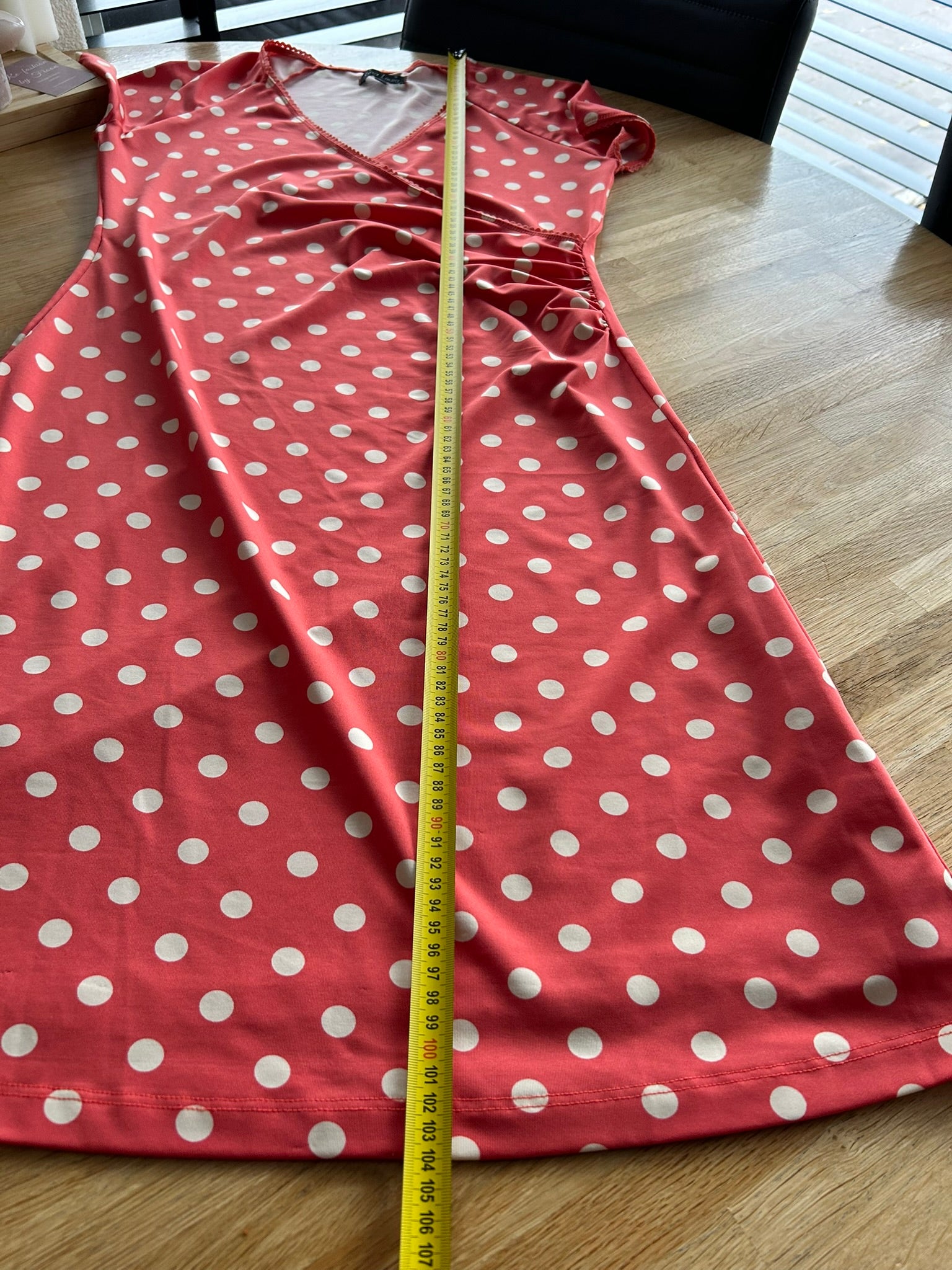 - Leuke retro jurk in koraal oranje-roze met witte polkadot/partypolka stippen print