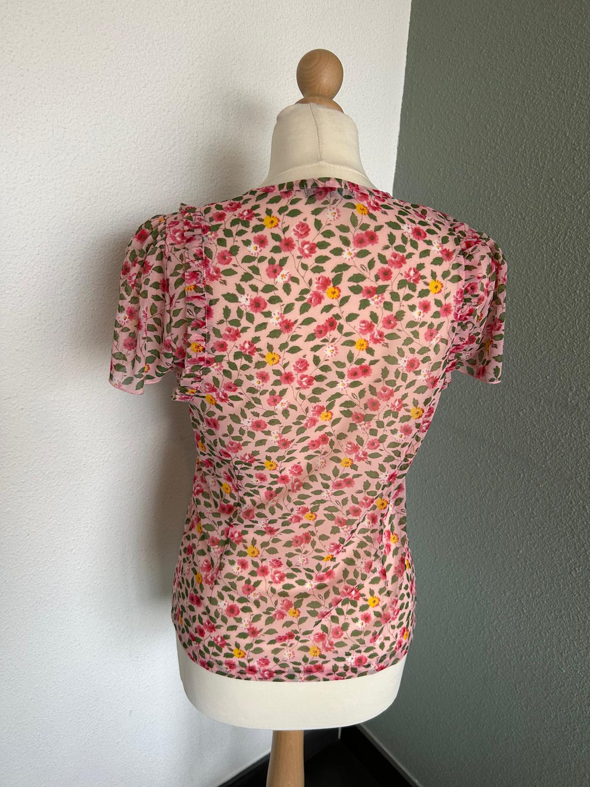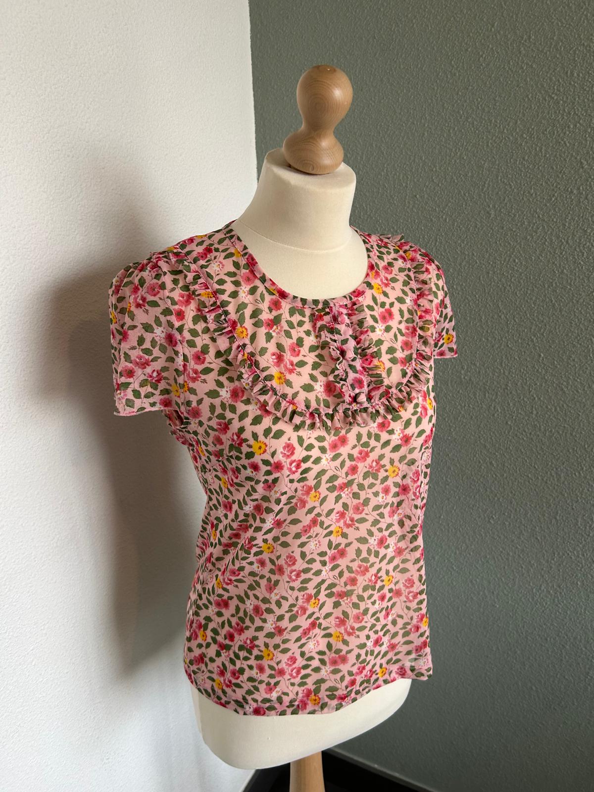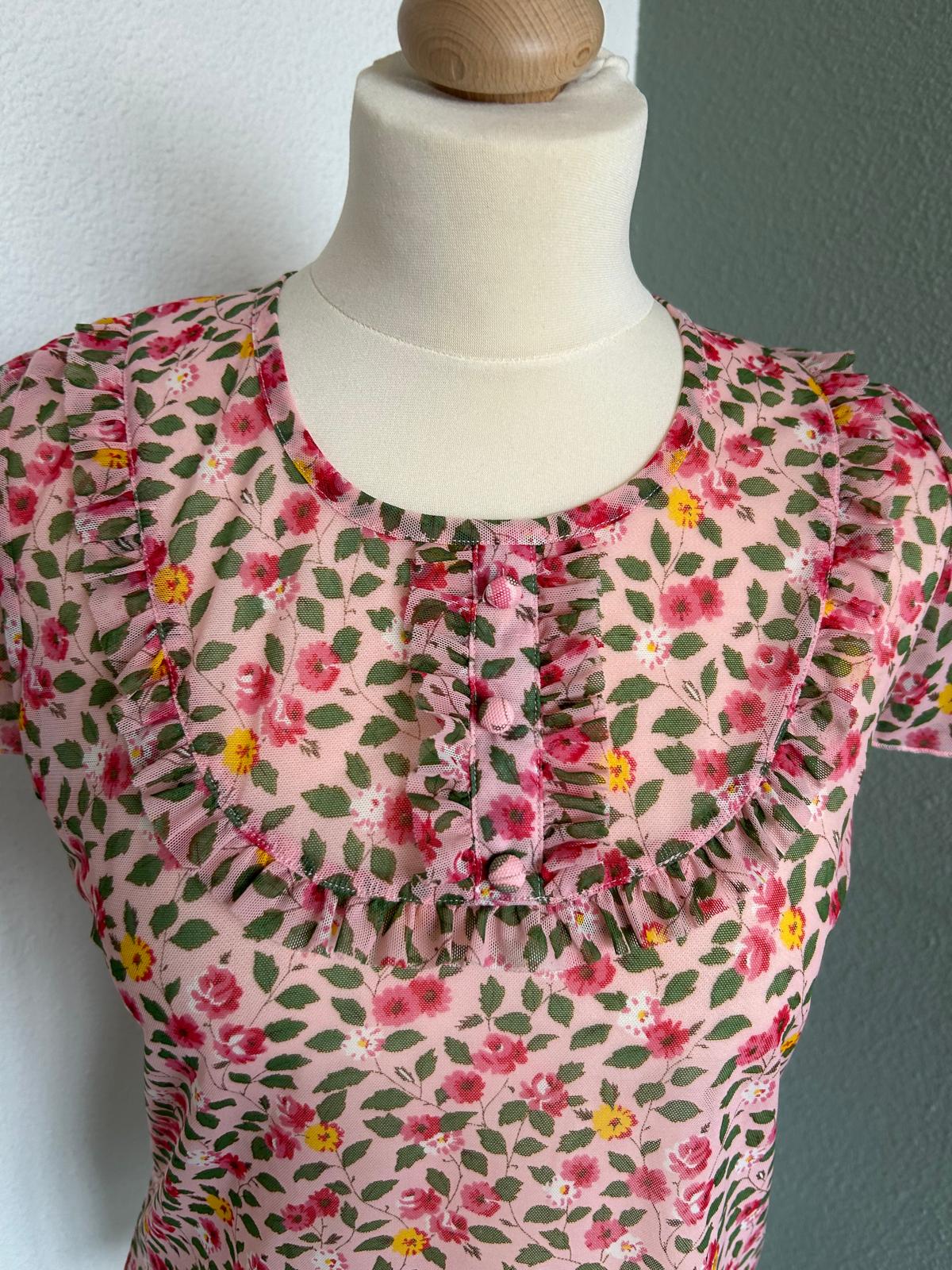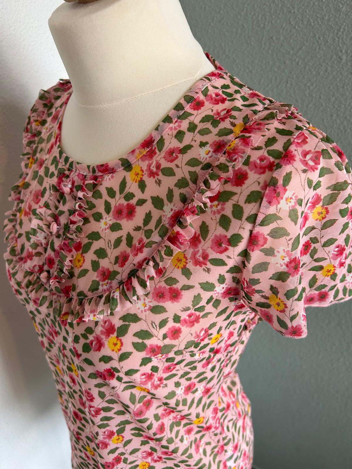 - Ronde halslijn met ruffke/rushed op de borst en leuke stoffen knoopjes, korte mouwen