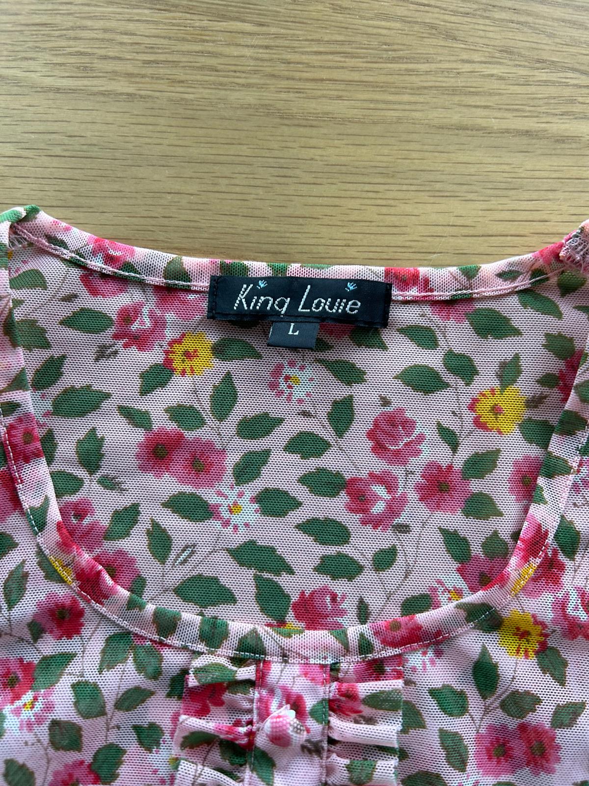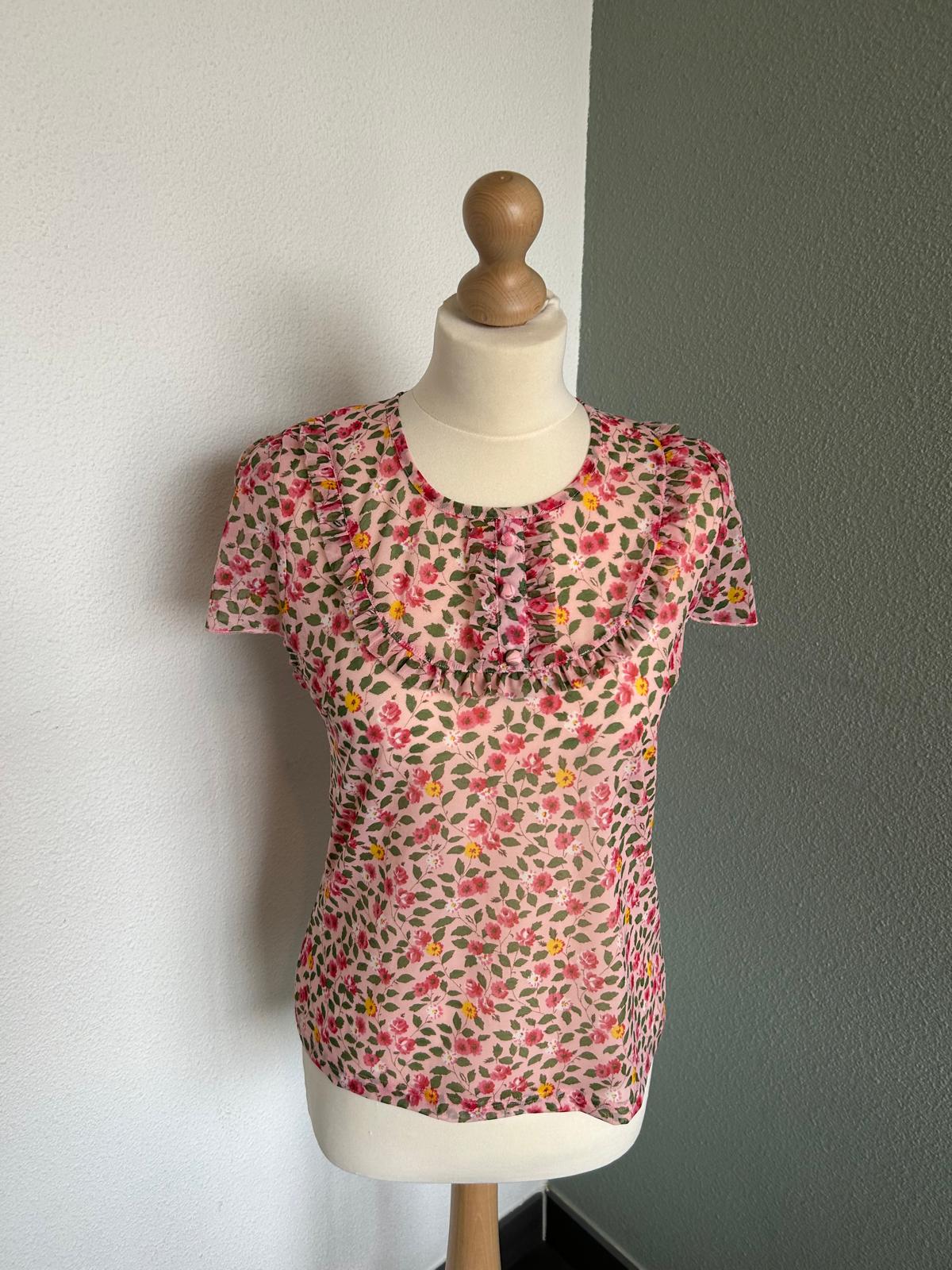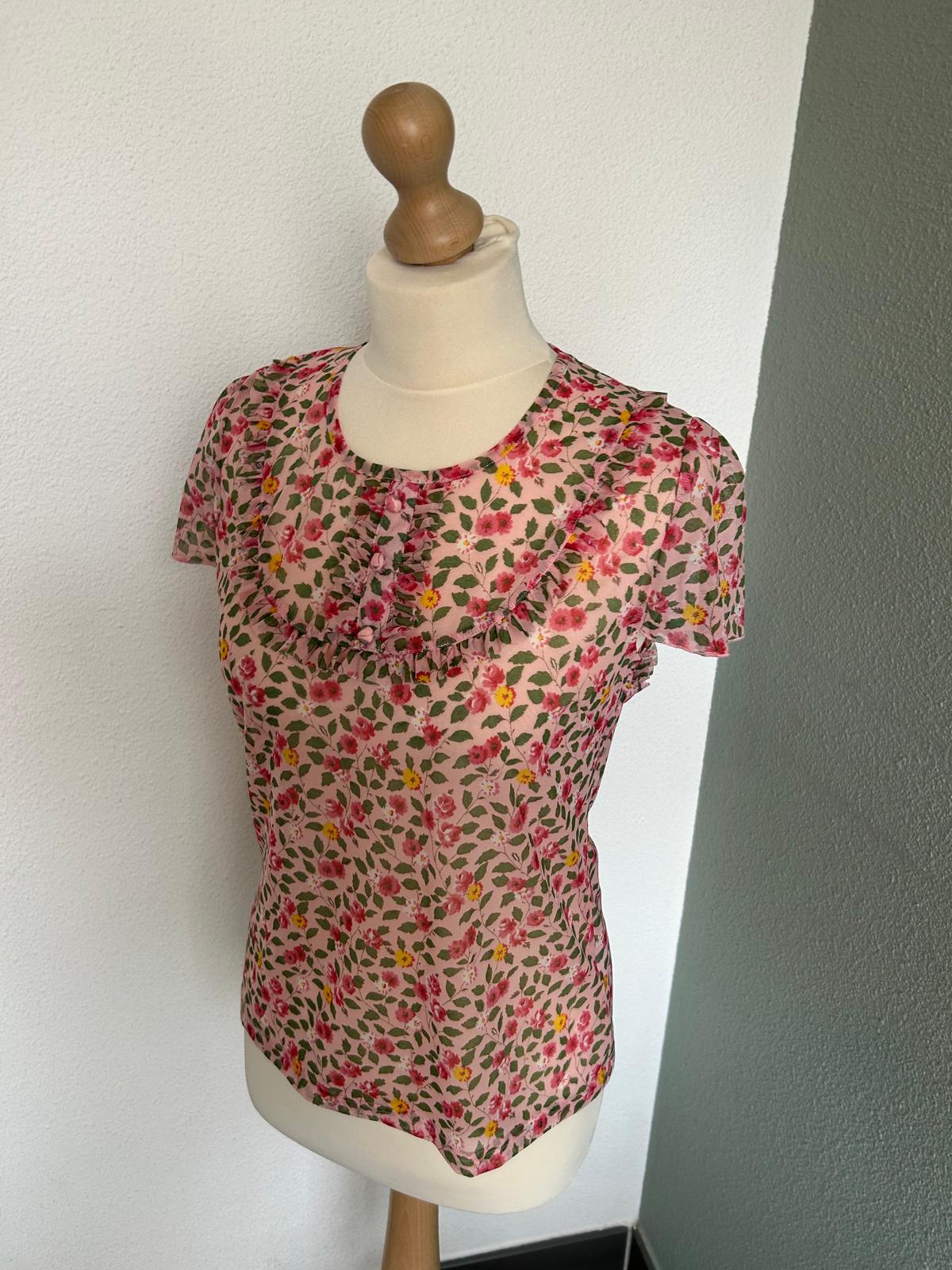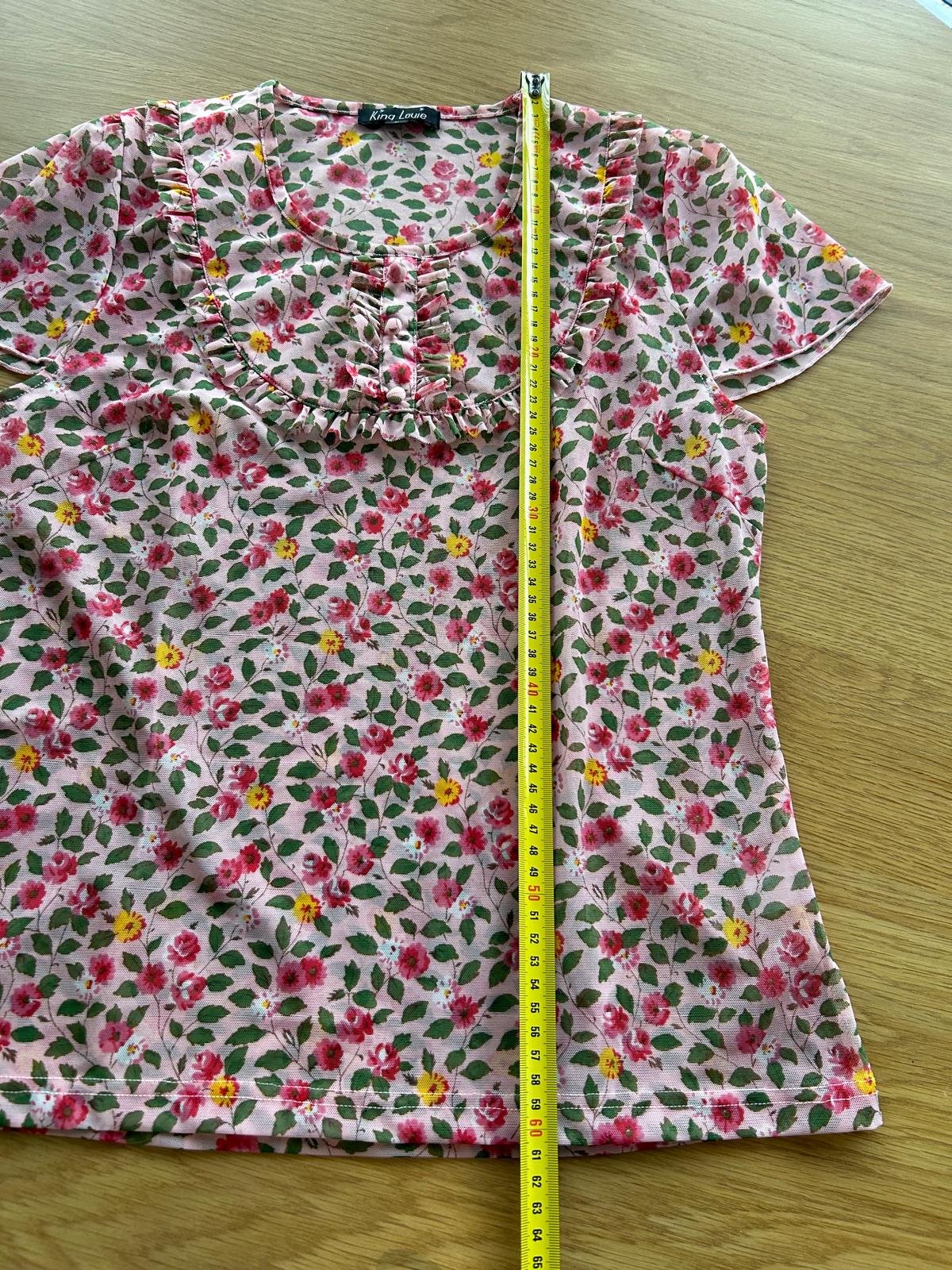 - Ronde halslijn met ruffke/rushed op de borst en leuke stoffen knoopjes, korte mouwen
