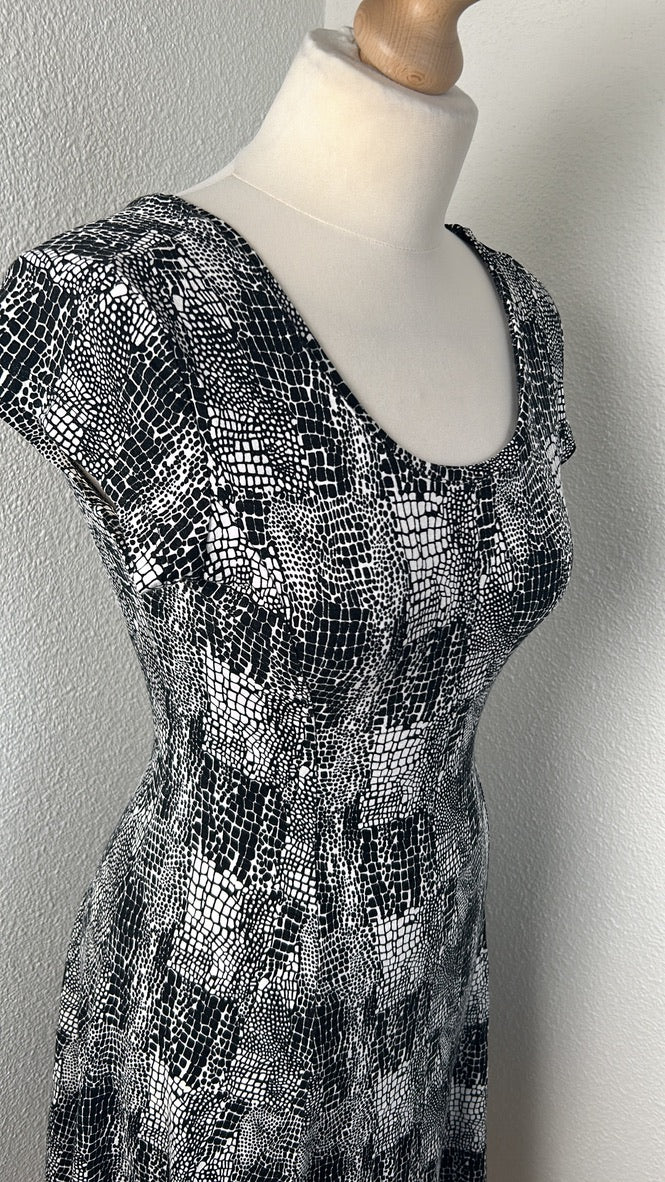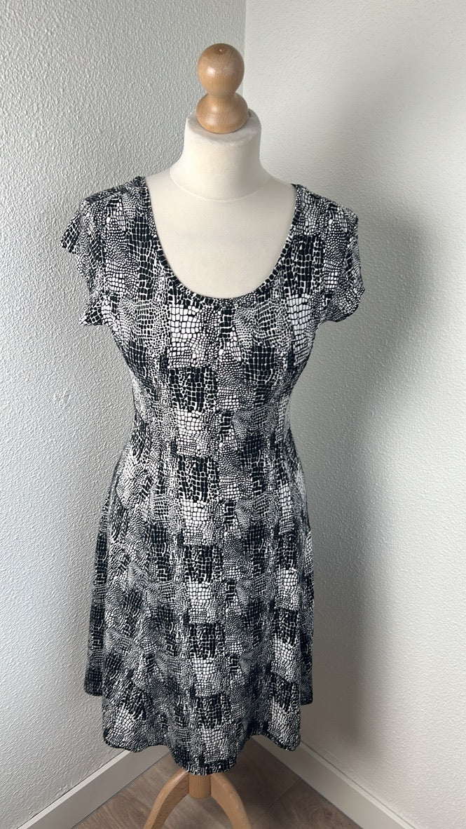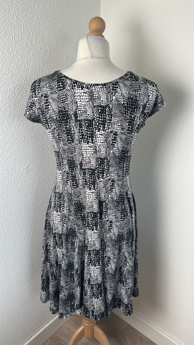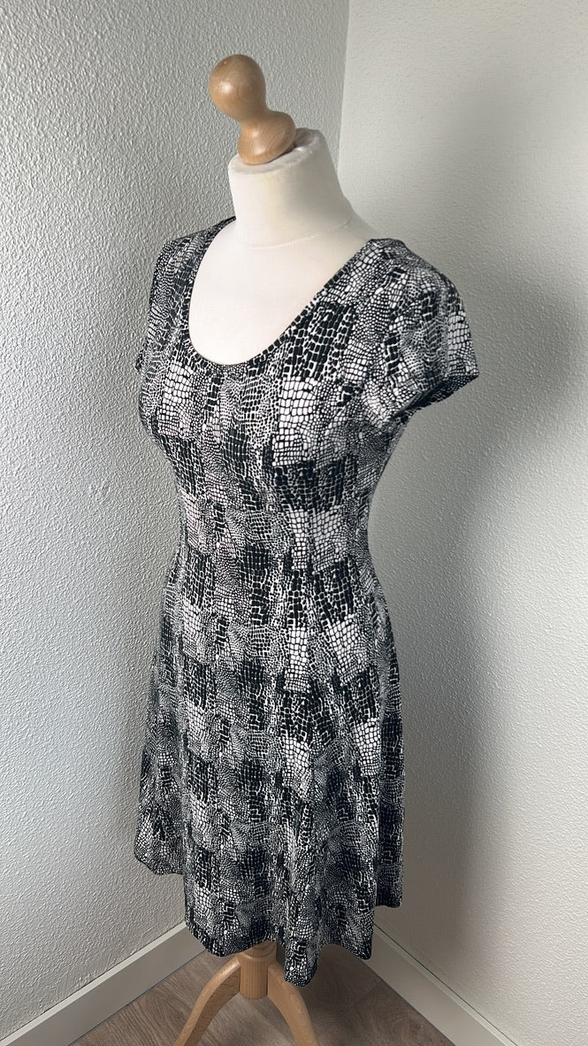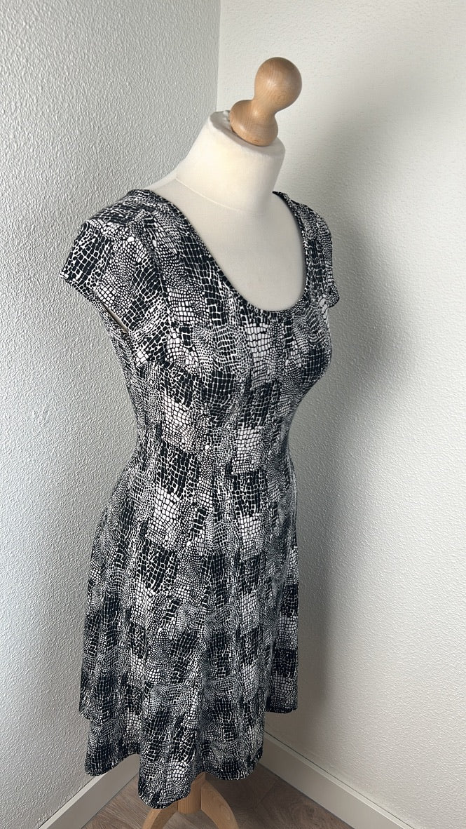 - Ronde halslijn, korte mouwen, getailleerd en uitlopende swing rok