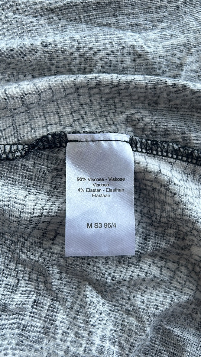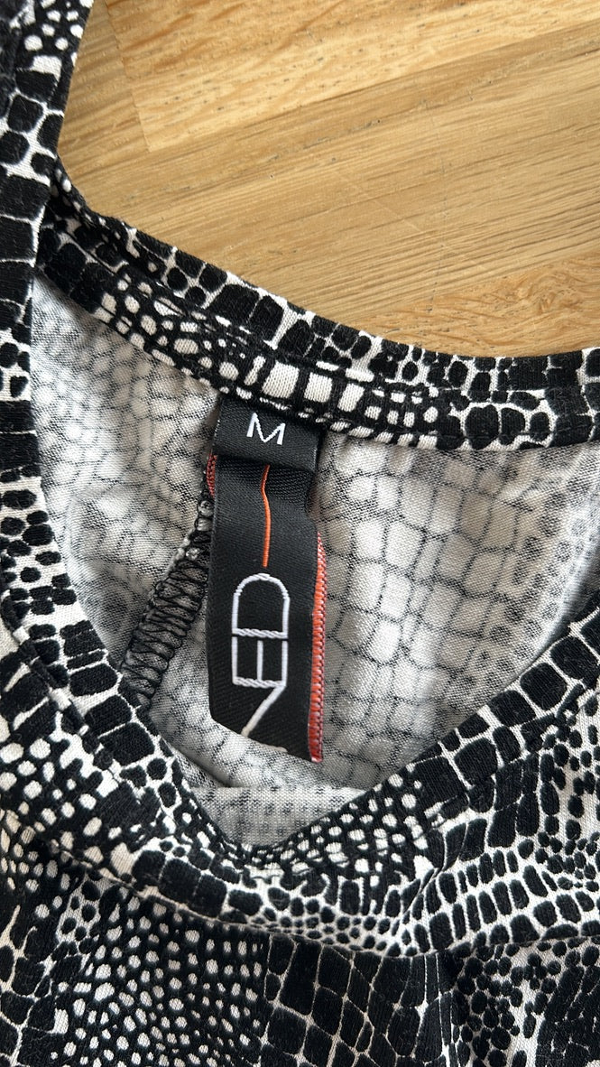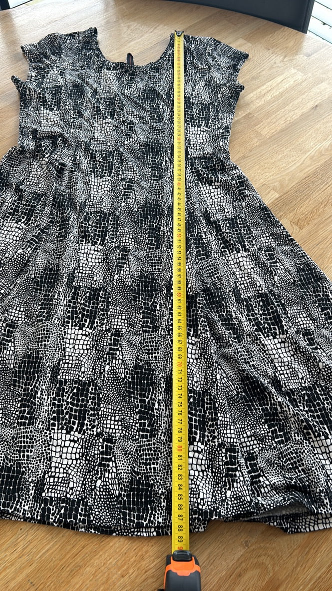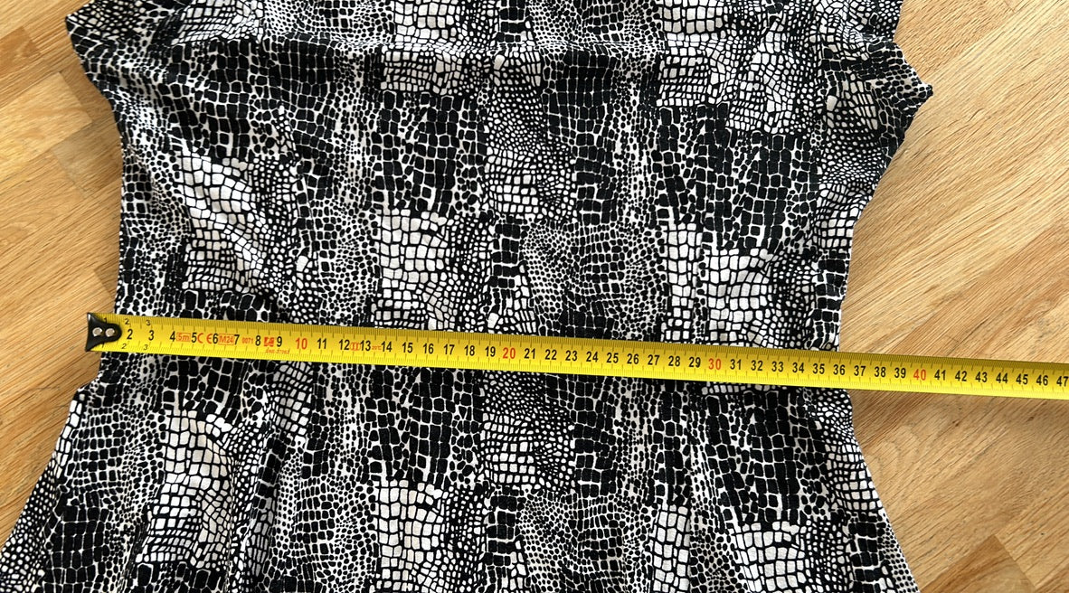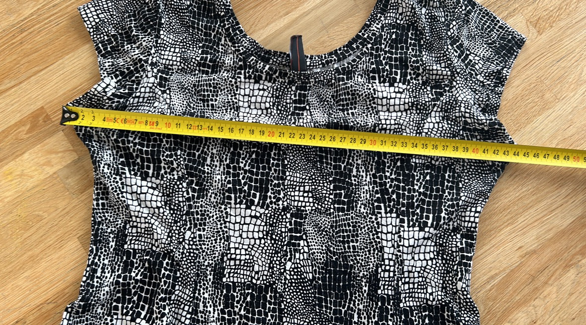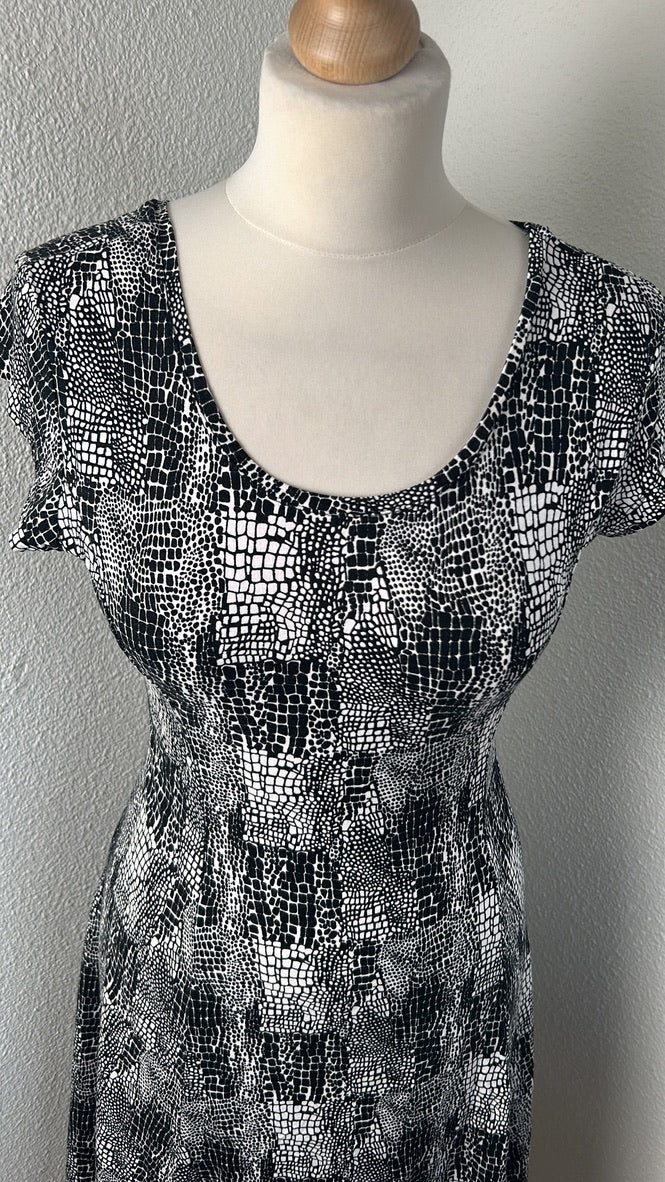 - Ronde halslijn, korte mouwen, getailleerd en uitlopende swing rok
