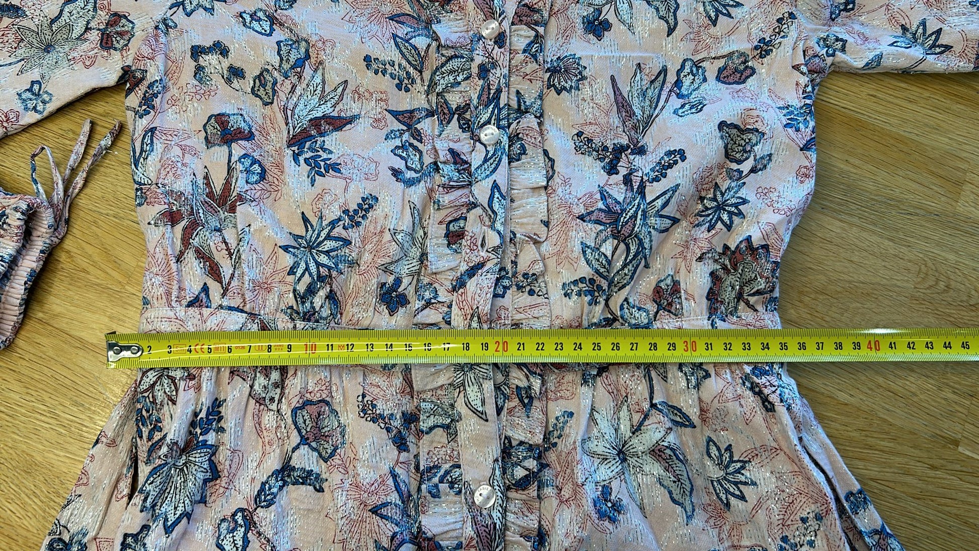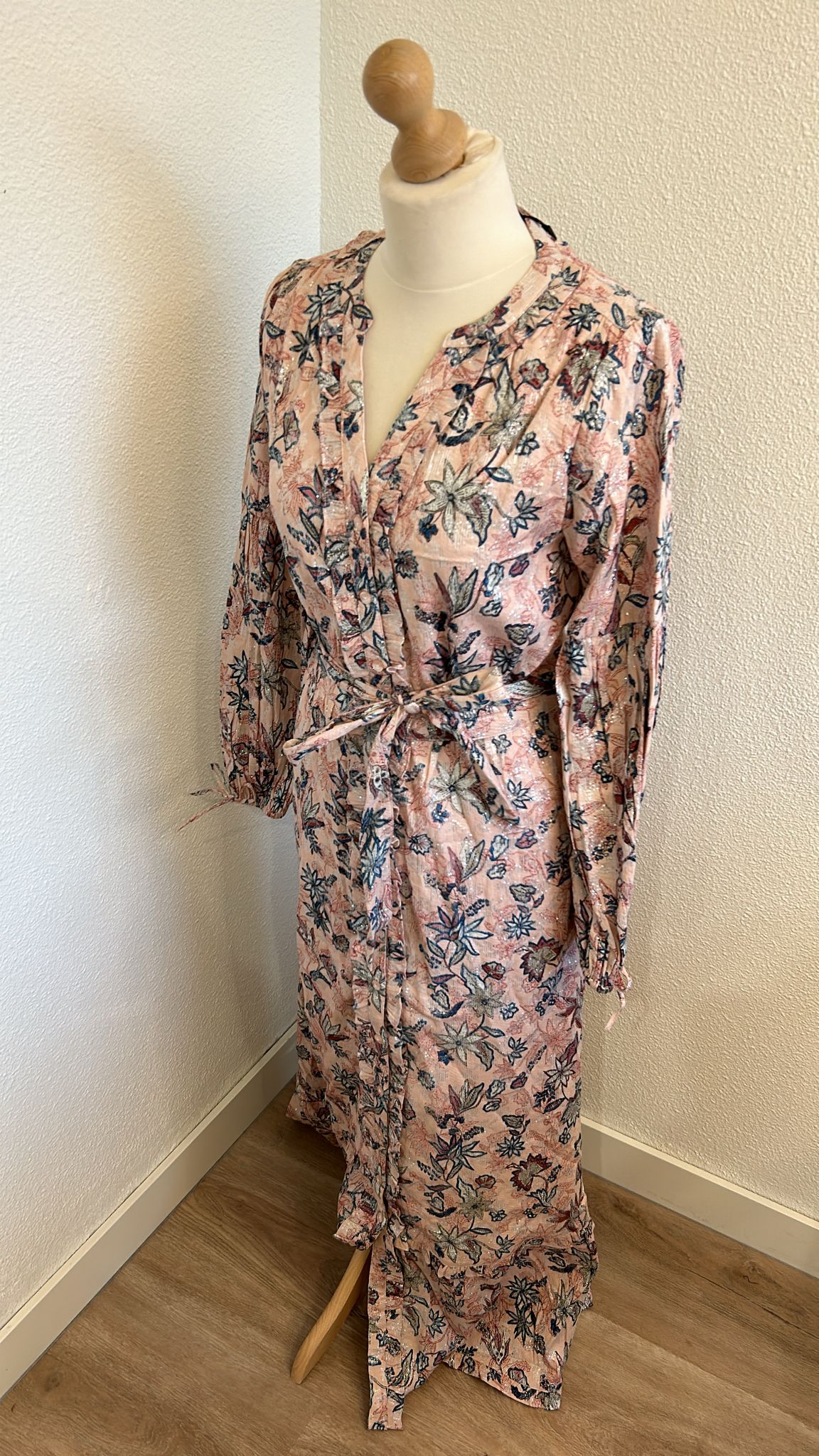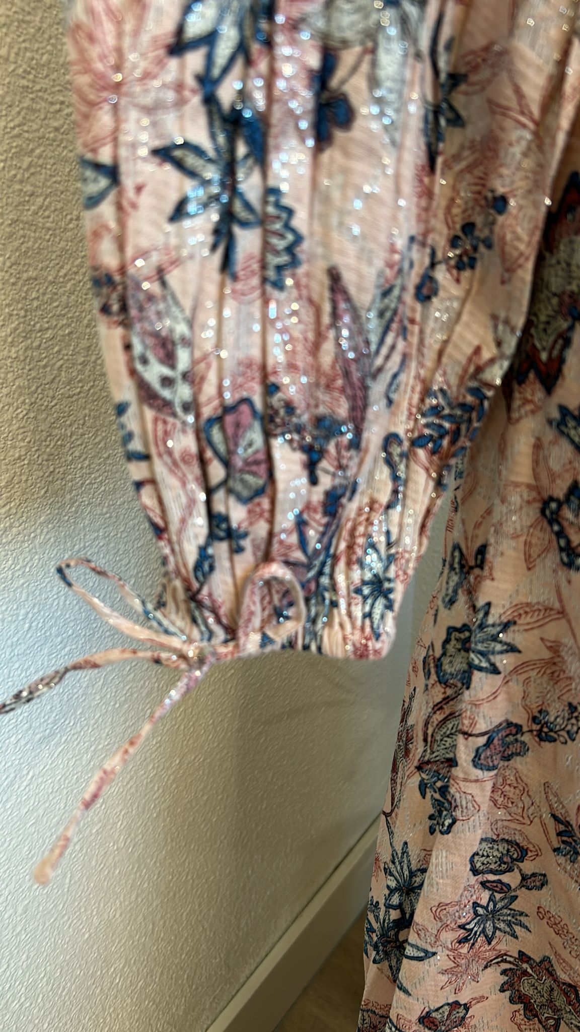 - Lichtroze met blauwe en creme bloemen print en zilveren glitter all-over door de stof verweven