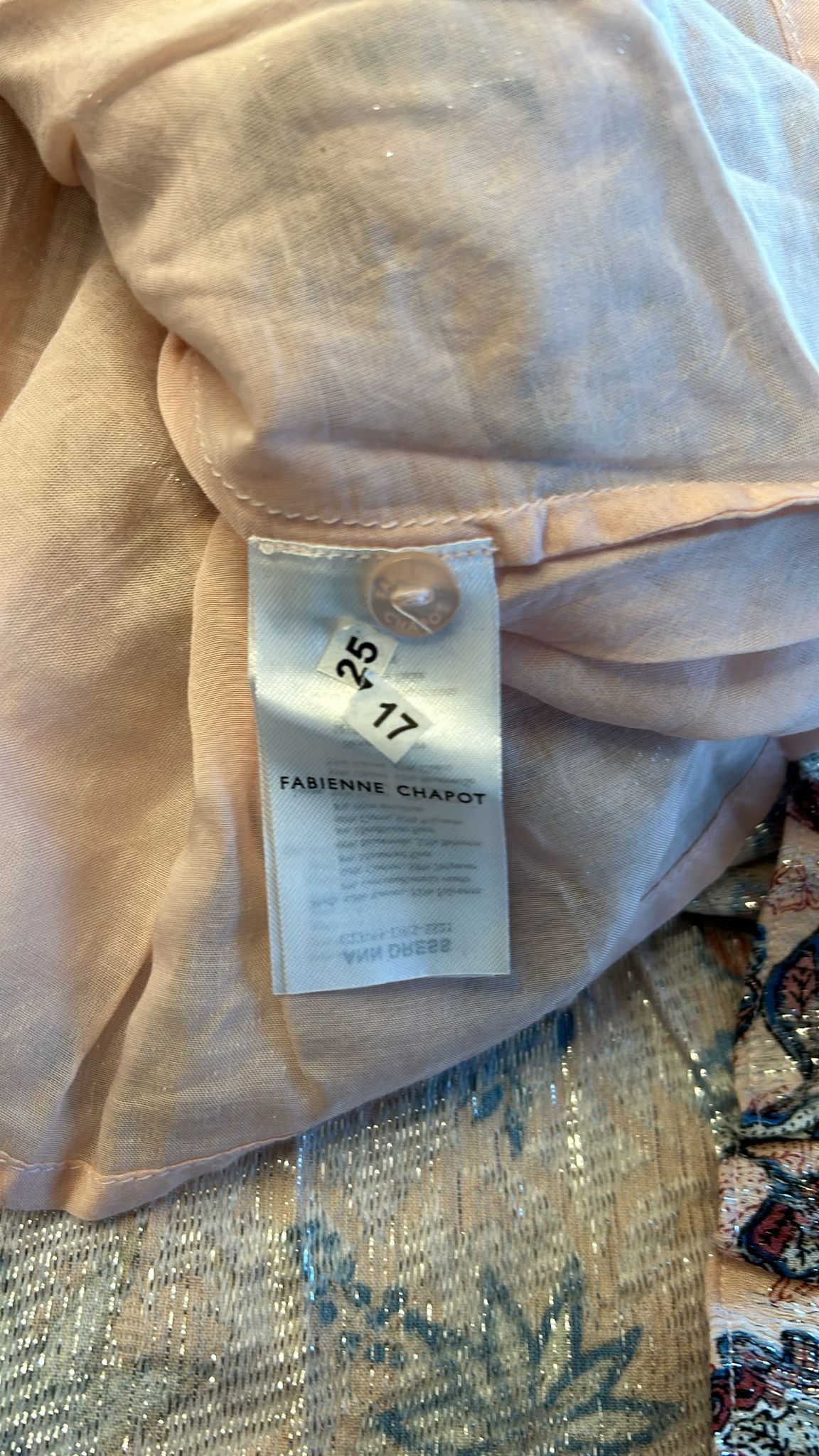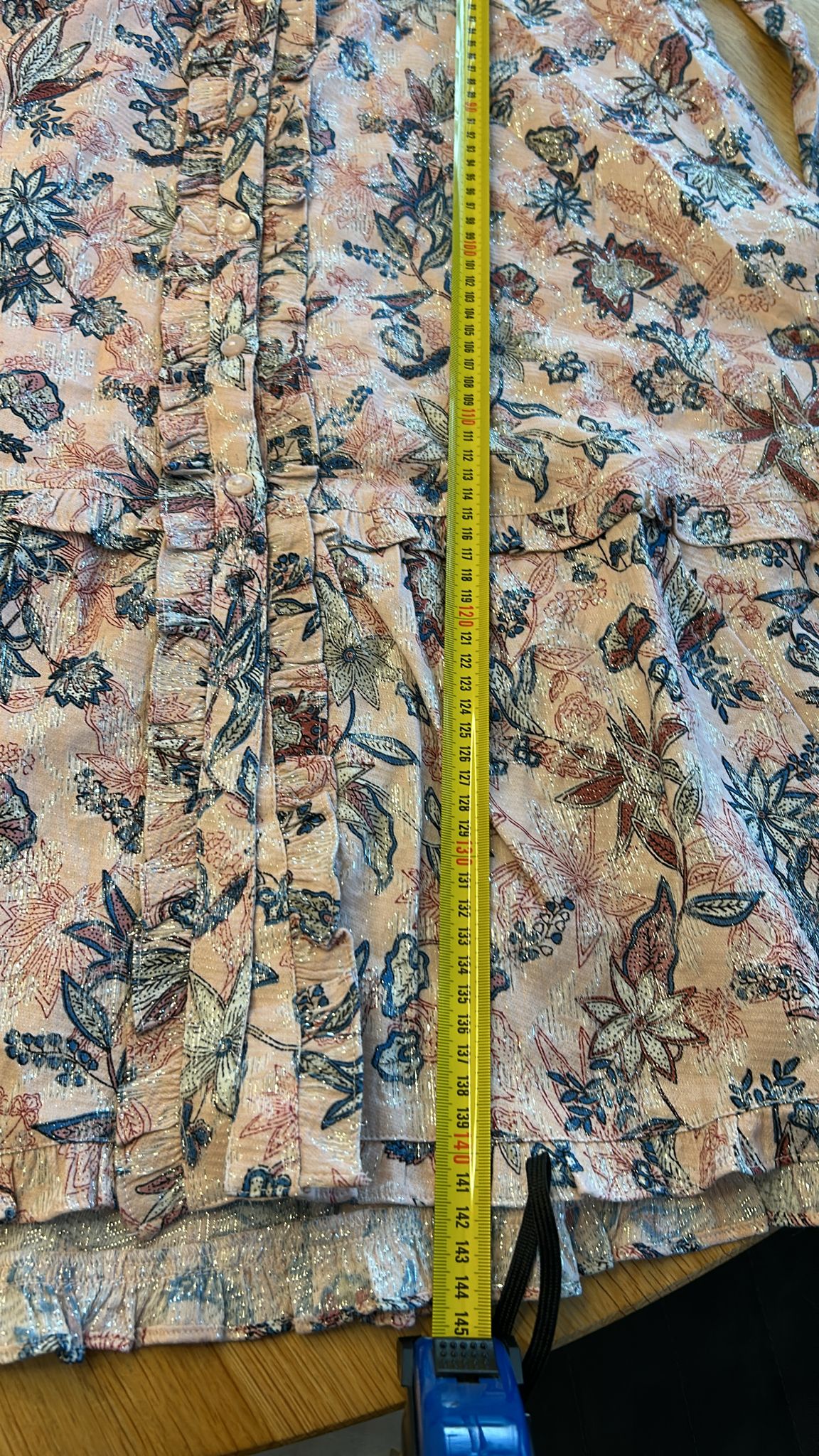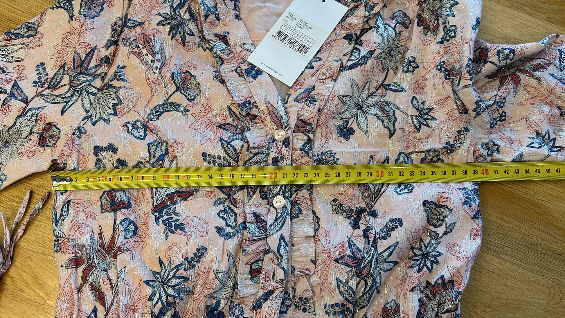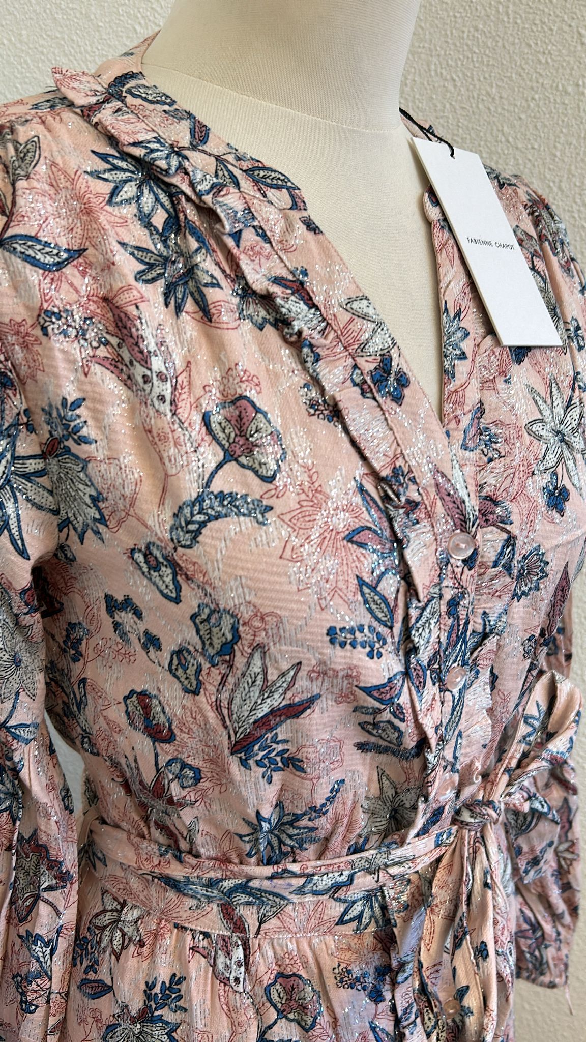 - Lichtroze met blauwe en creme bloemen print en zilveren glitter all-over door de stof verweven