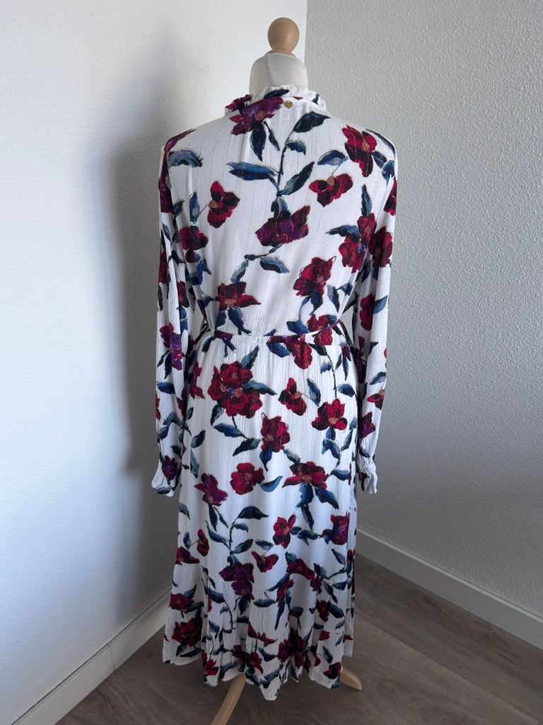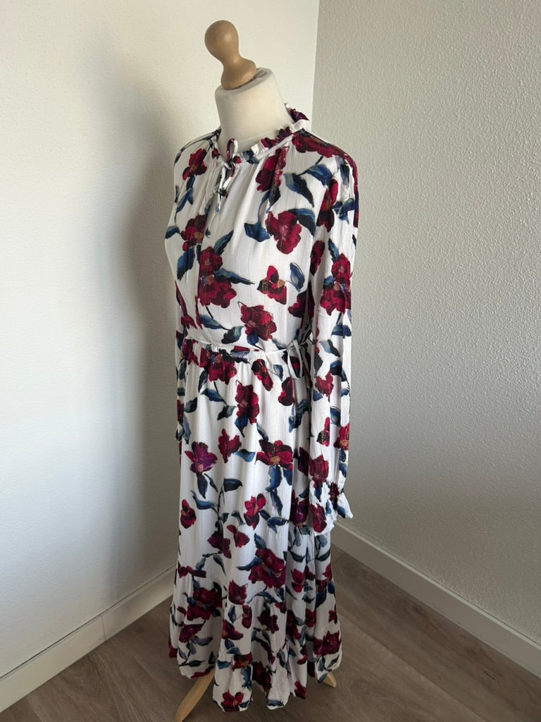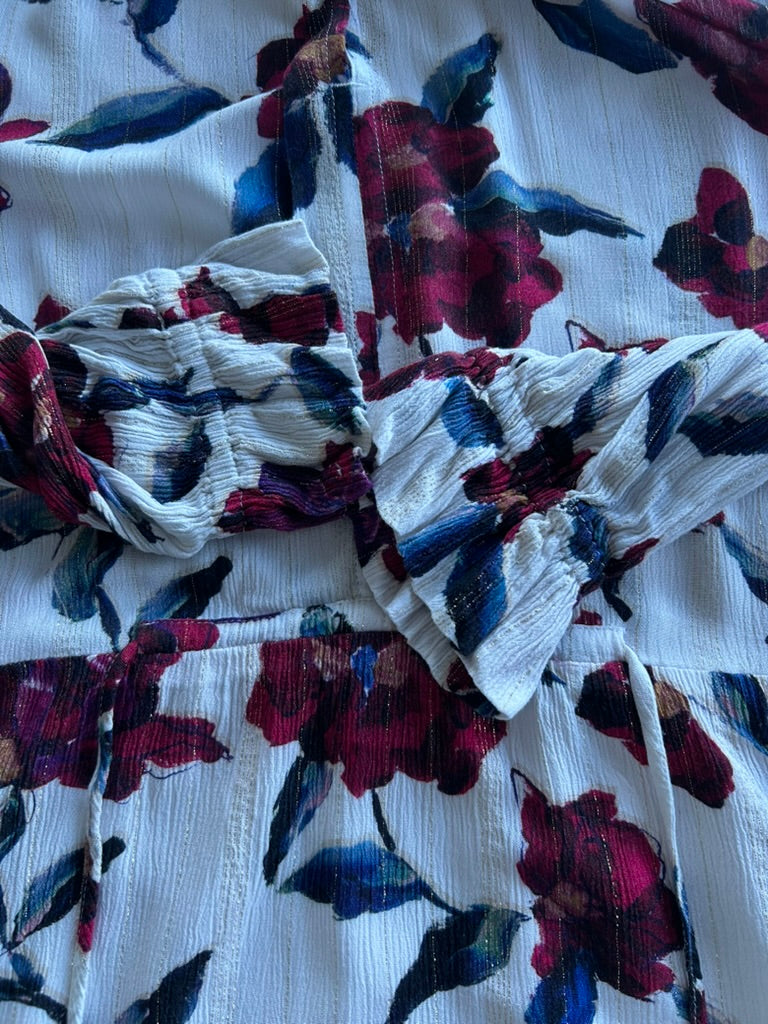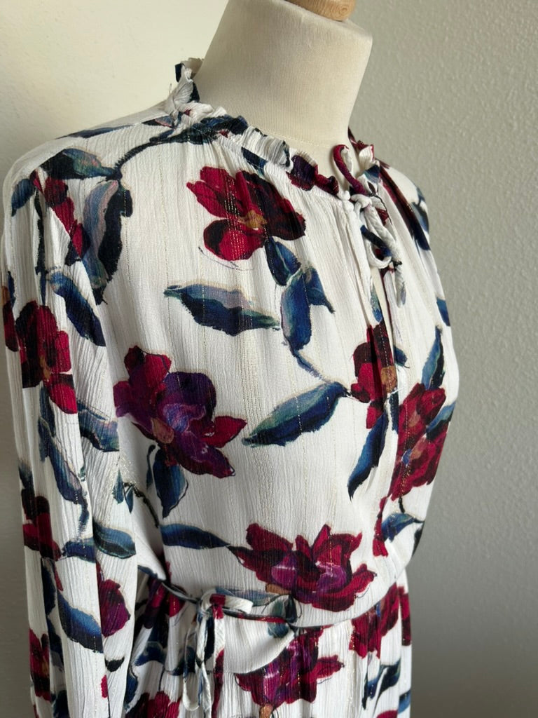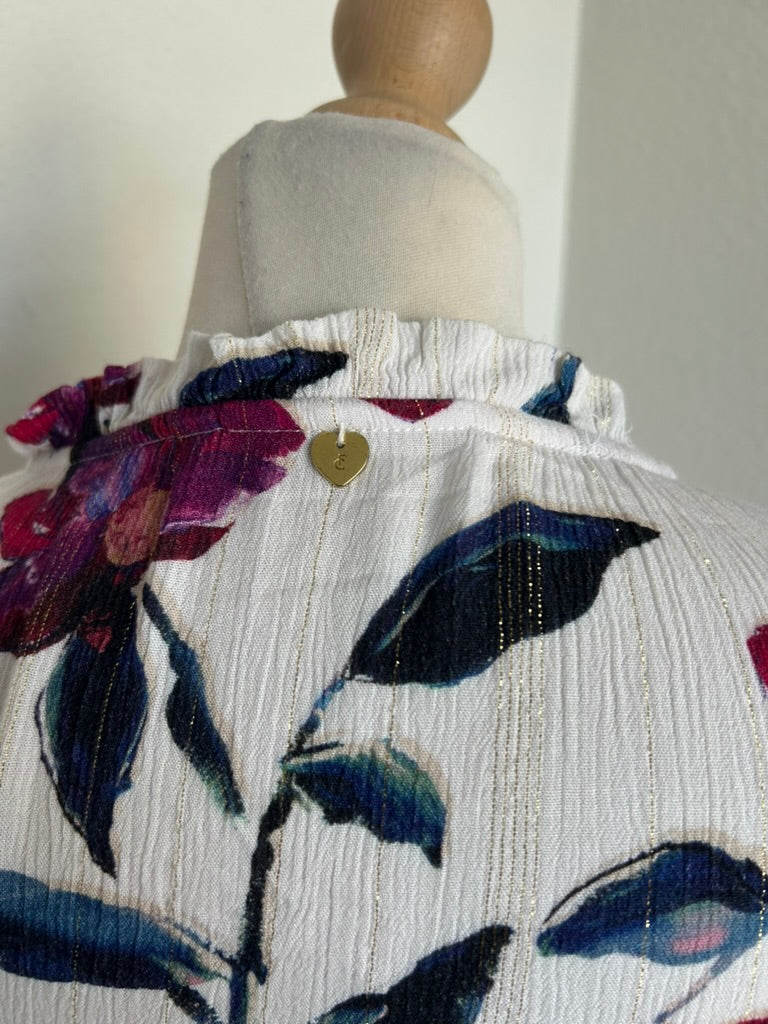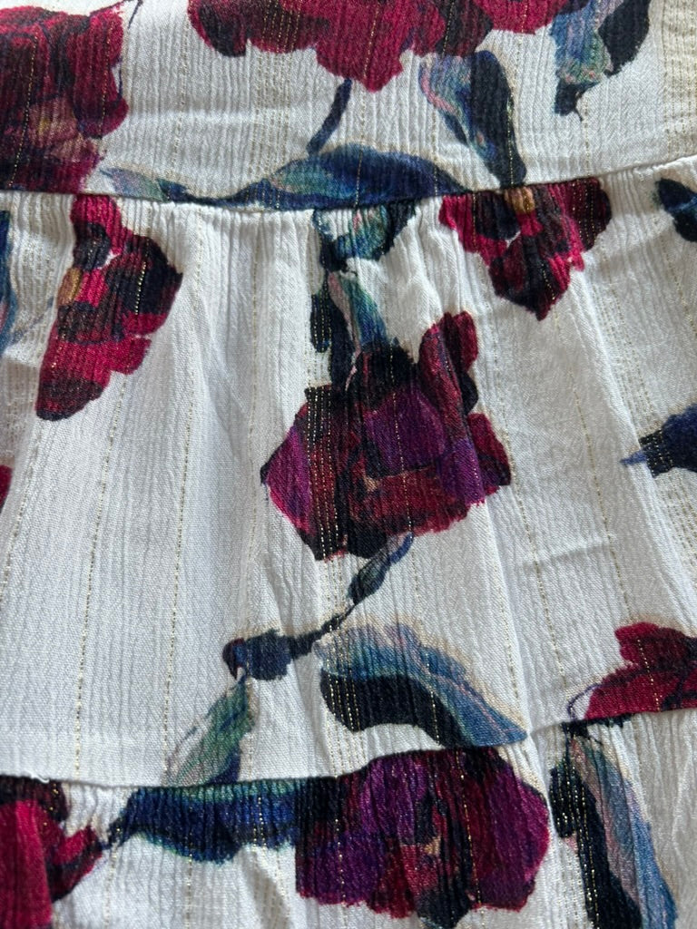 - Roze paarse wijnrode groene roze/bloemen print op witte achtergrond en subtiele gouden glitter in de stof