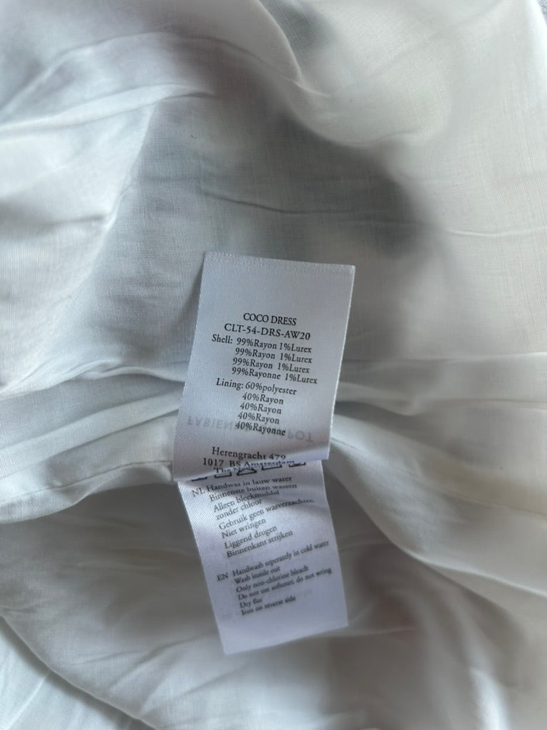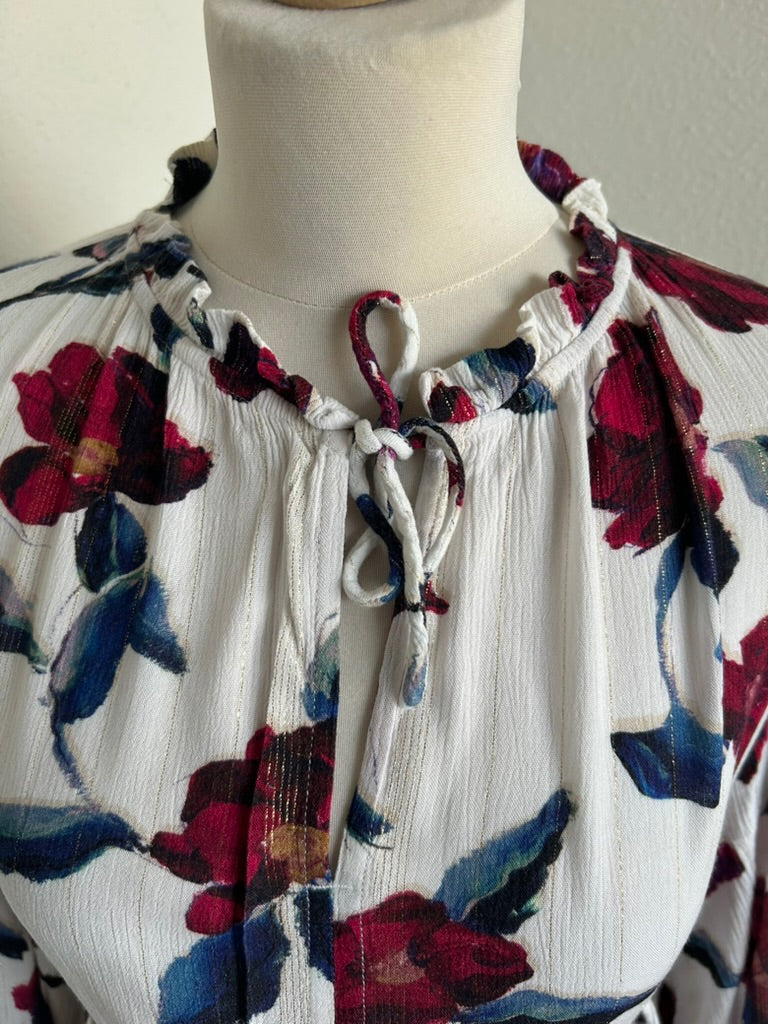 - Kraagje met striklintjes in de hals, lange mouwen, knooplintjes in de zijdes rond het middel, gouden details