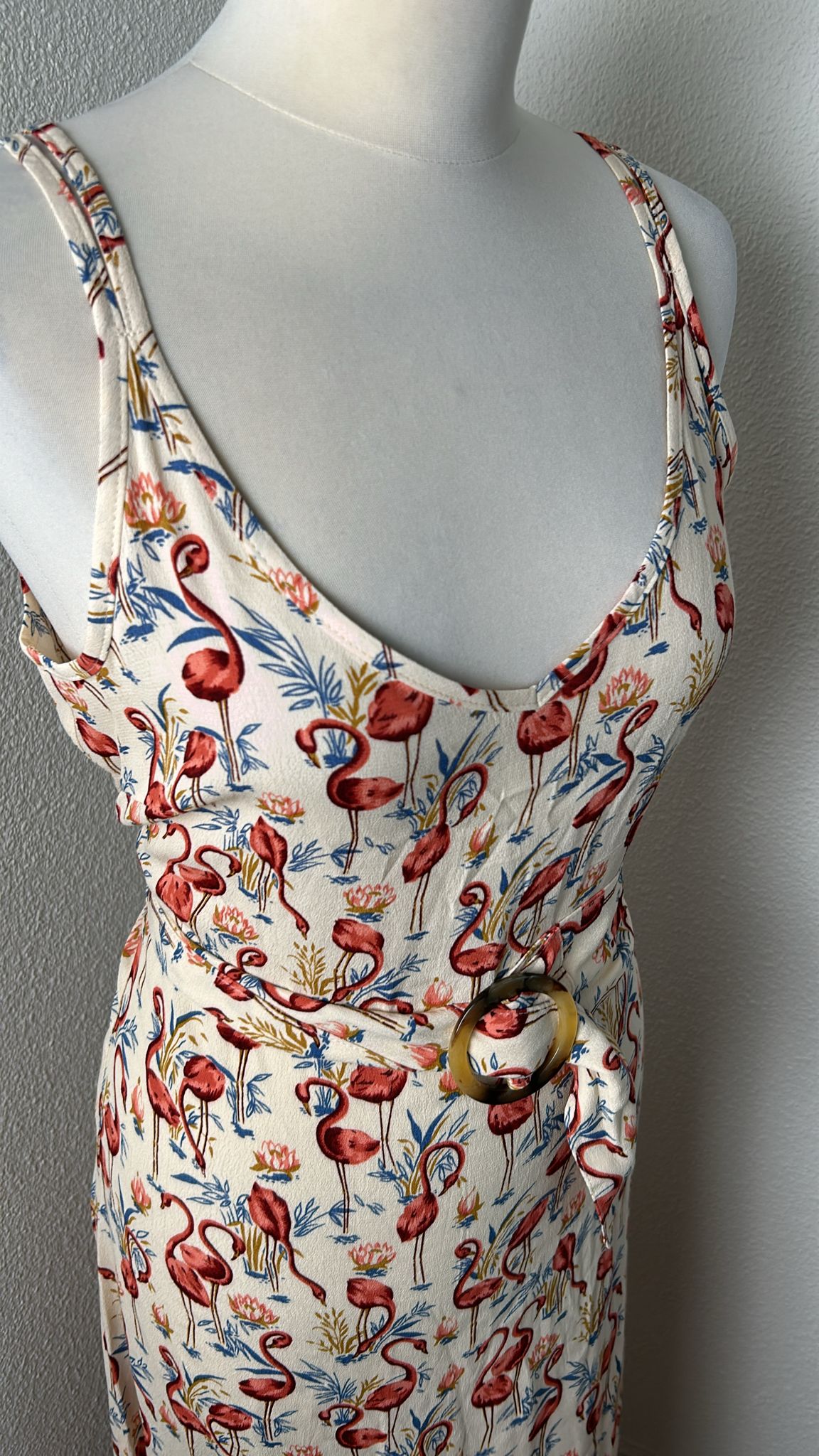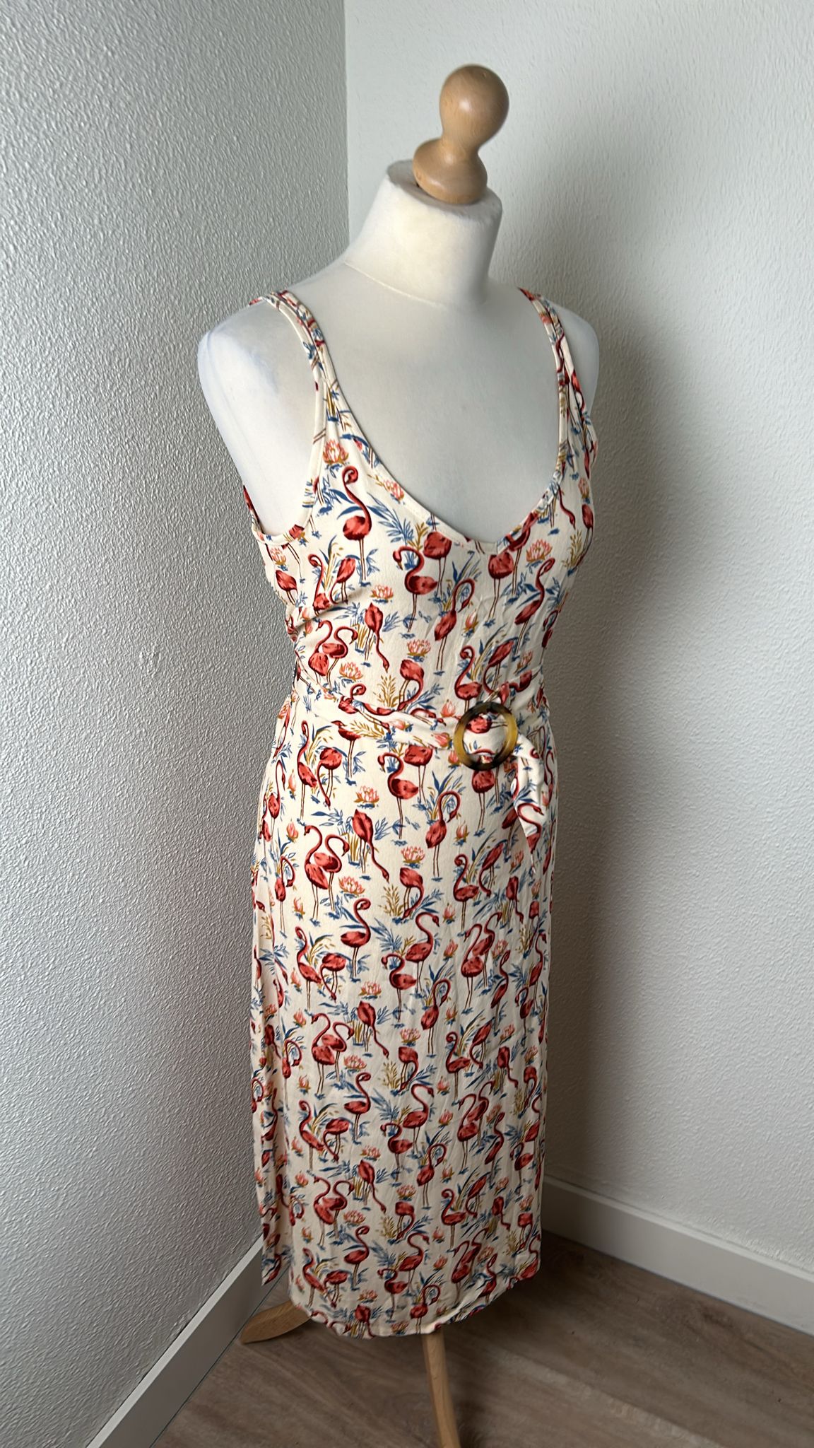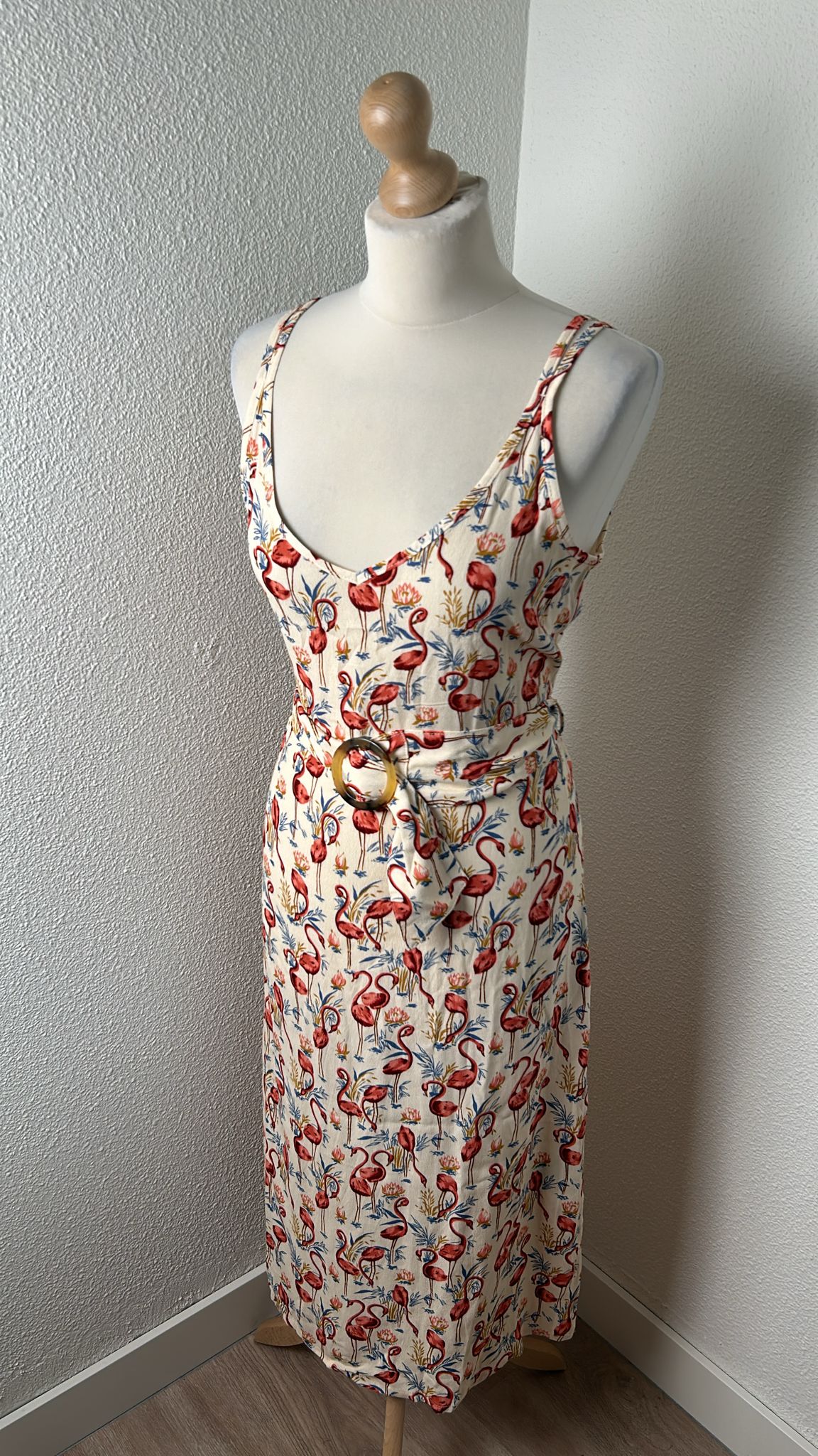 - Mooi halslijn, dubbele spaghetti bandjes, getailleerd met riem,