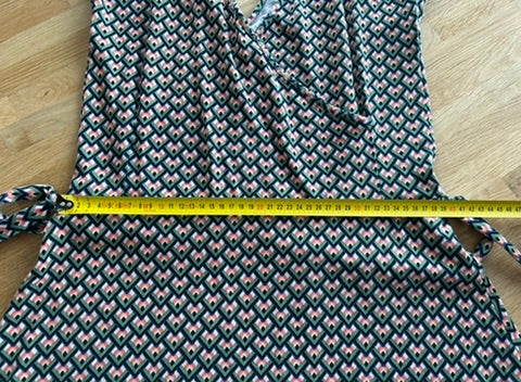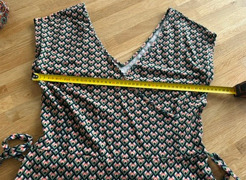 - V-hals met overslag, mouwloos model, knooplint rond het middel