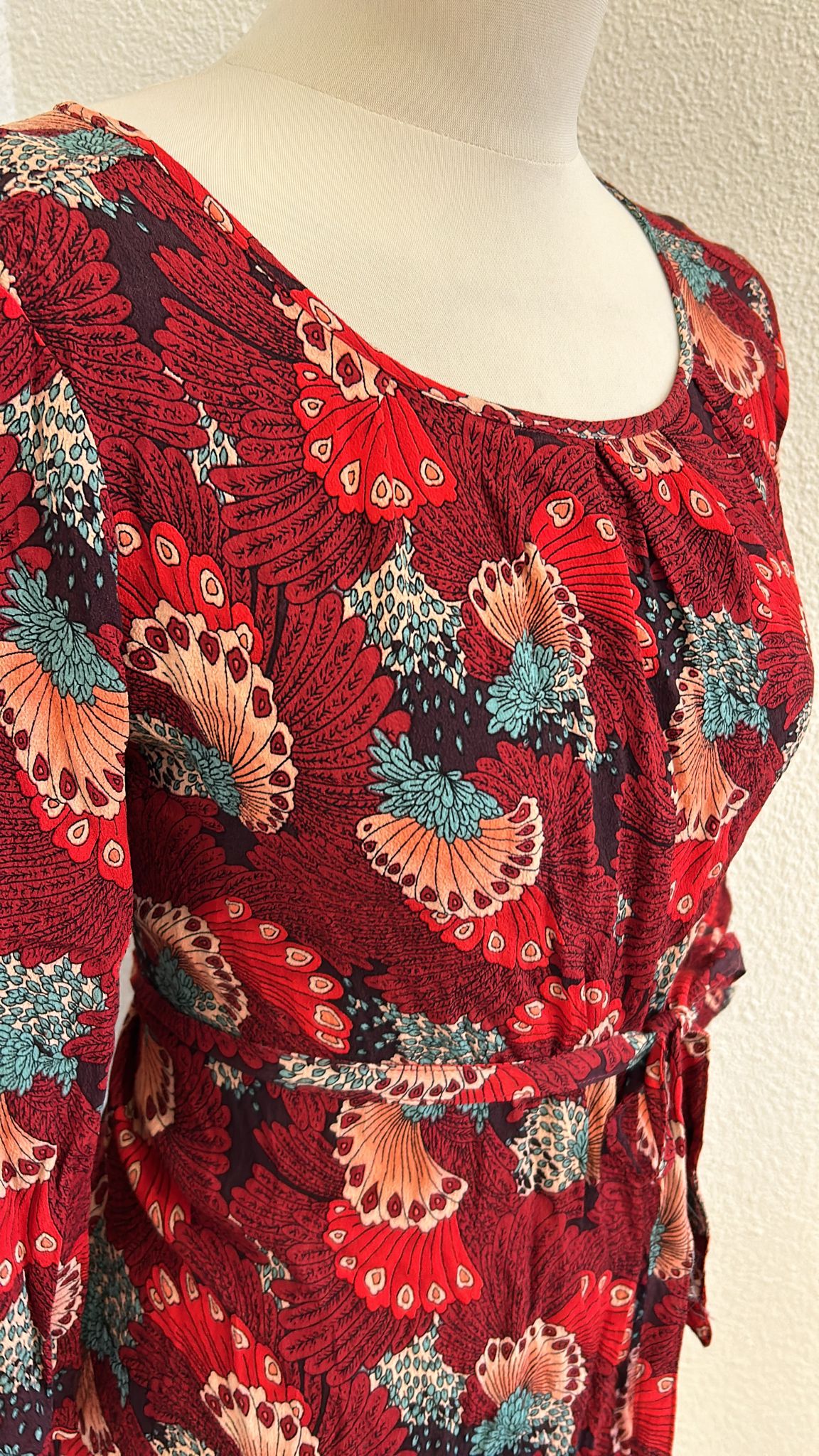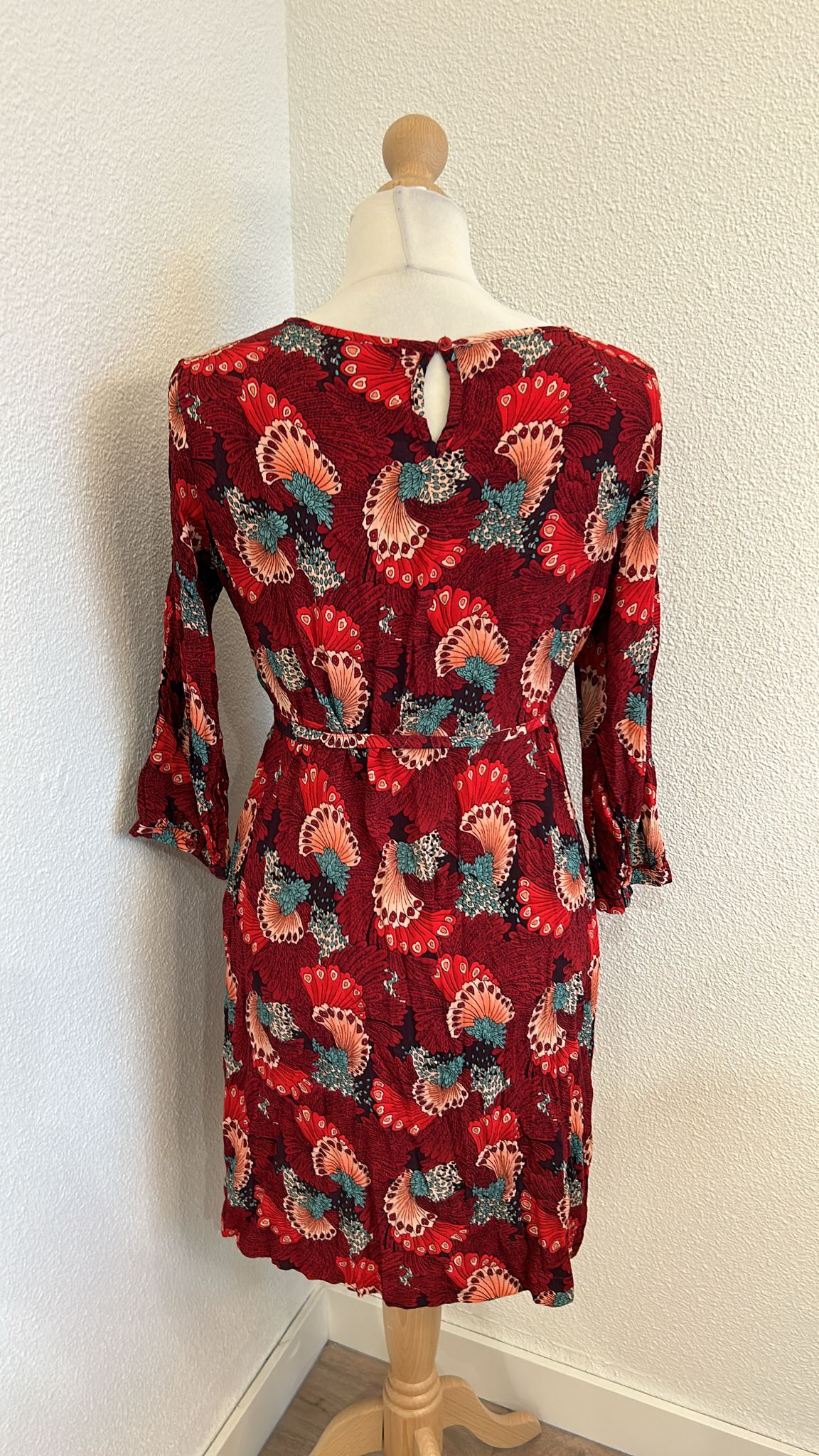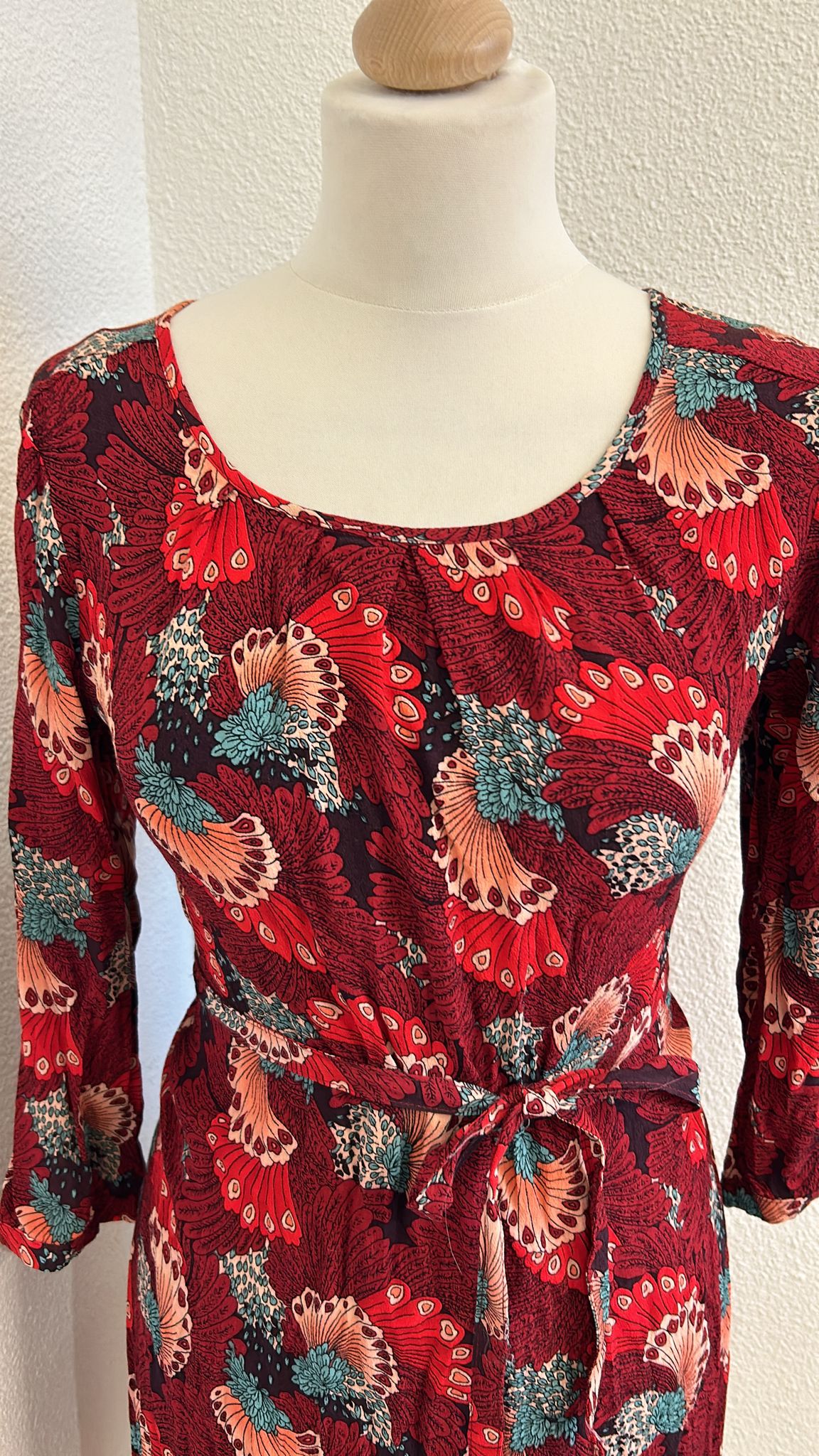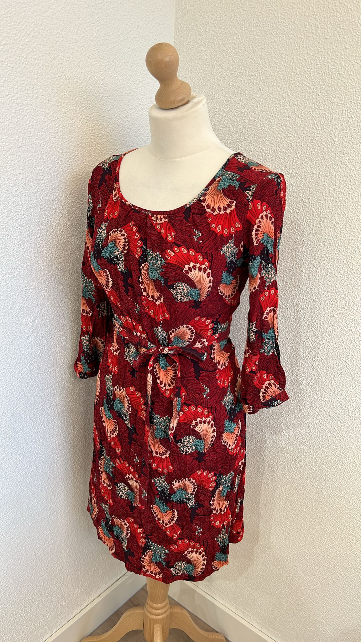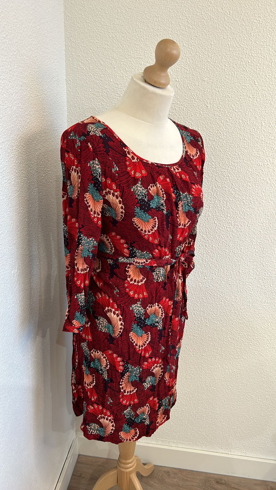 - Wijnrood jurkje met rode roze en blauwe pauwen/waaier print
