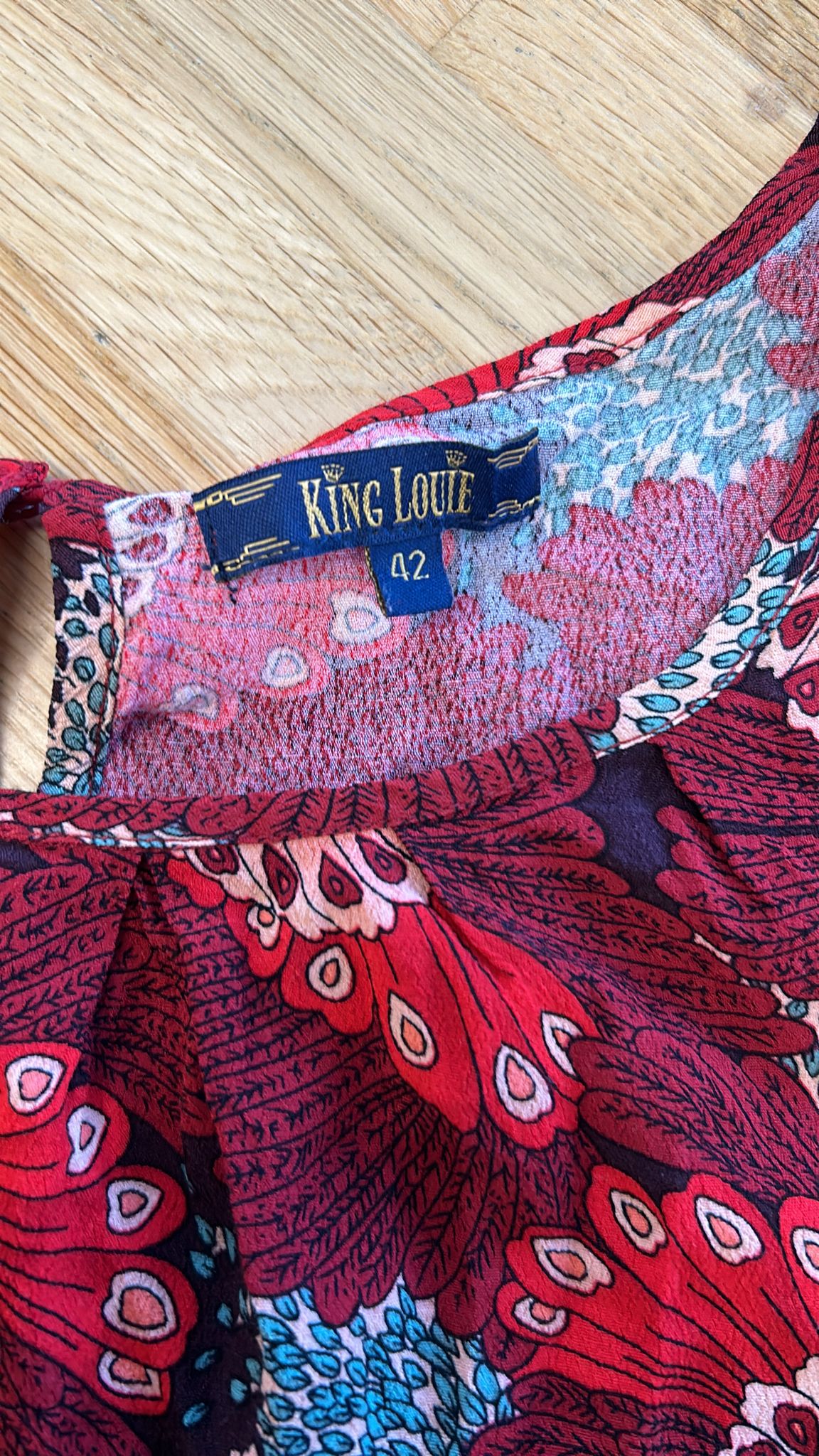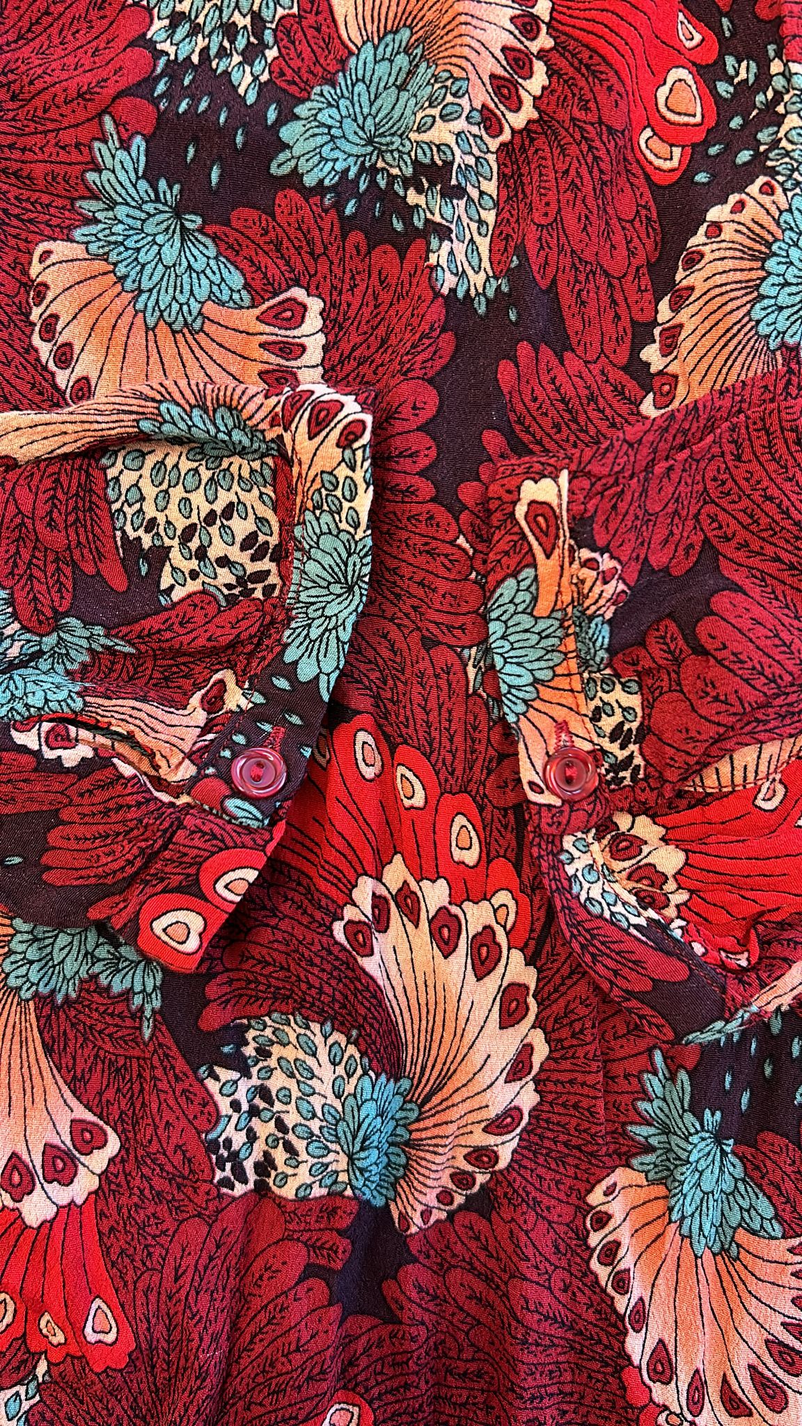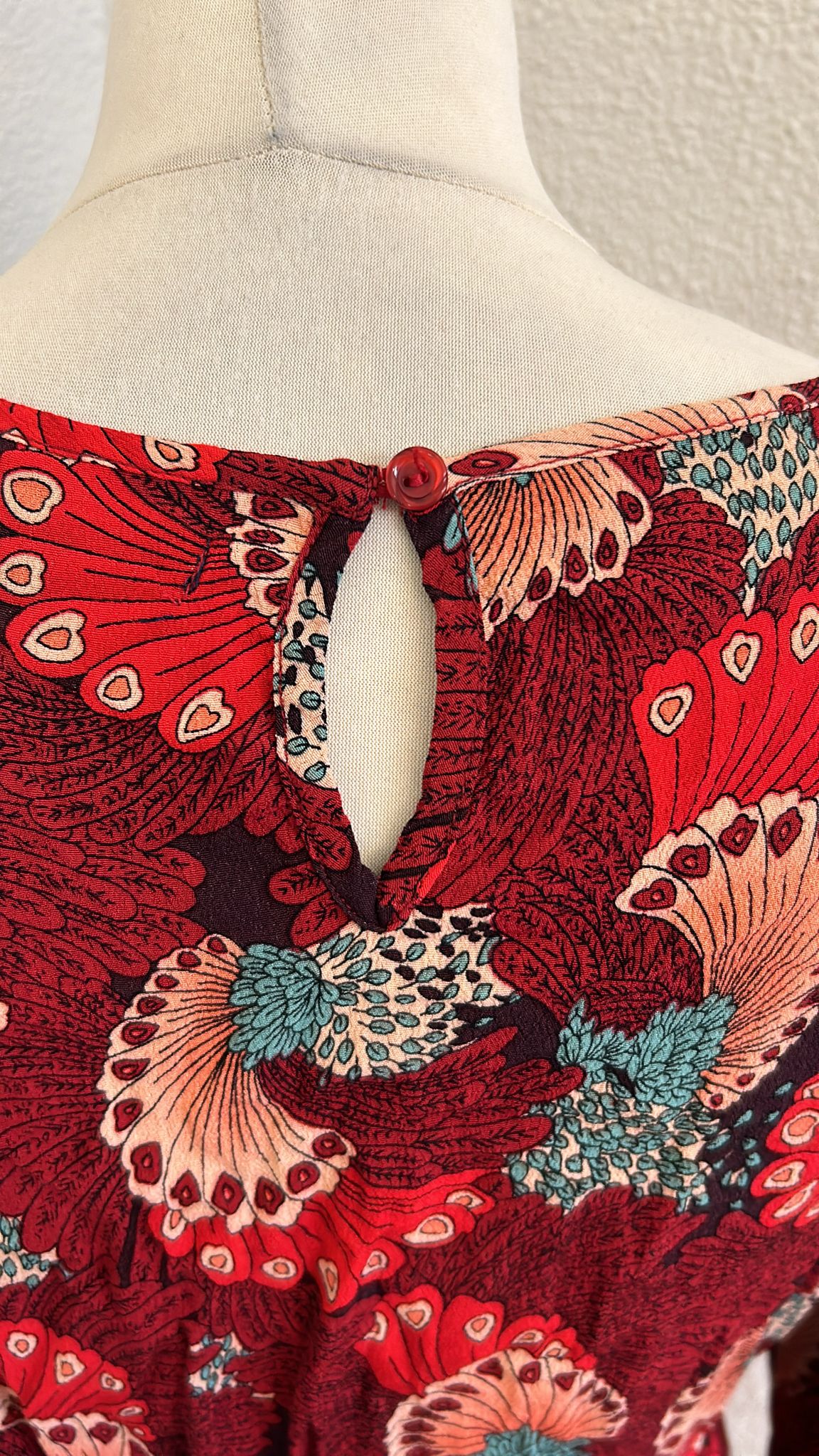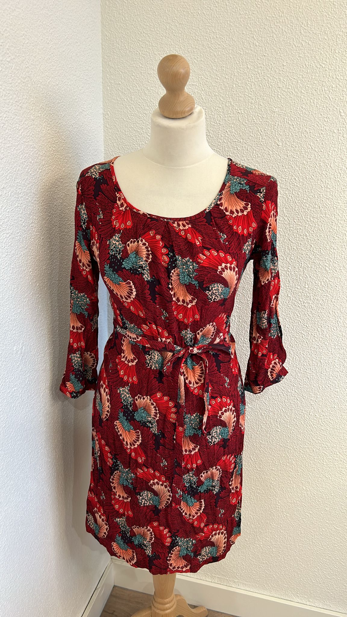 - Wijnrood jurkje met rode roze en blauwe pauwen/waaier print