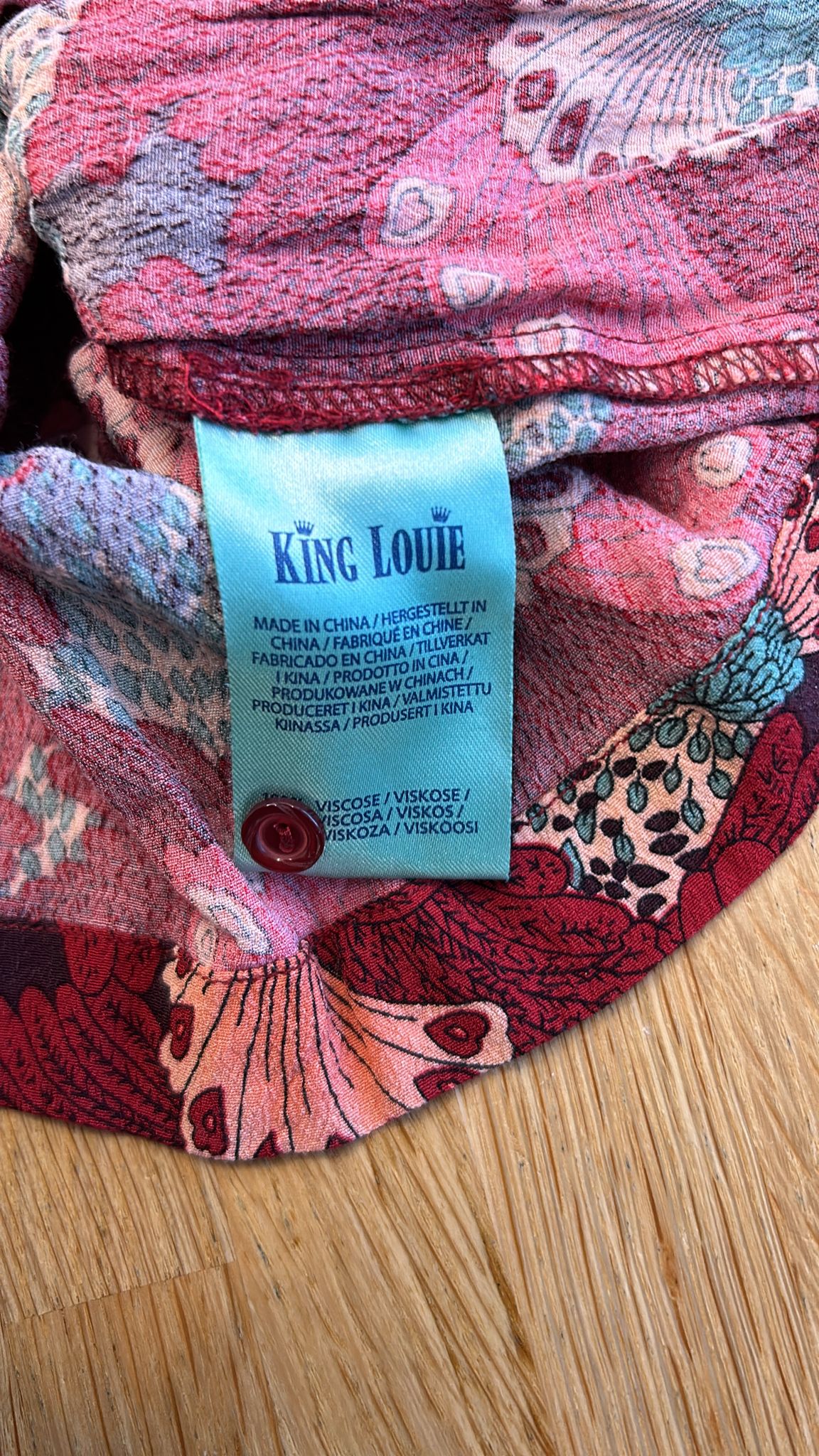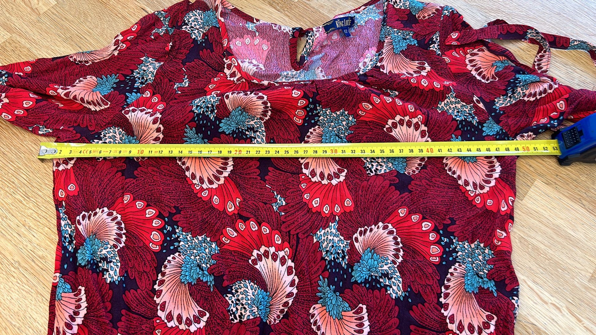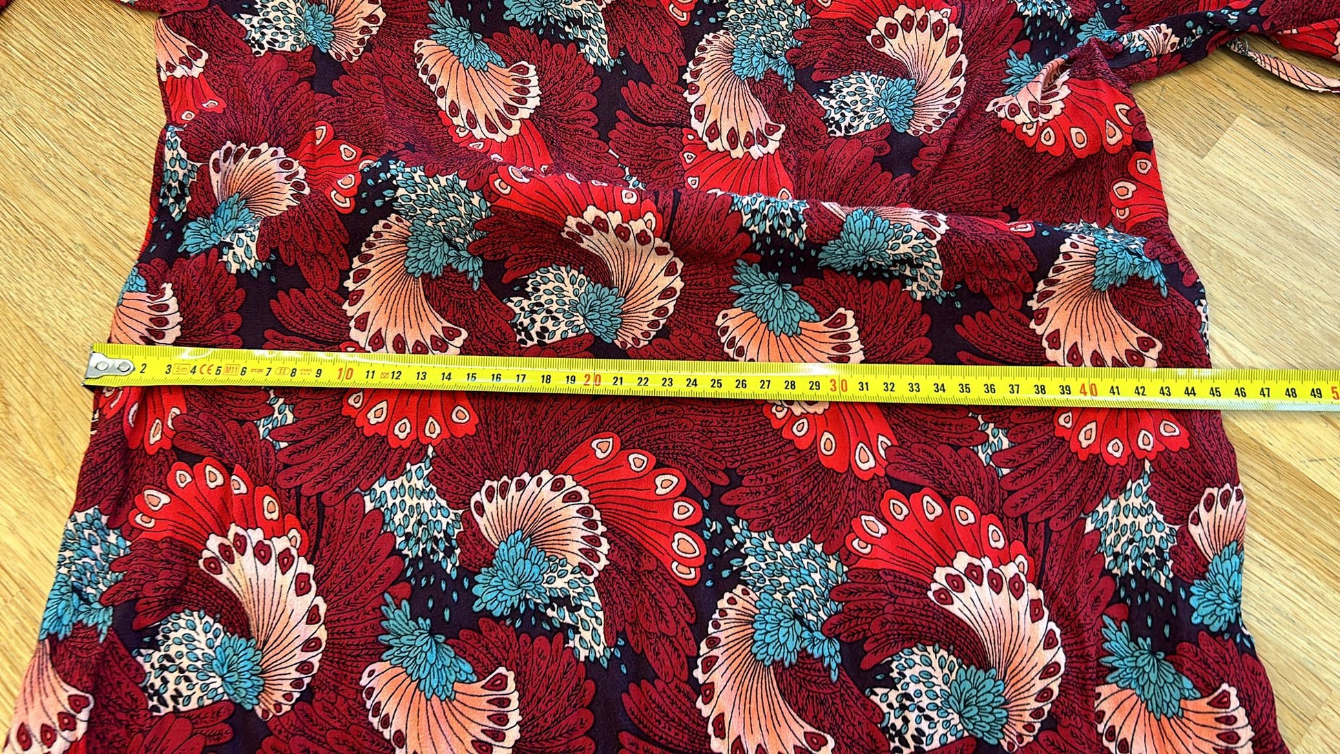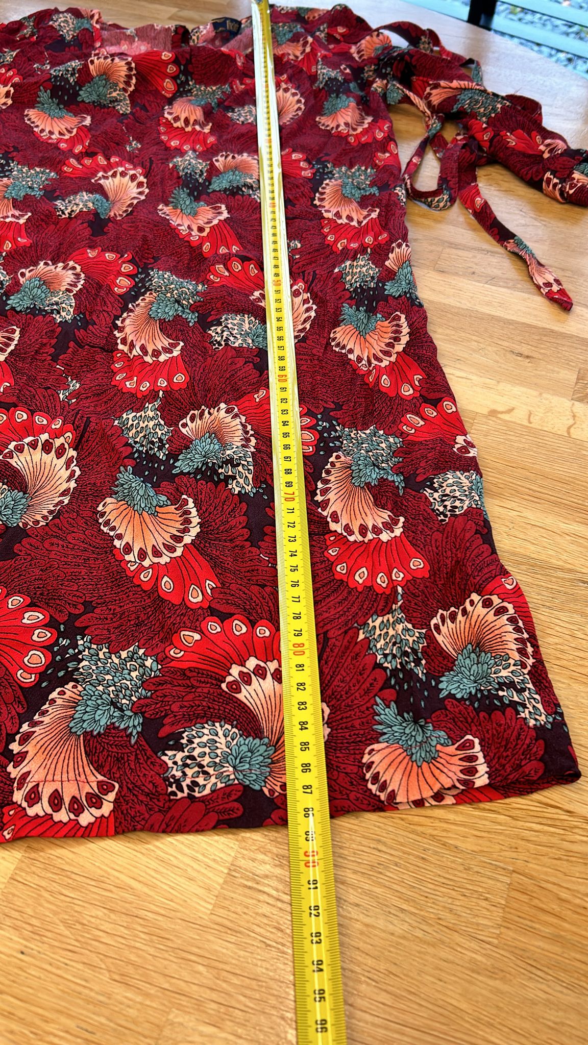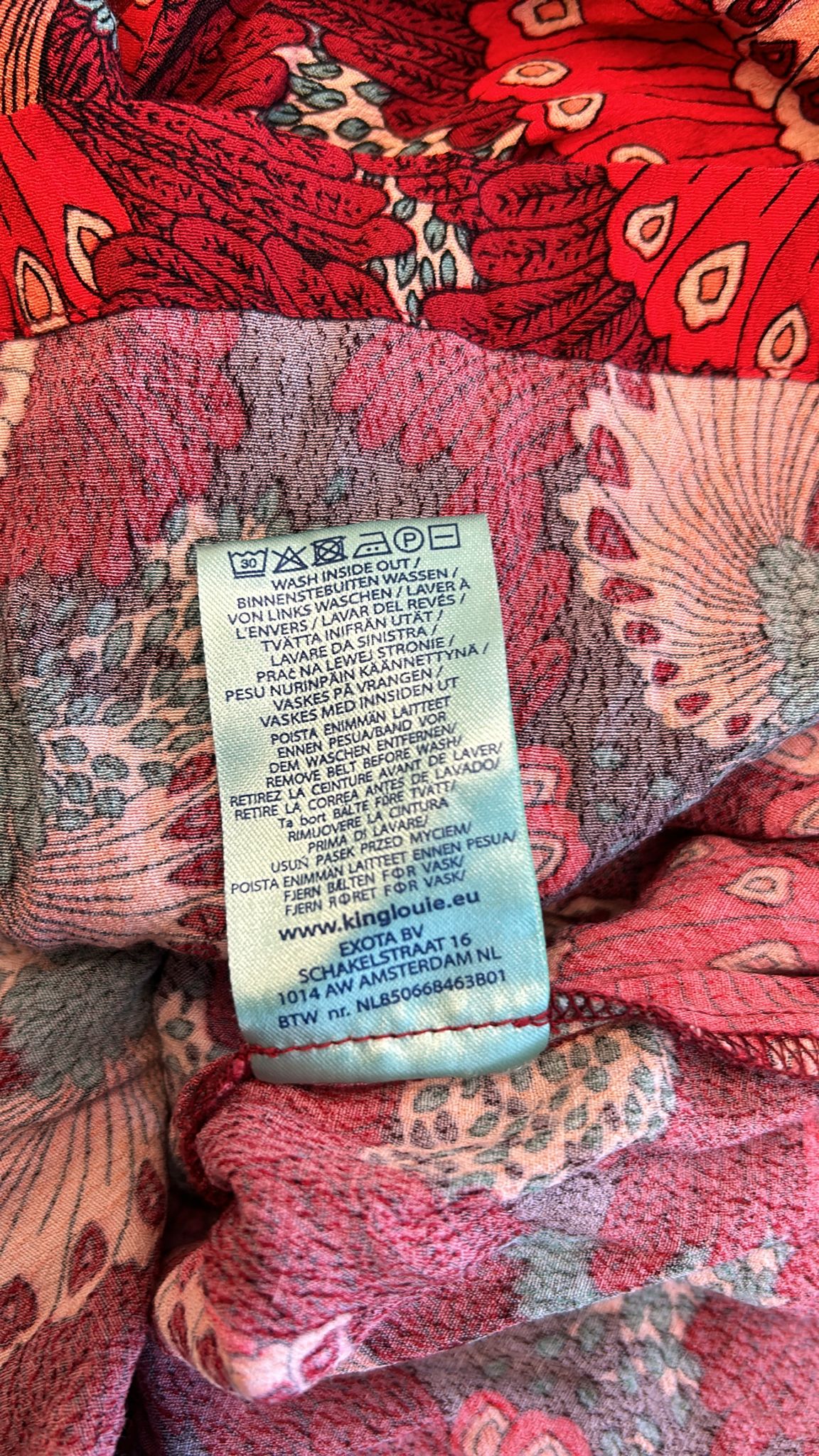 - Wijnrood jurkje met rode roze en blauwe pauwen/waaier print
