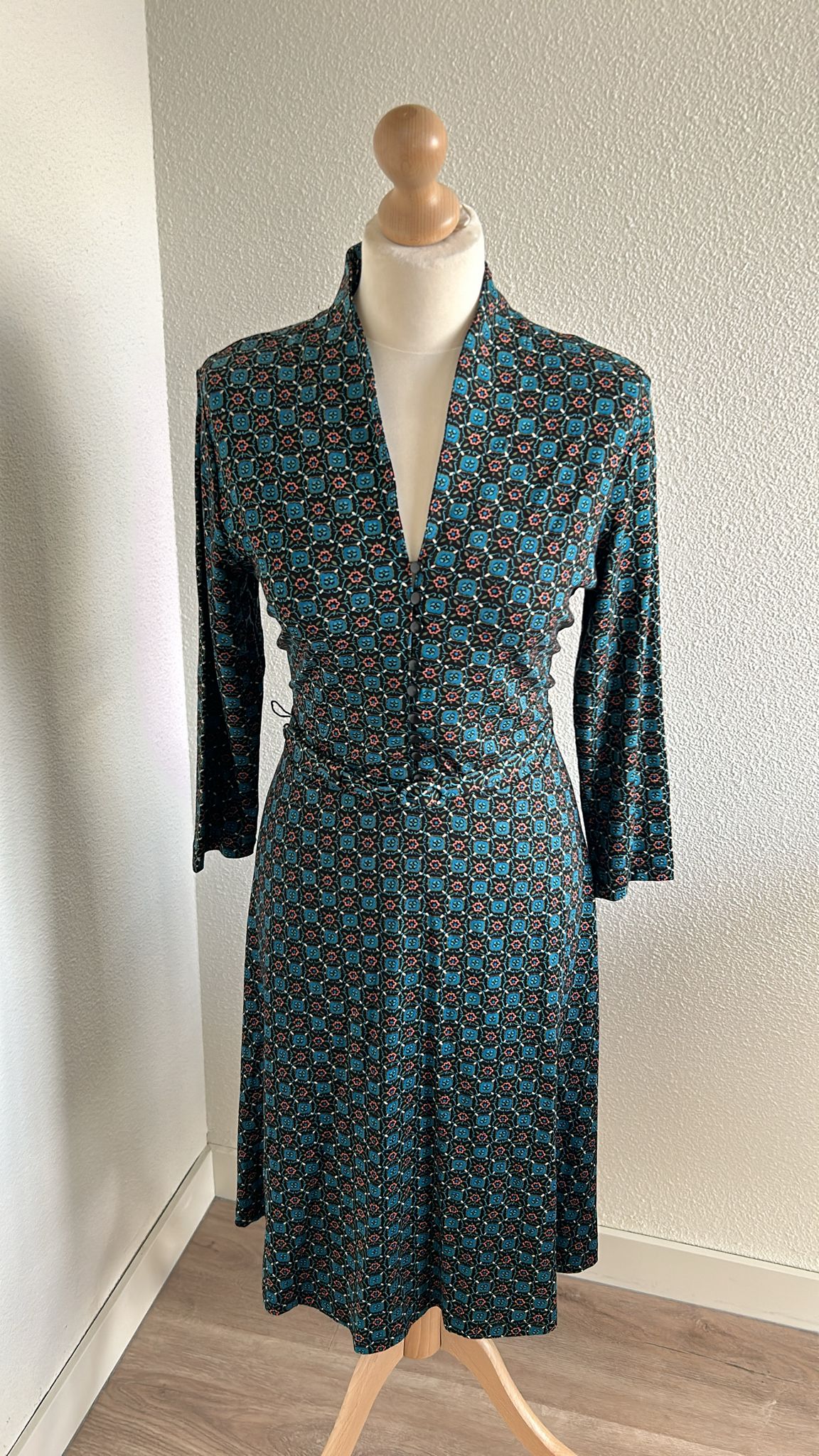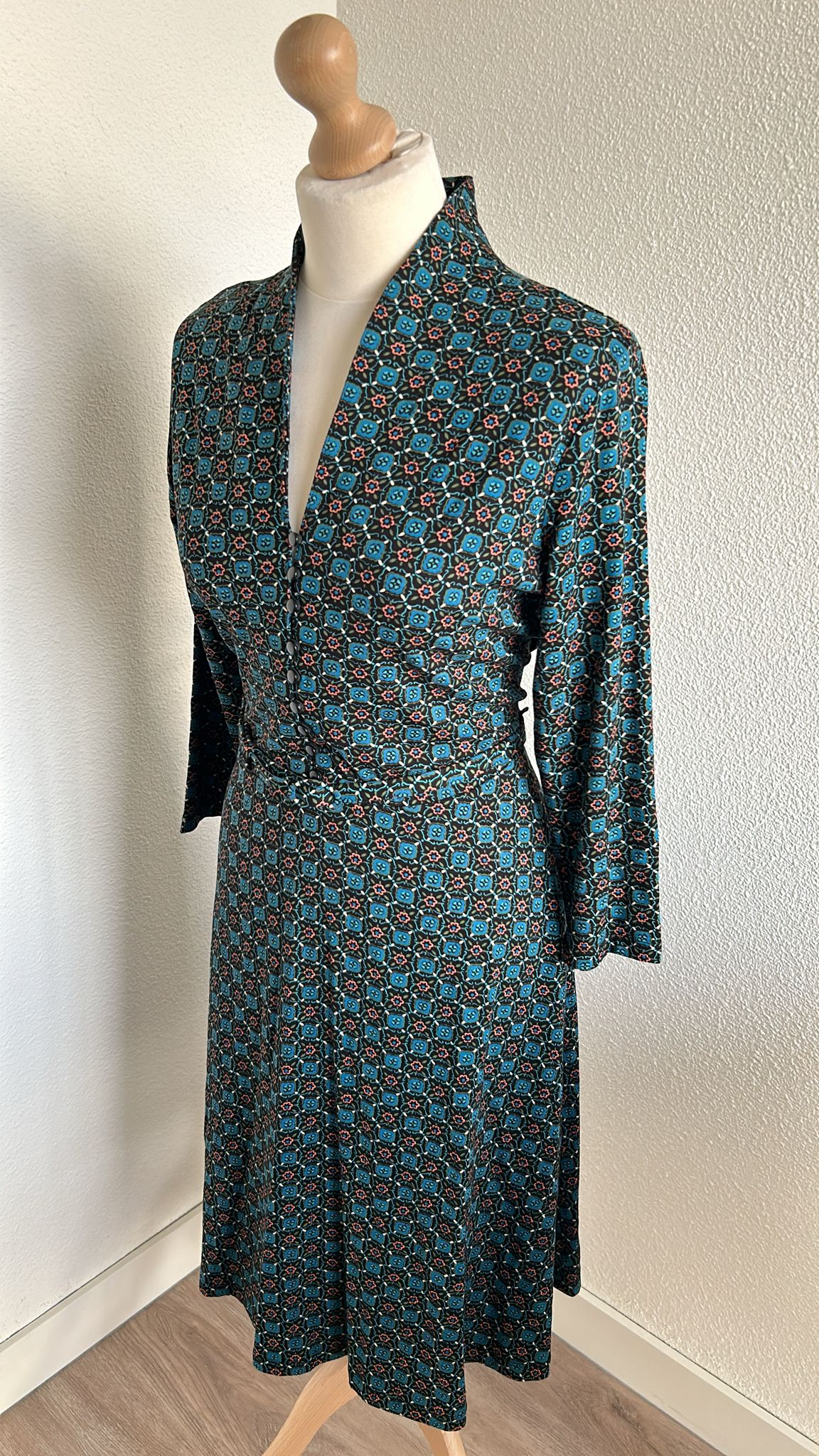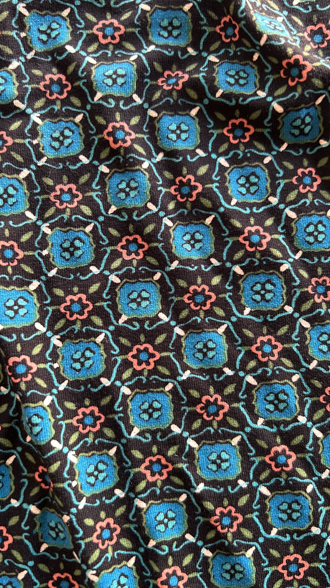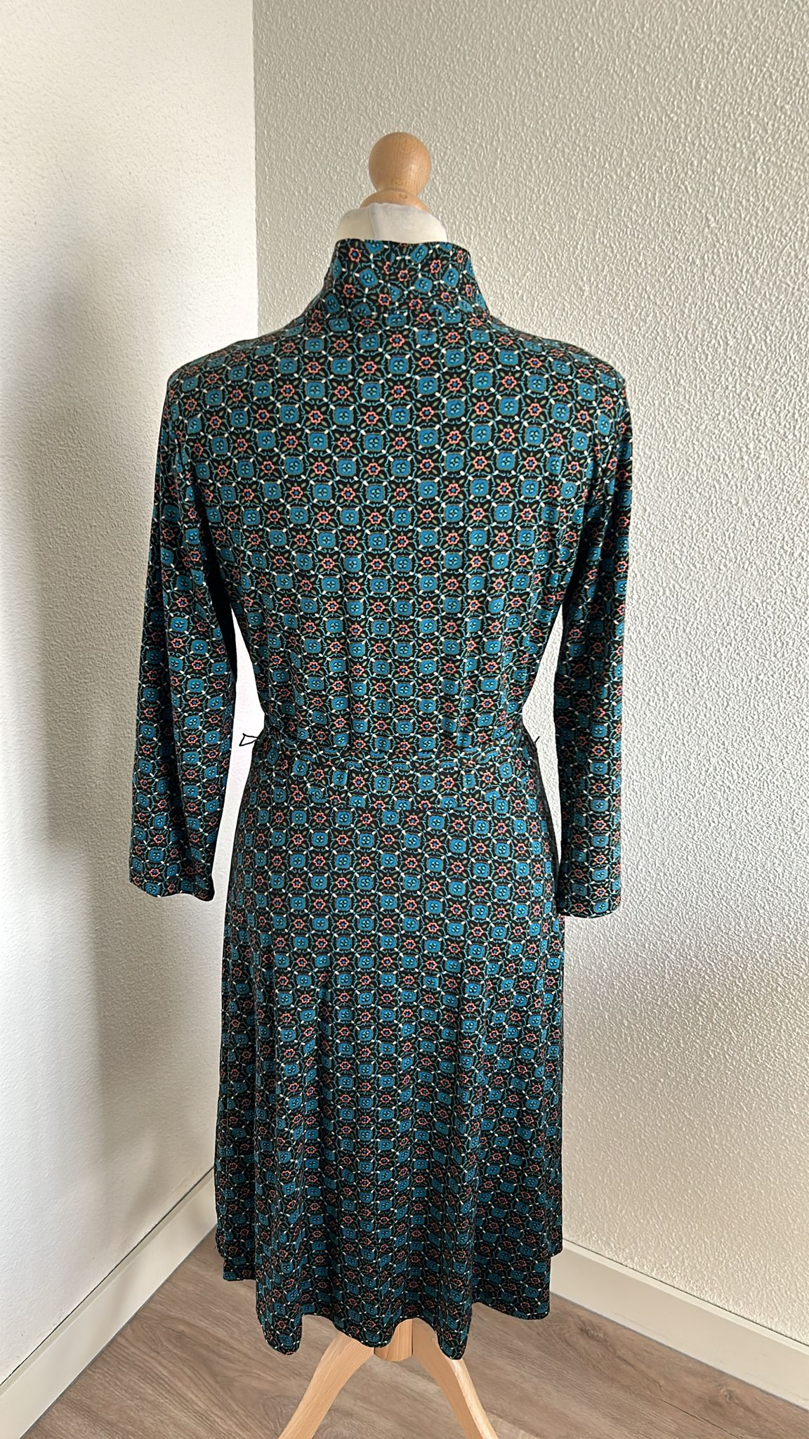 - Zwart met blauwe, creme wit en wijnrode retro print