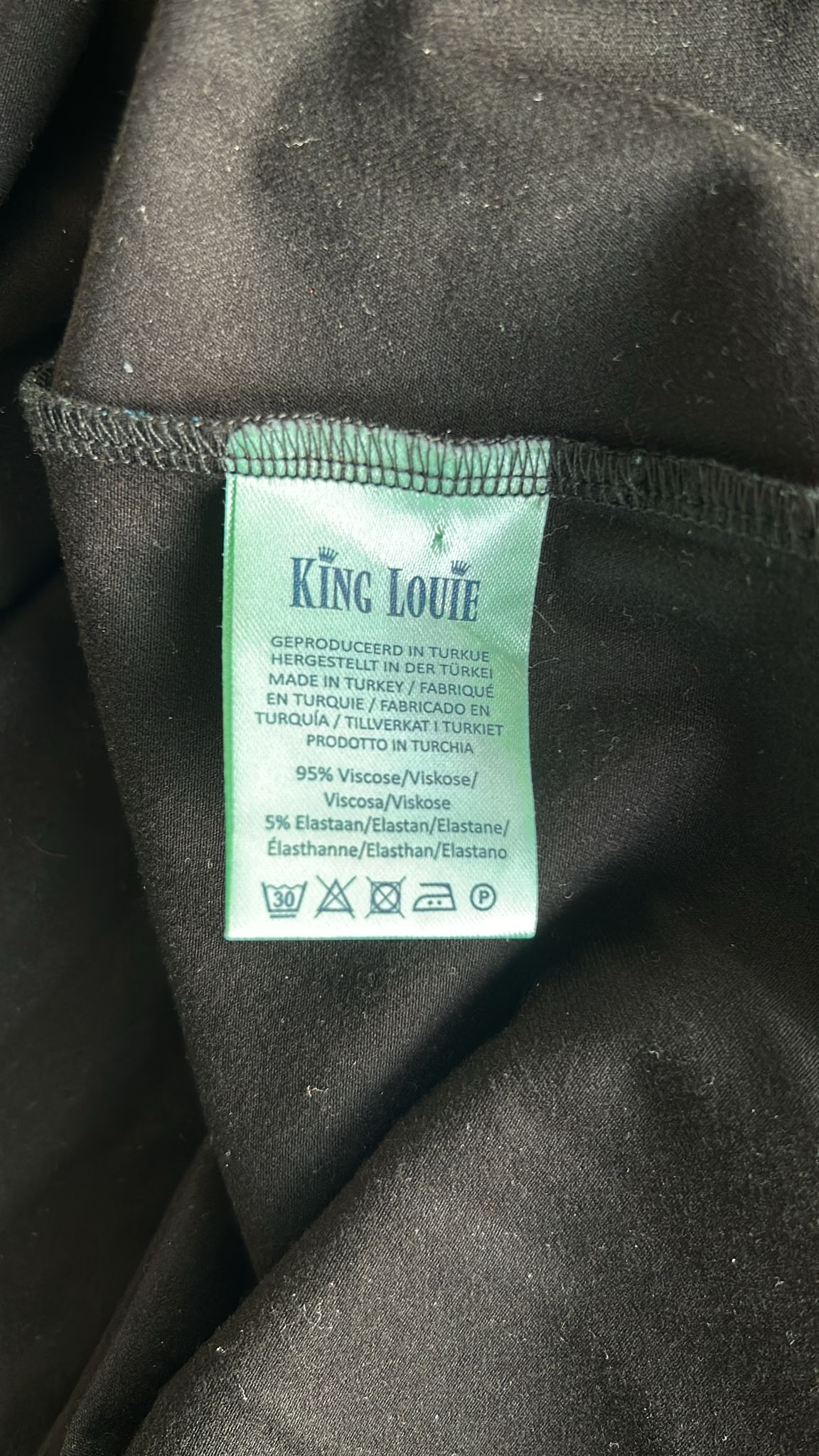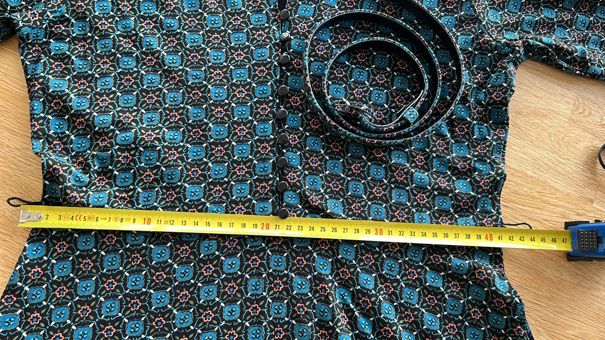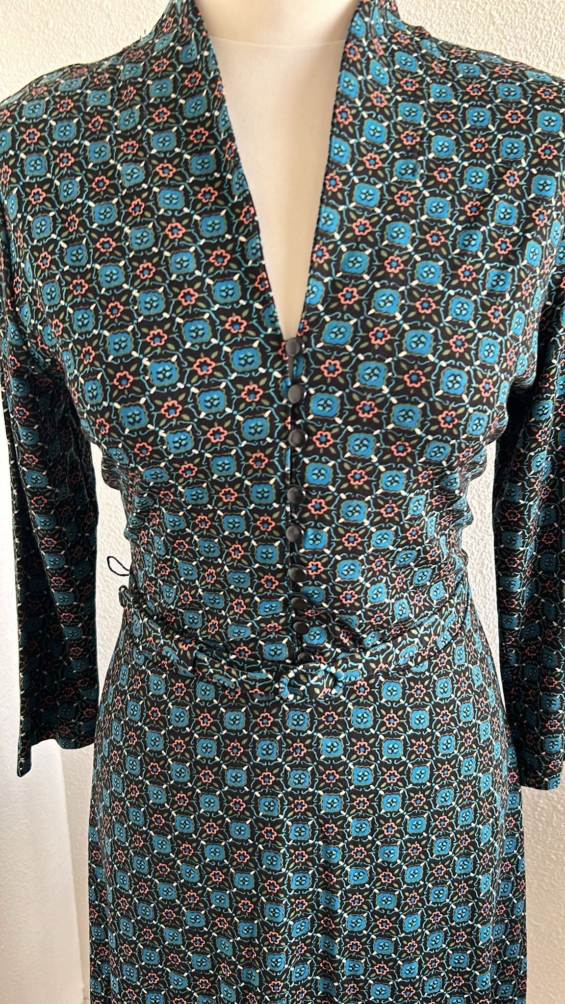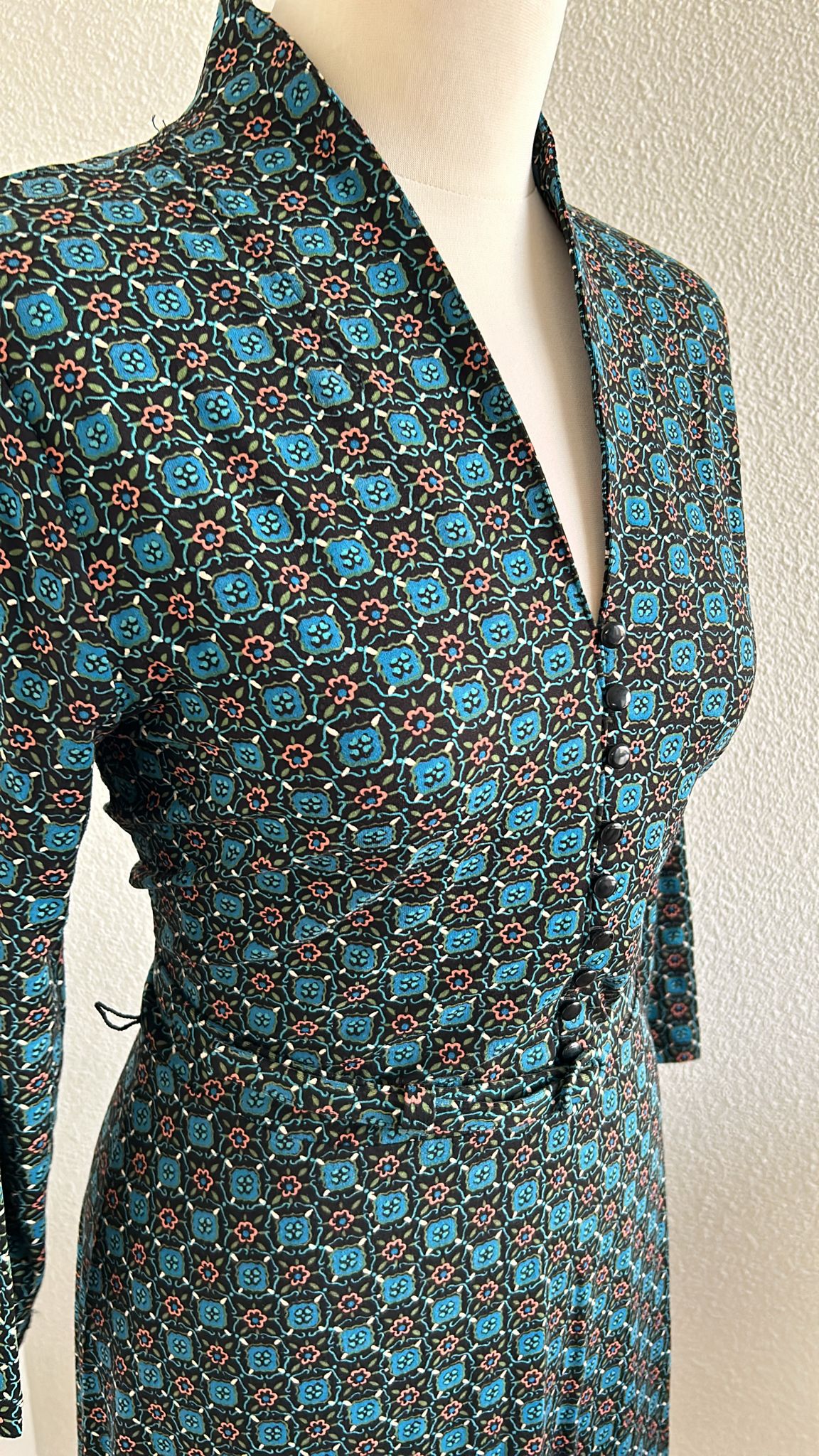 - Zwart met blauwe, creme wit en wijnrode retro print