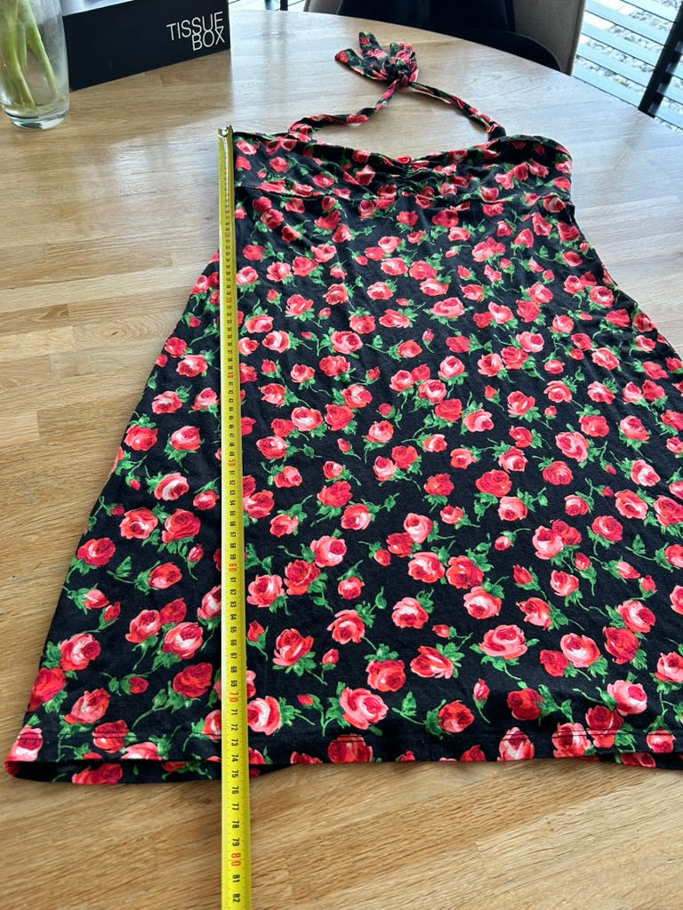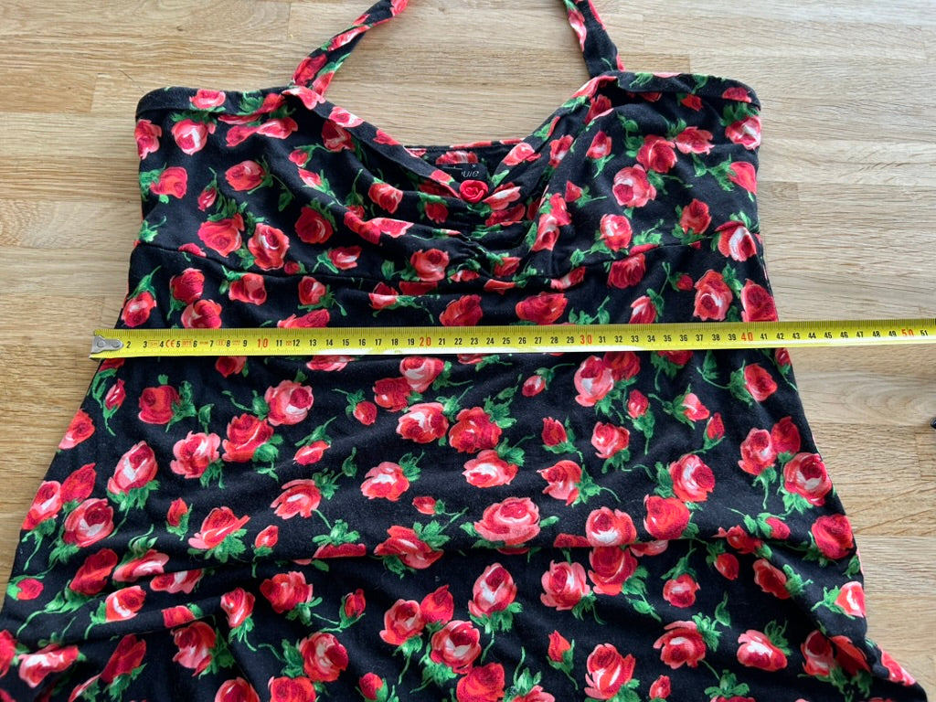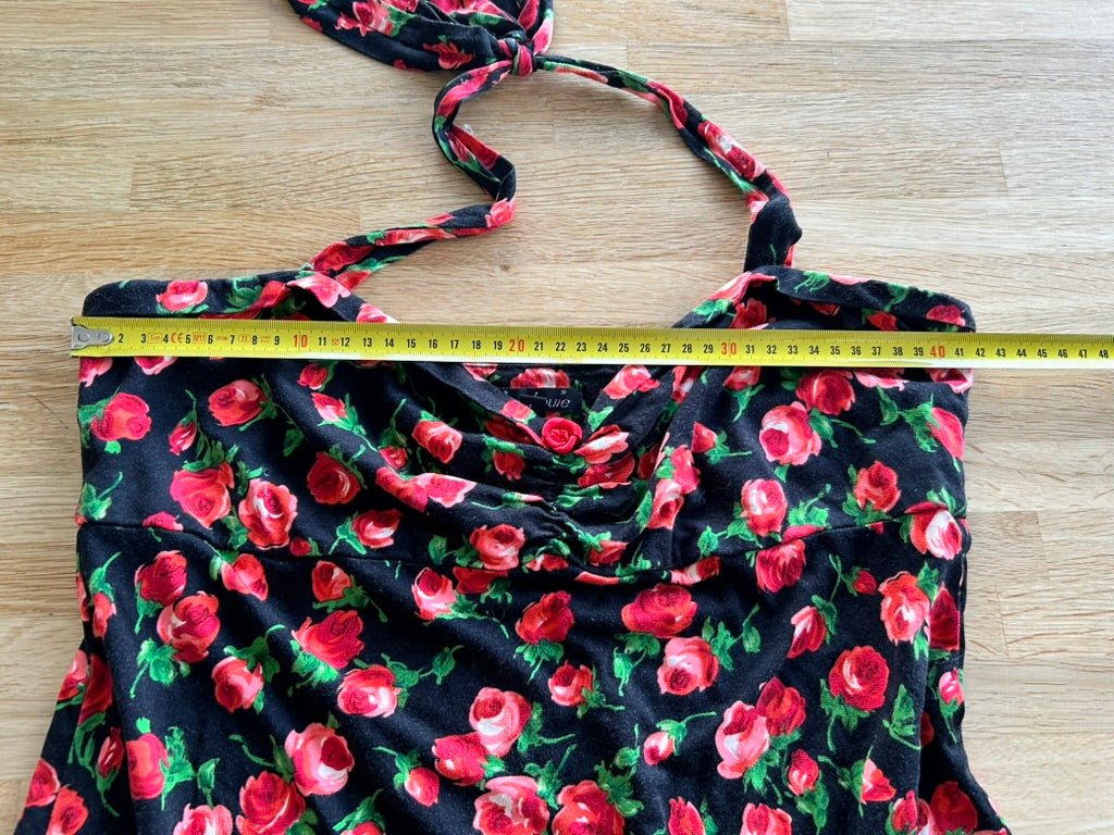 - Mooie halslijn met roosje op de borst, knoop linten in de nek, hoge taille, mouwloos model