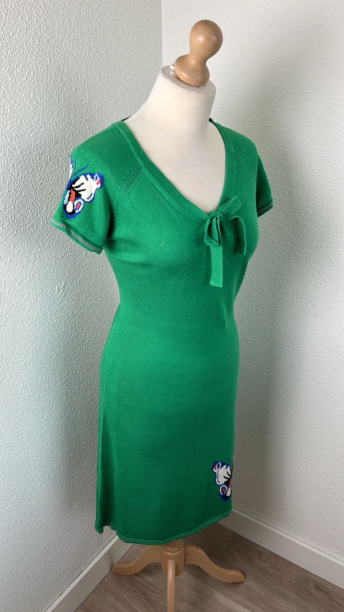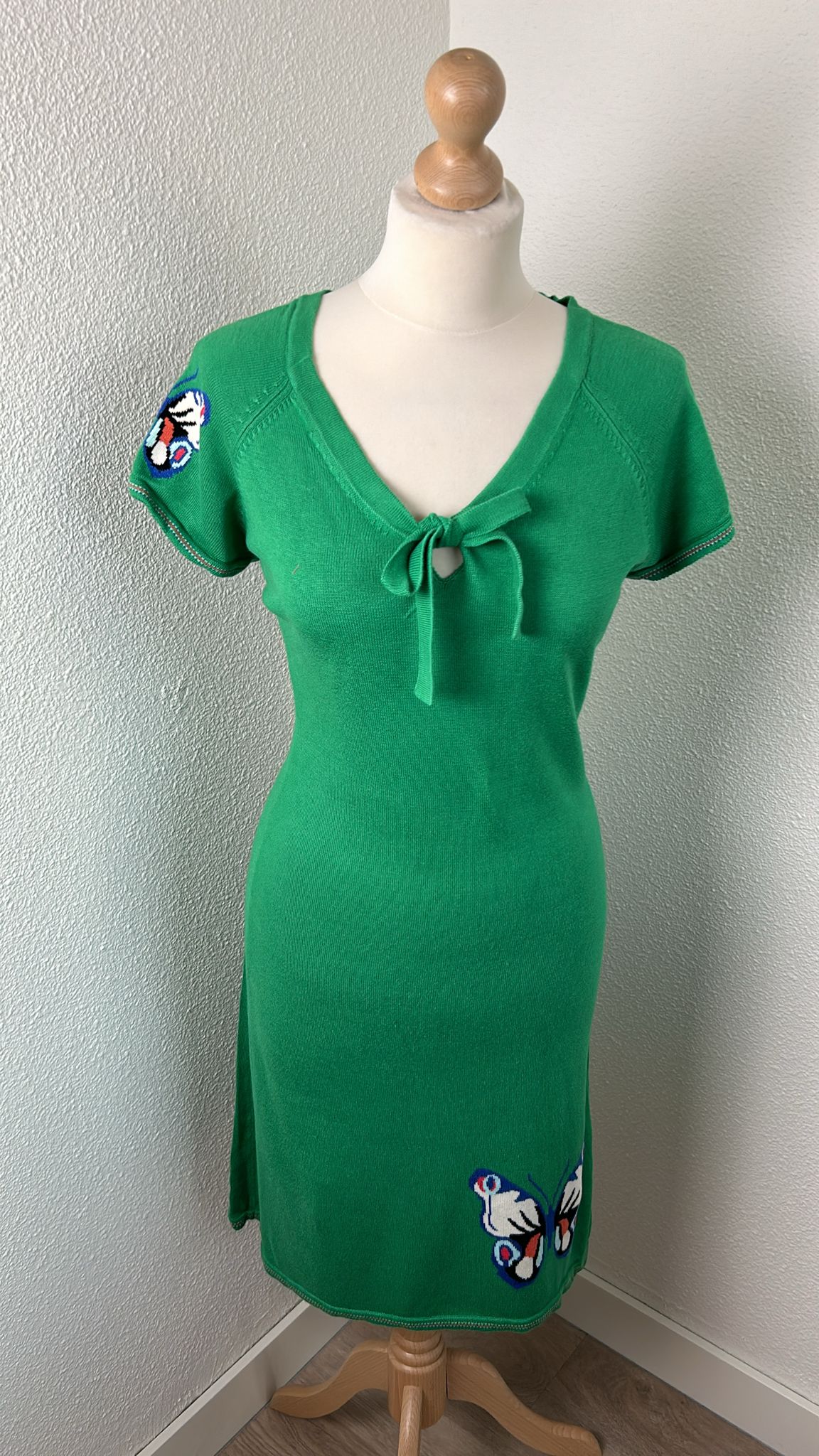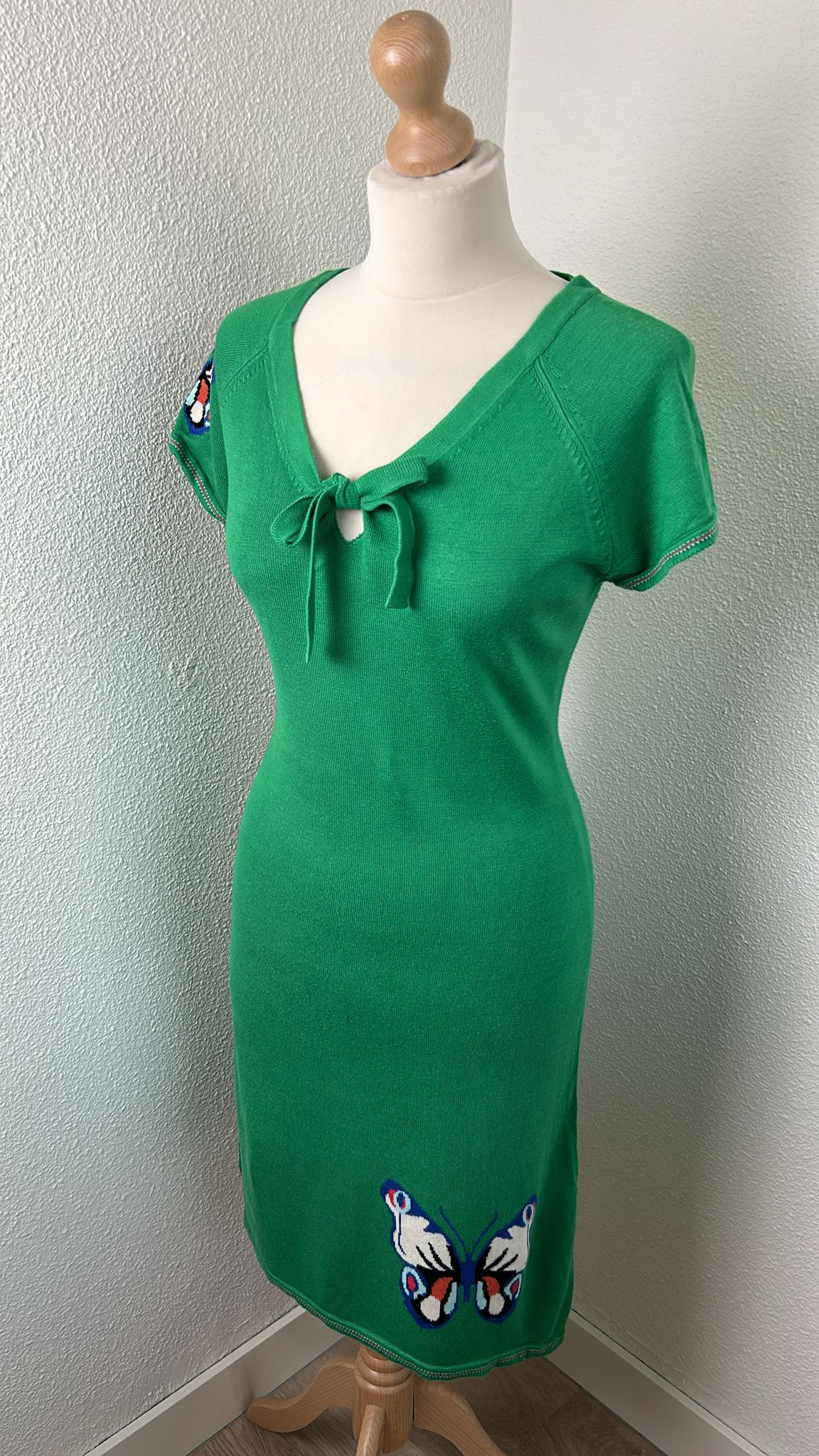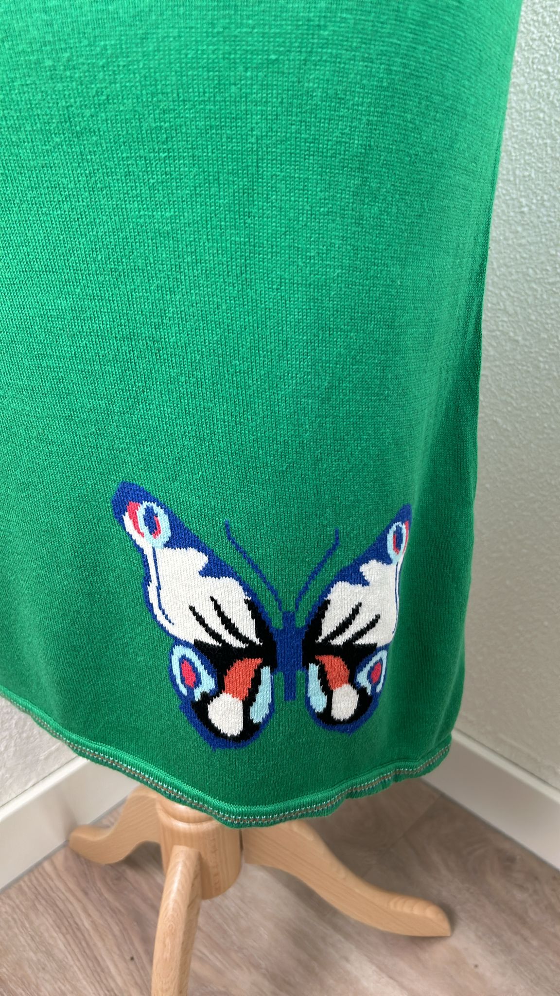 - Gras groen met zwart witte vlinder patroon op mouw en onderin de rok