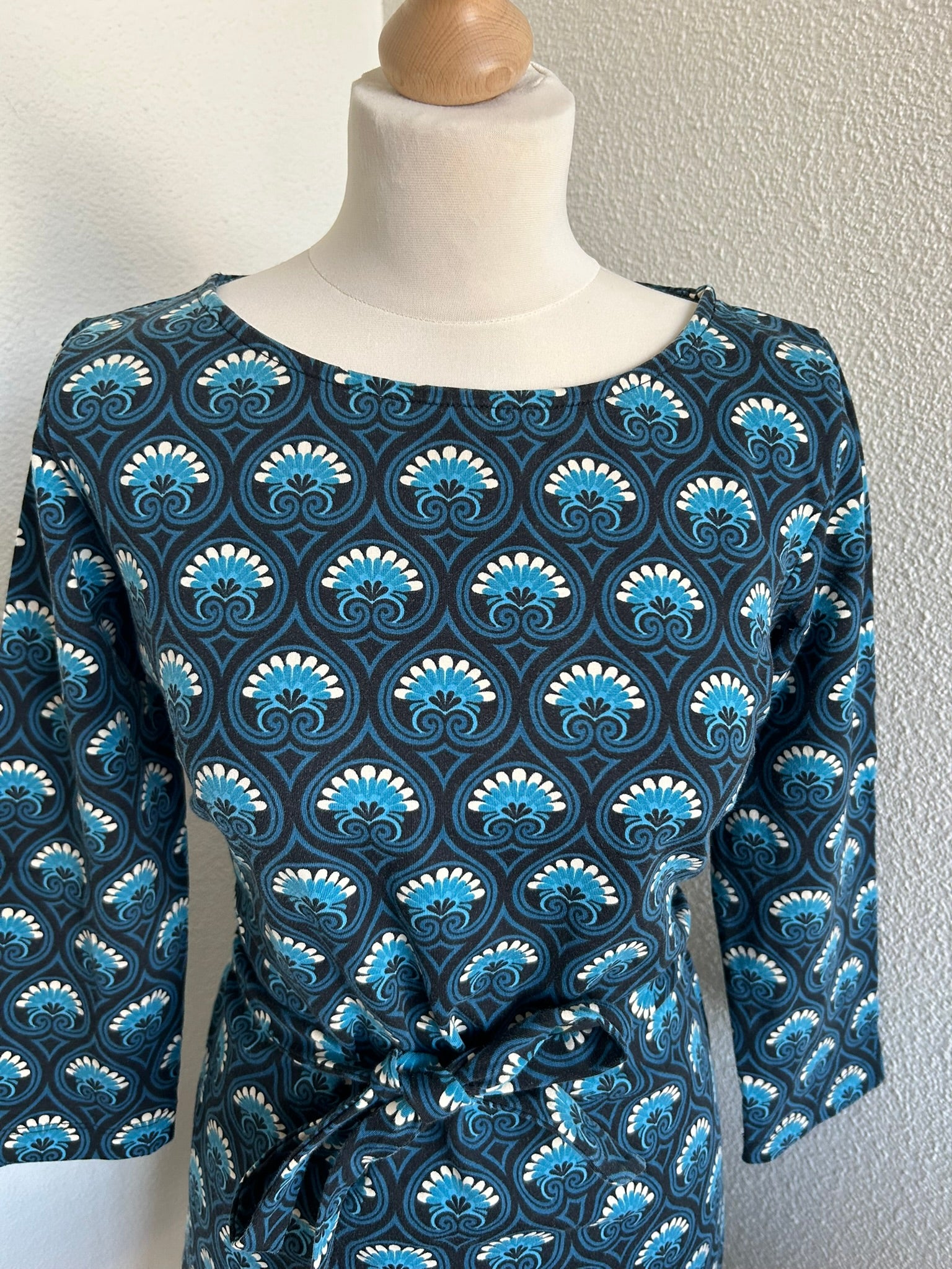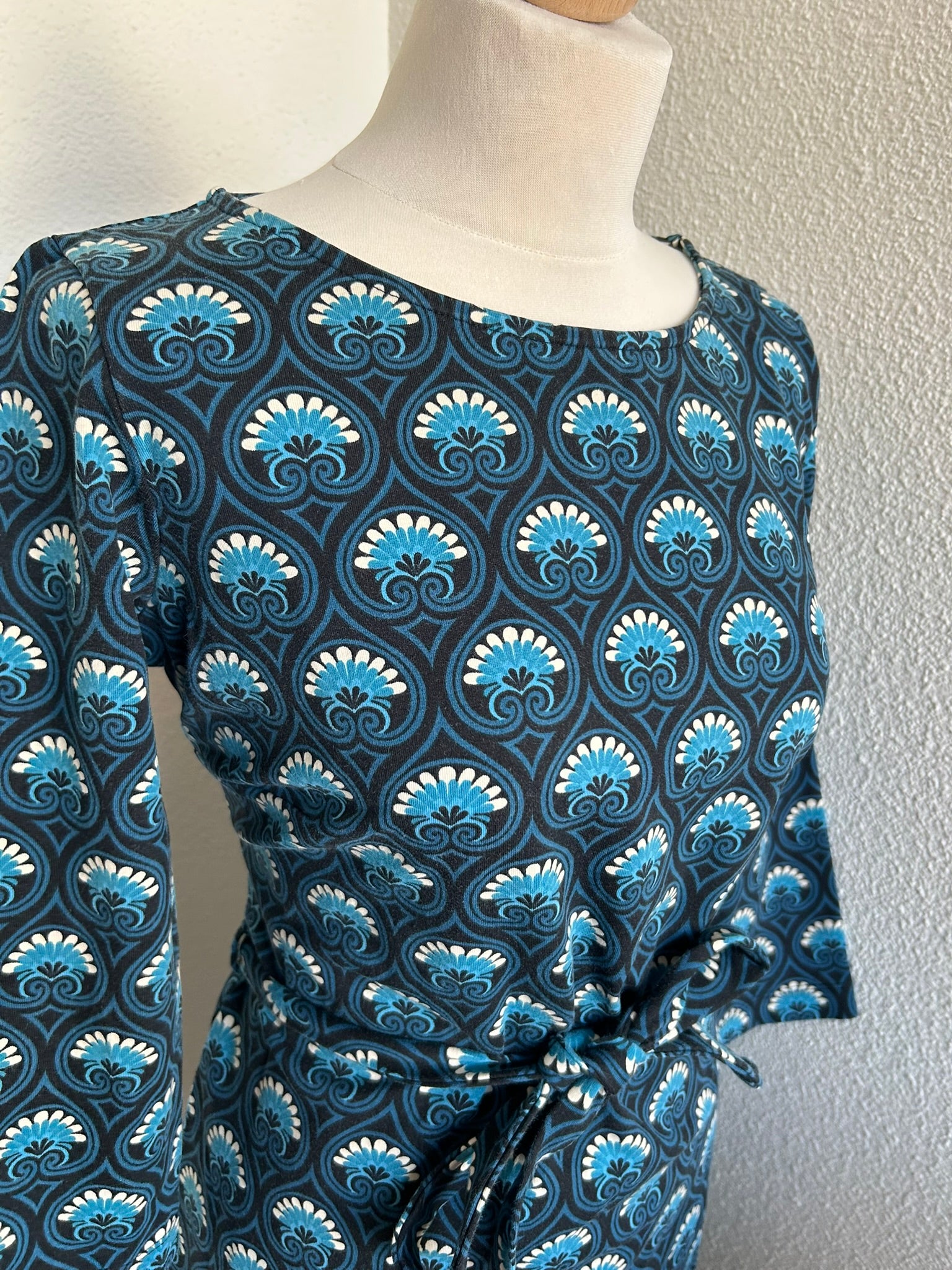 - Mooie ronde halslijn, halve mouwen, recht model getailleerd door knooplintje