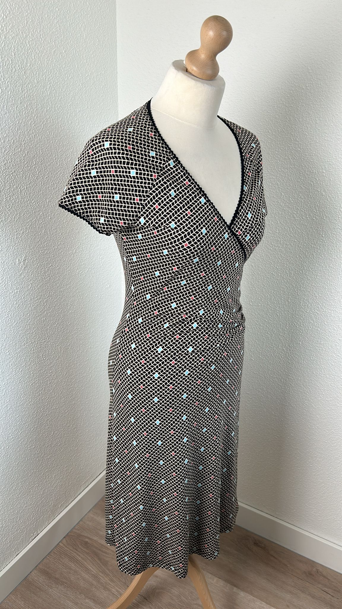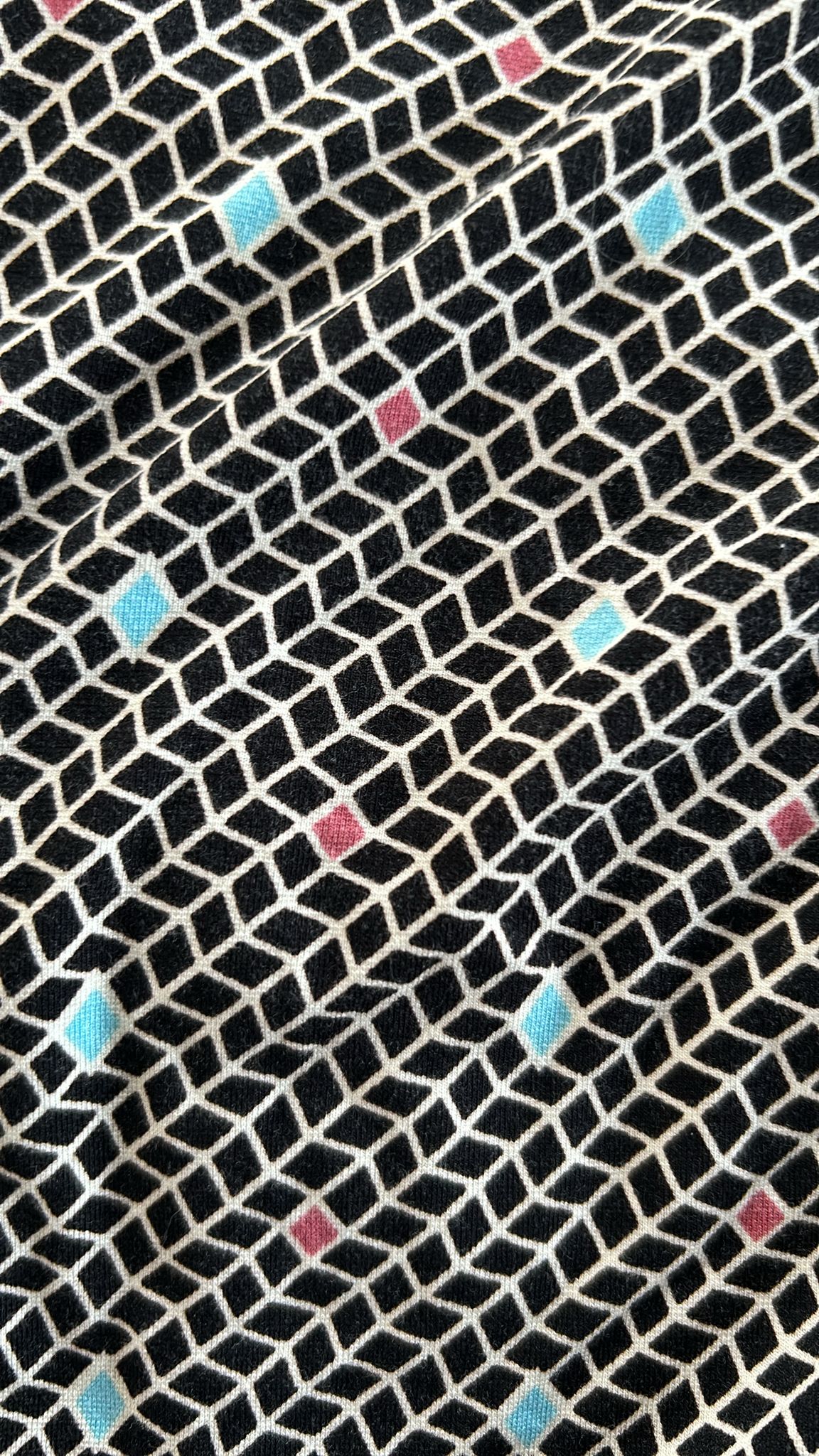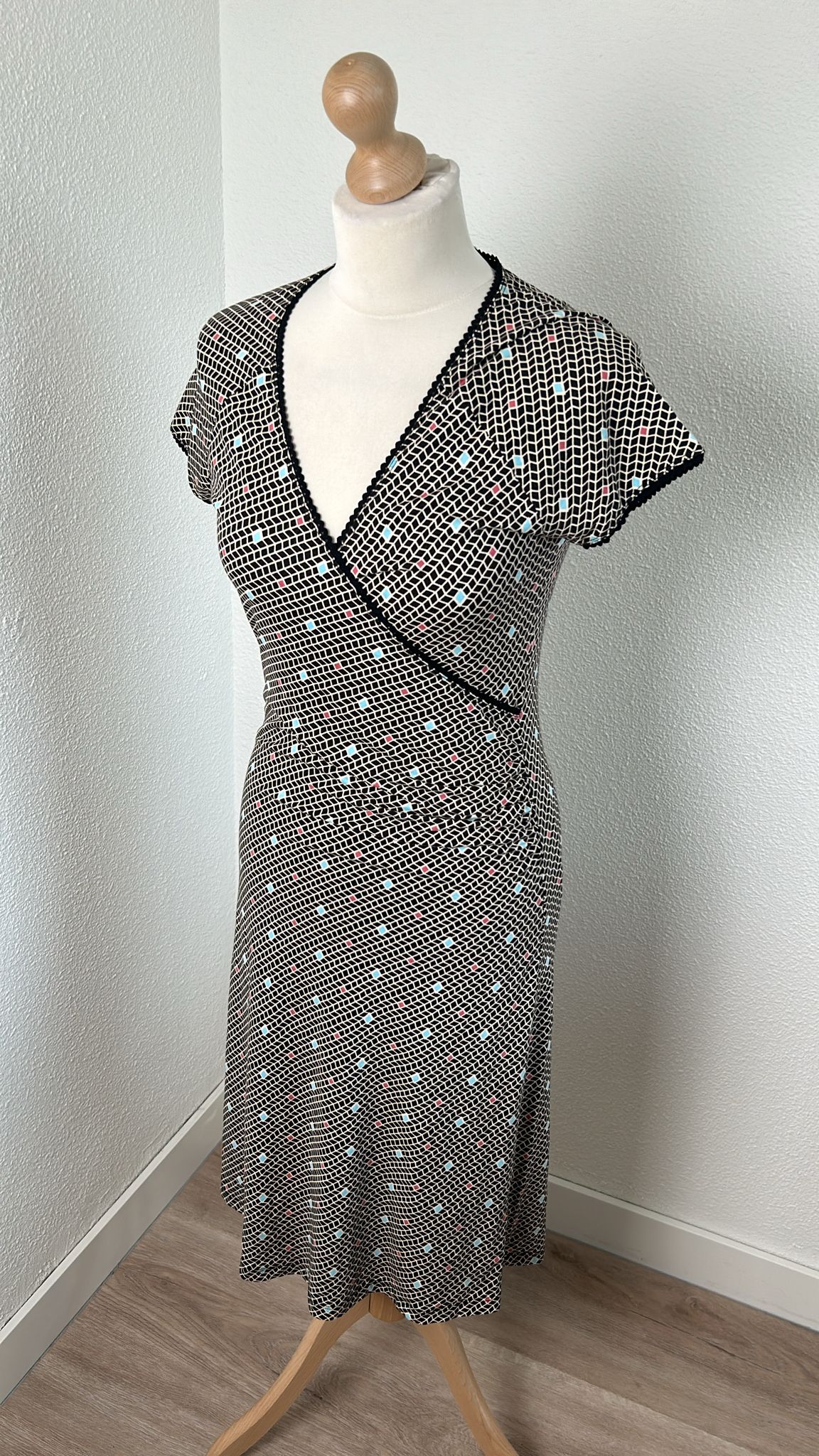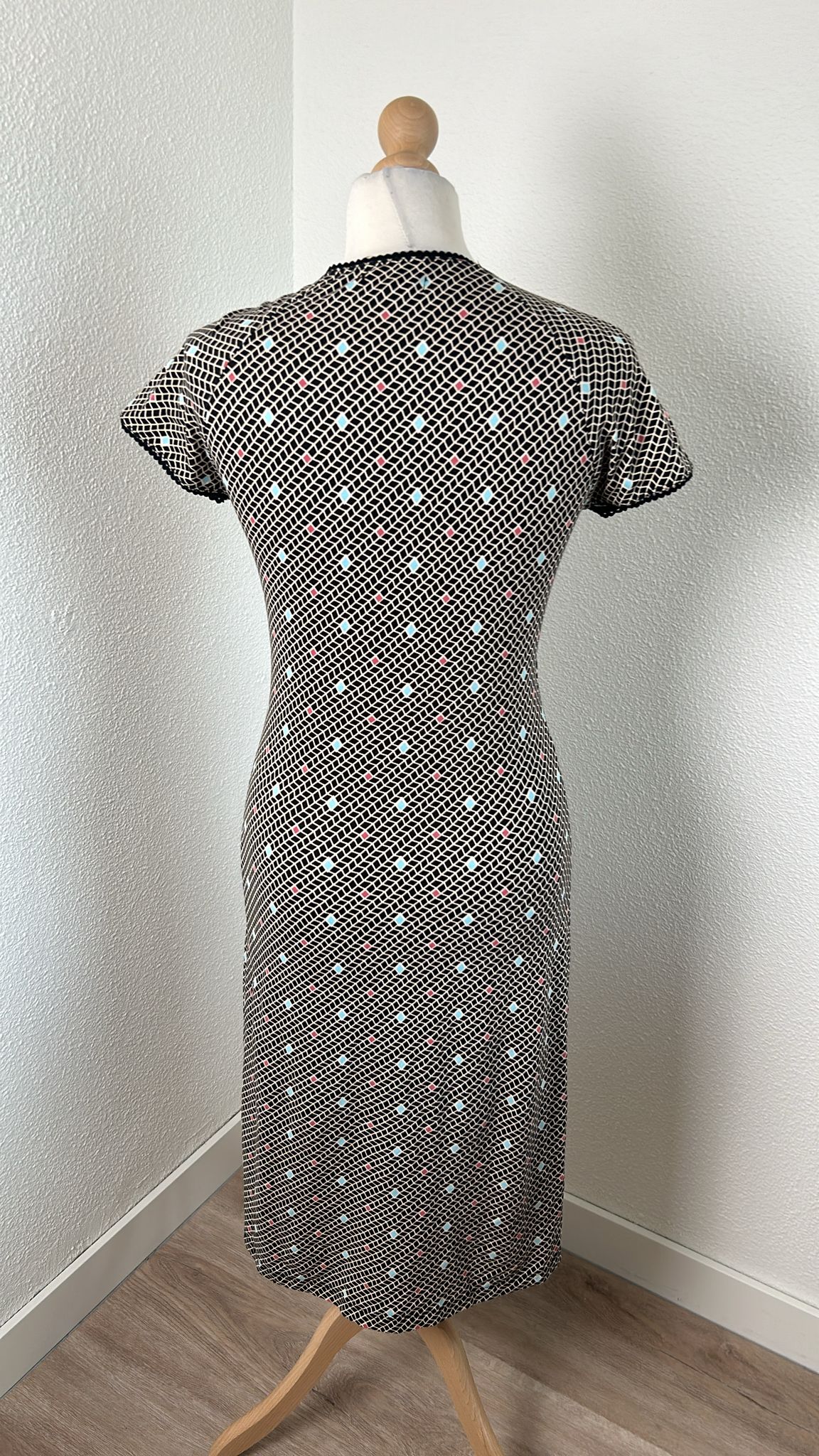 - Zwart wit geruite retro print met turquoise en koraal details