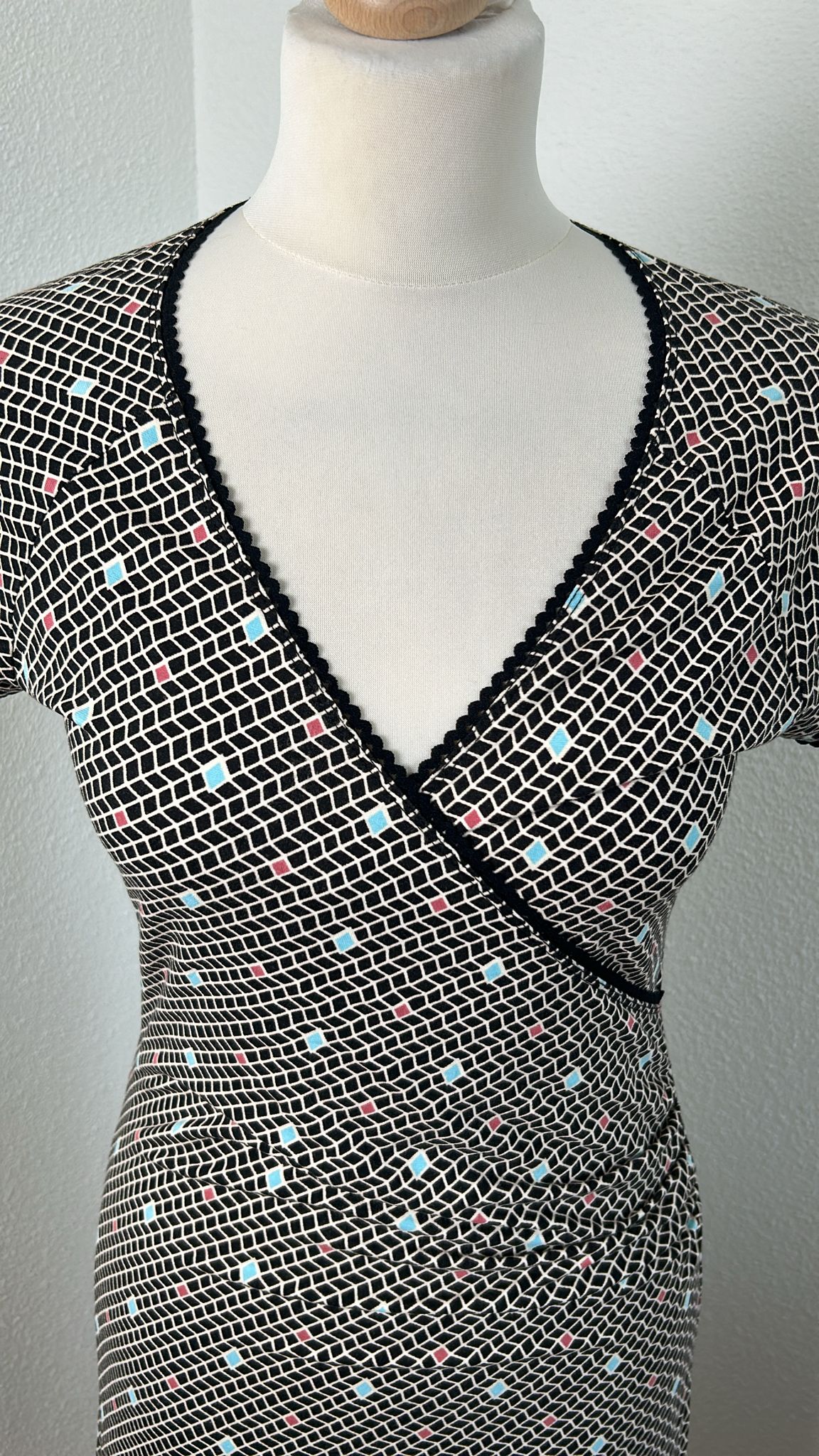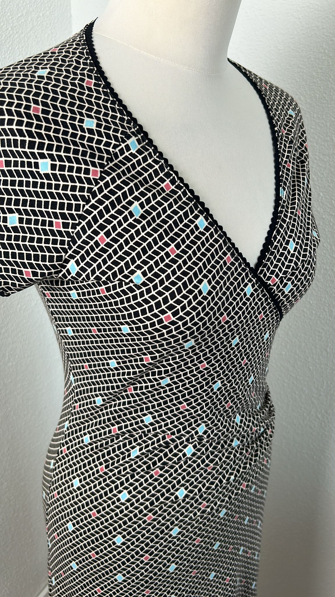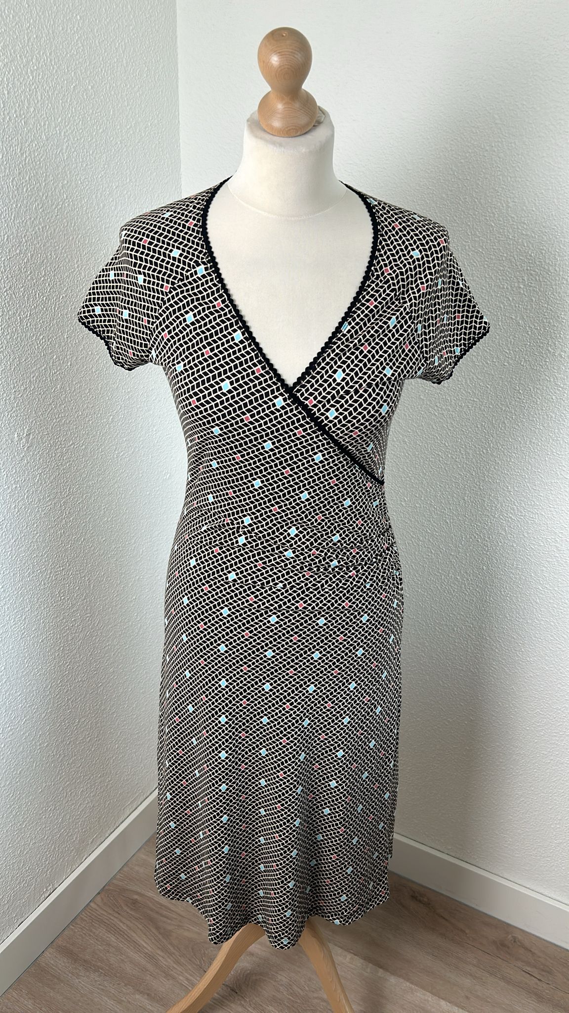 - Zwart wit geruite retro print met turquoise en koraal details