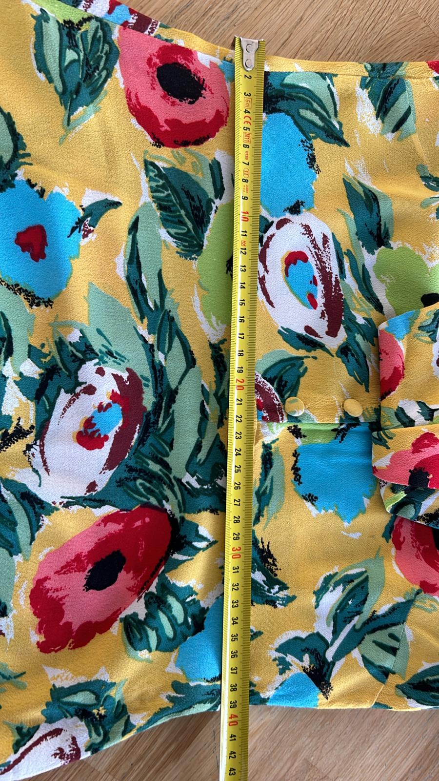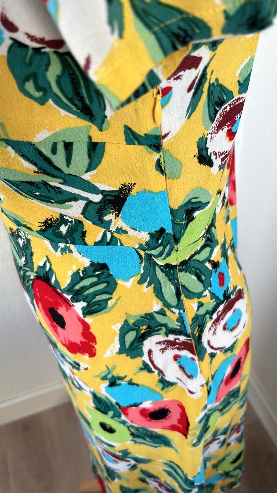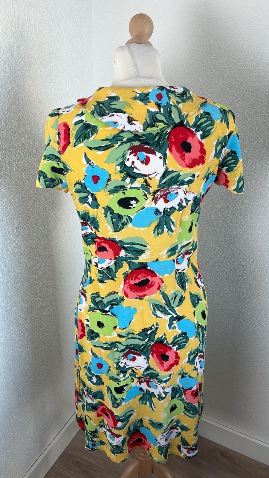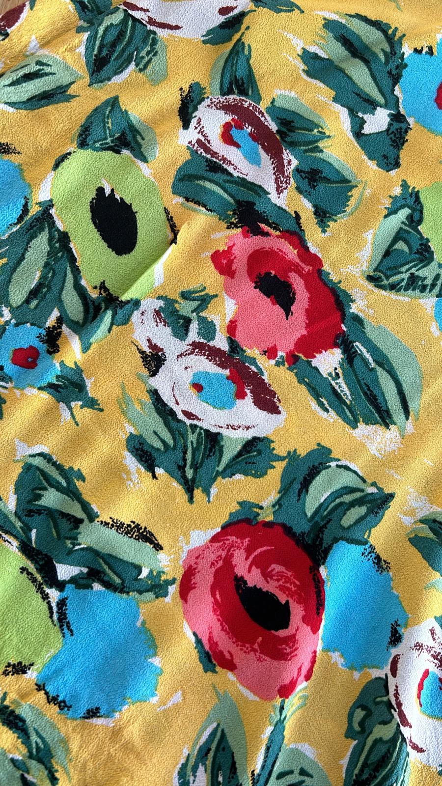 - Geel met retro bloemen/klaprozen print in groen blauw rood zwart wit
