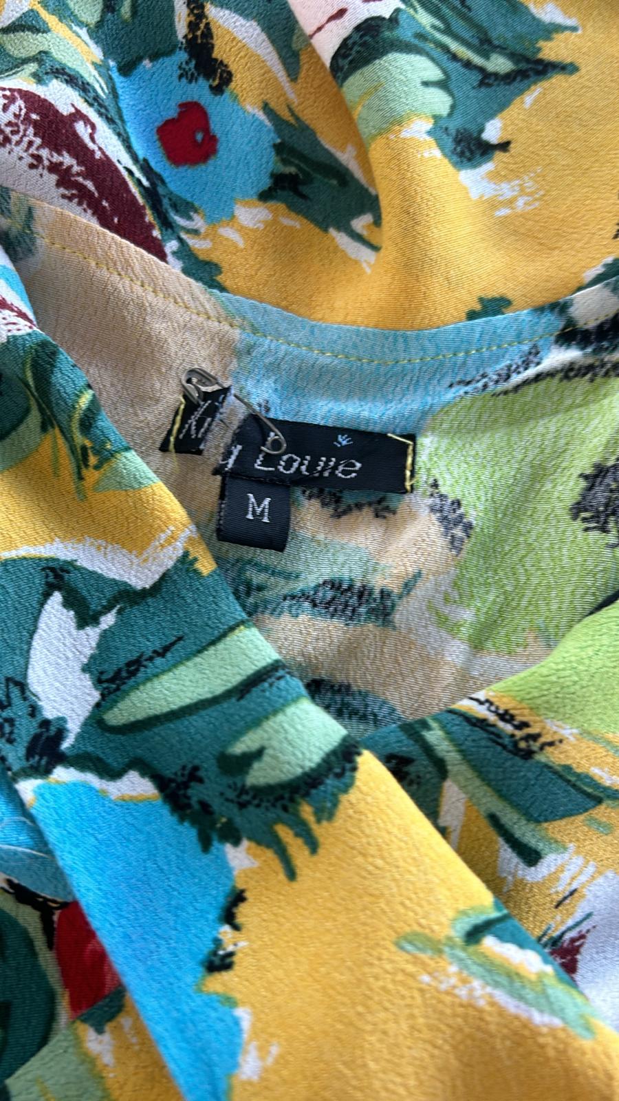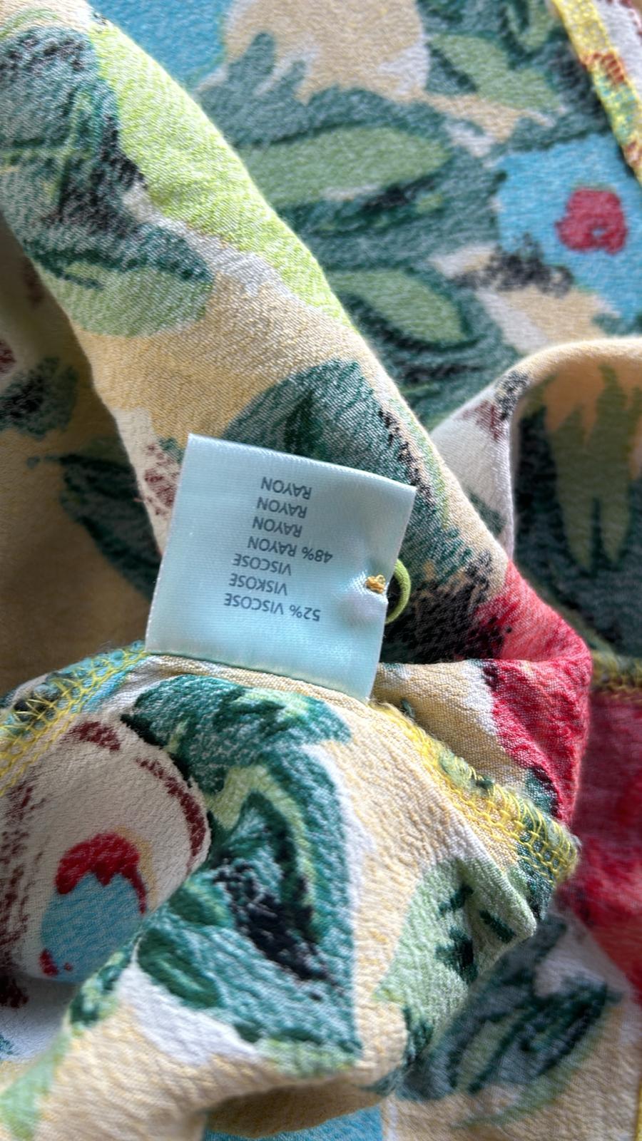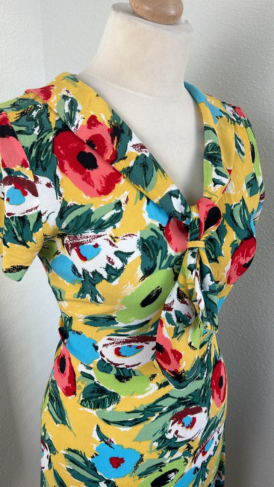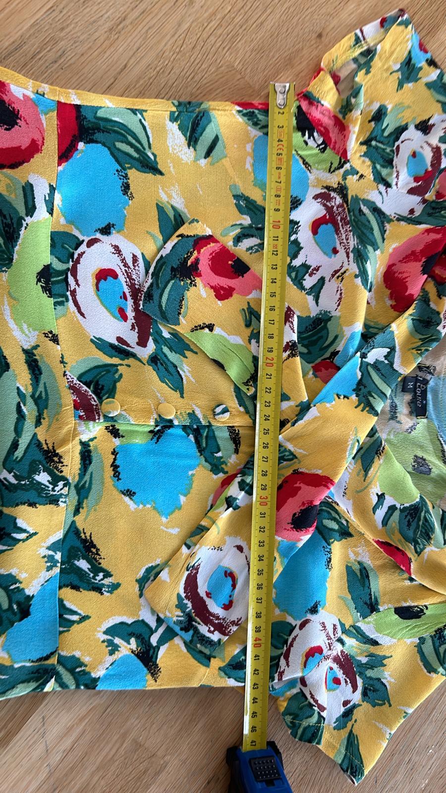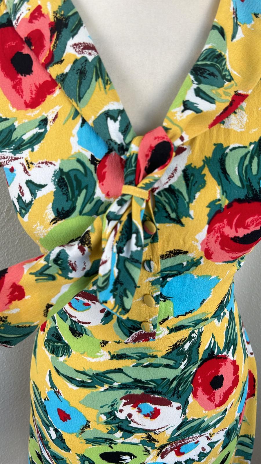 - Geel met retro bloemen/klaprozen print in groen blauw rood zwart wit