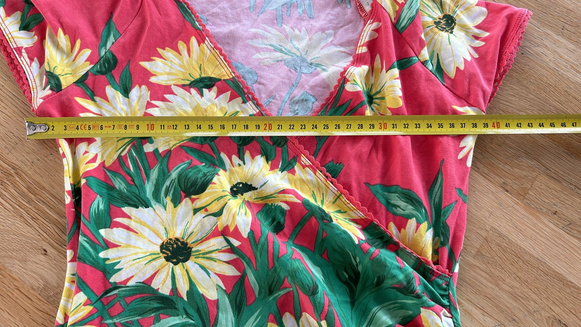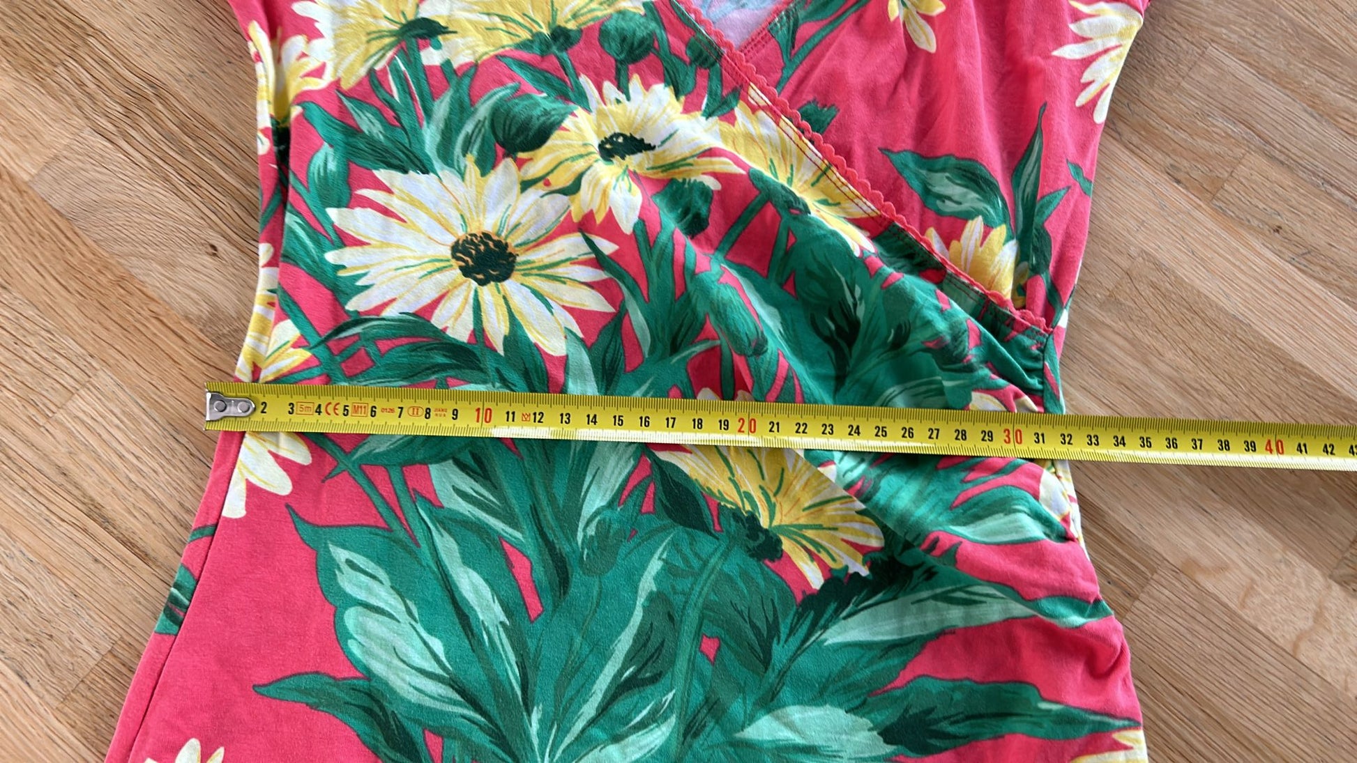 - Mooi halslijn met overslag op de borst, korte mouwen, plooien in de zij