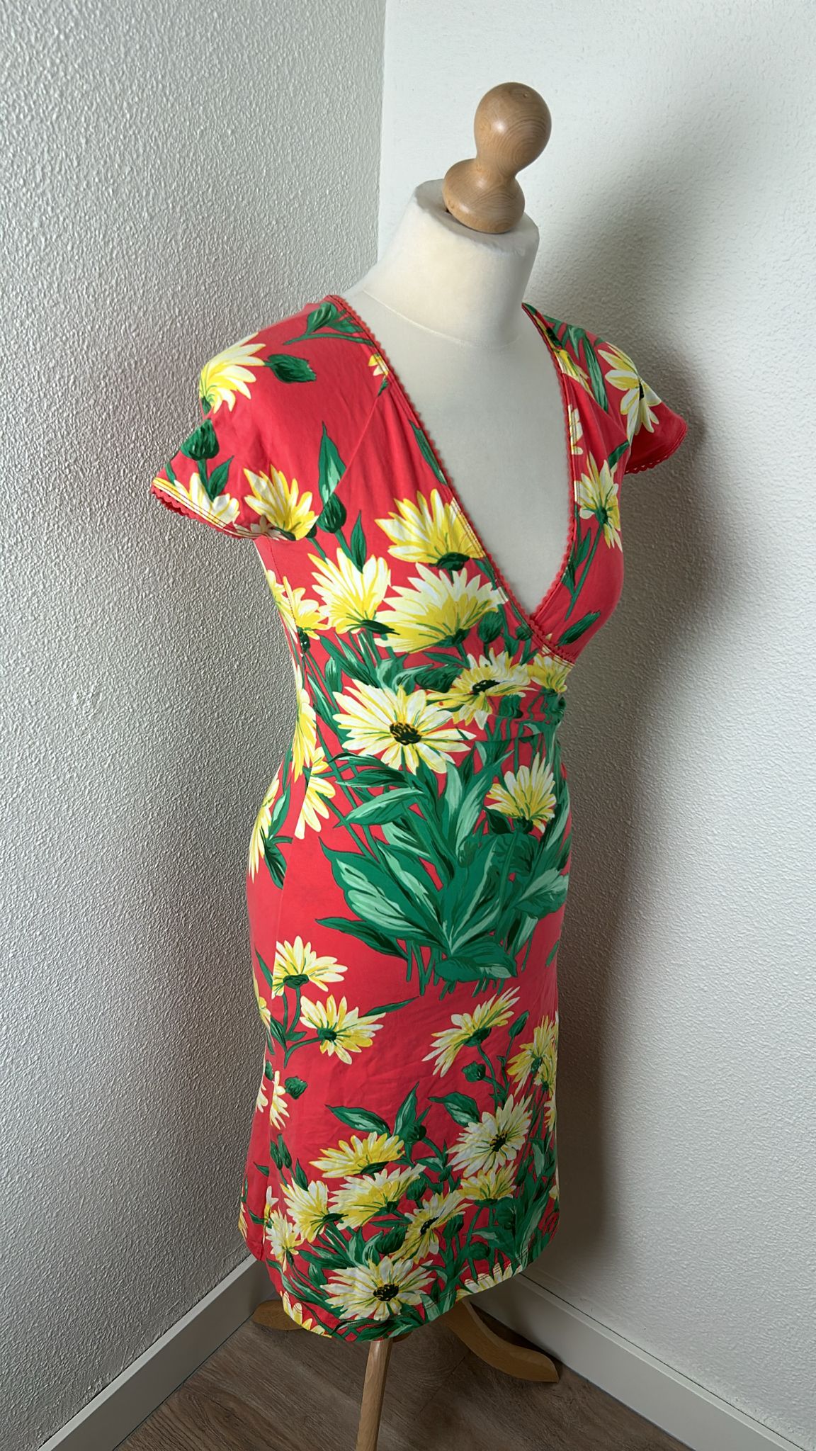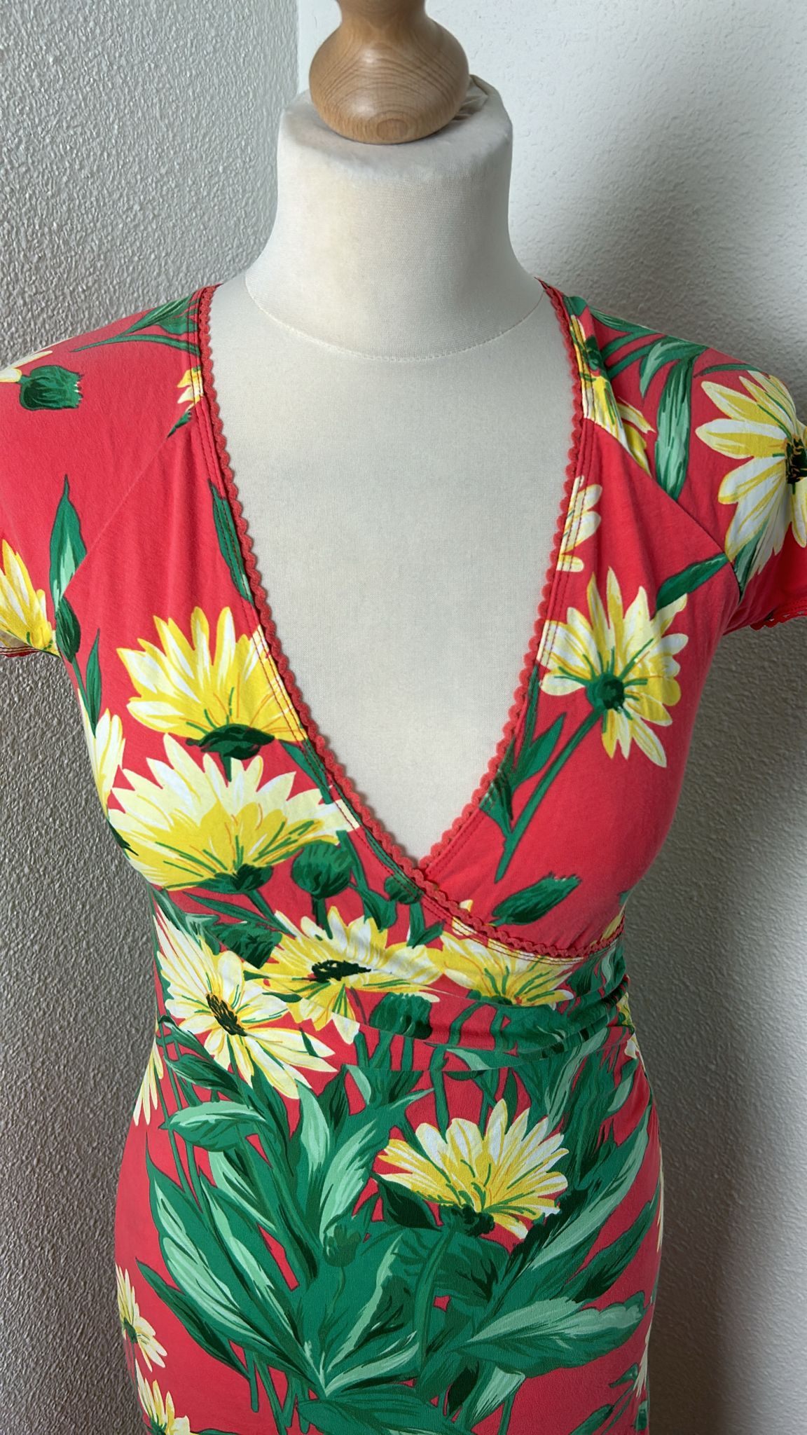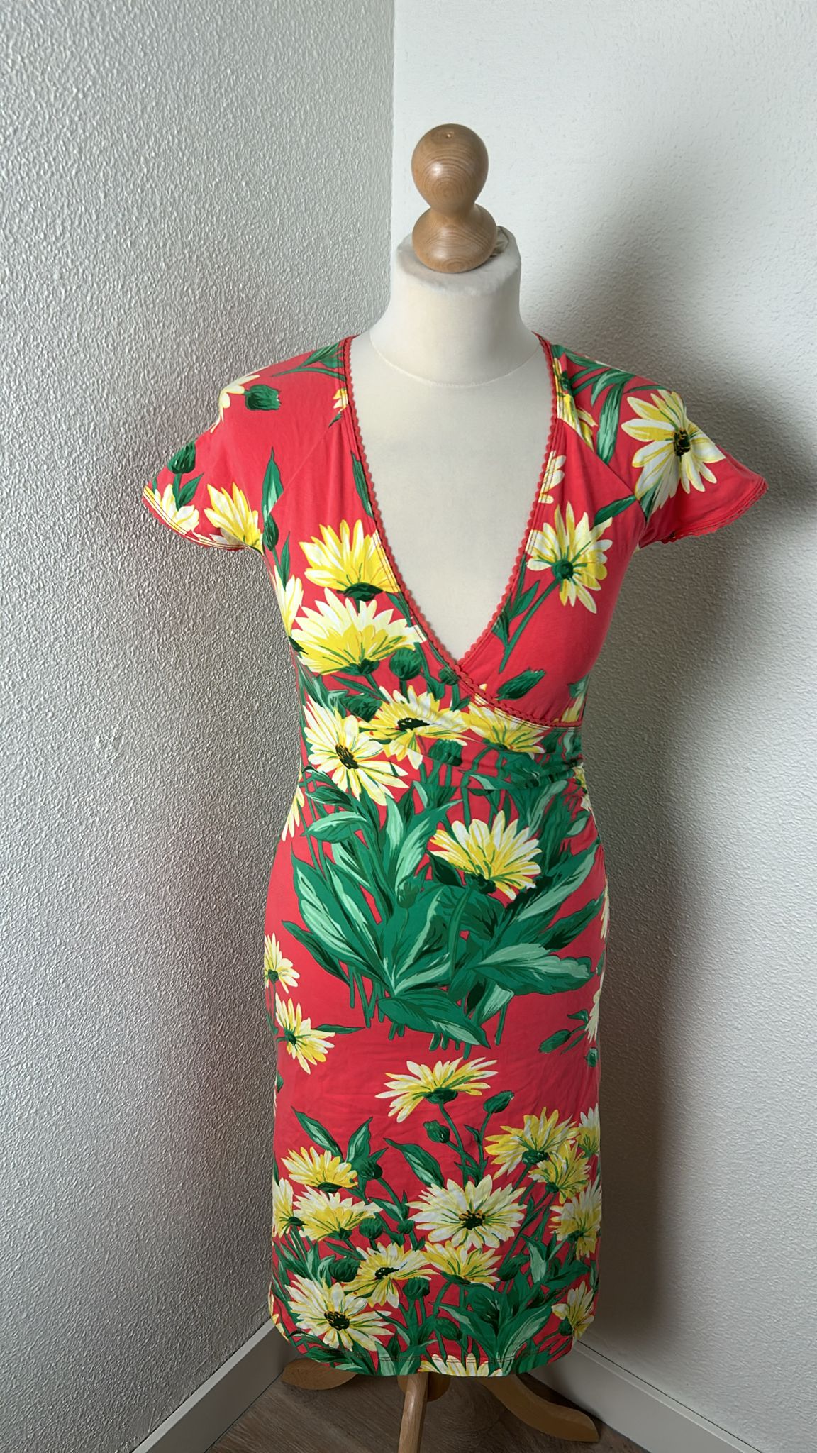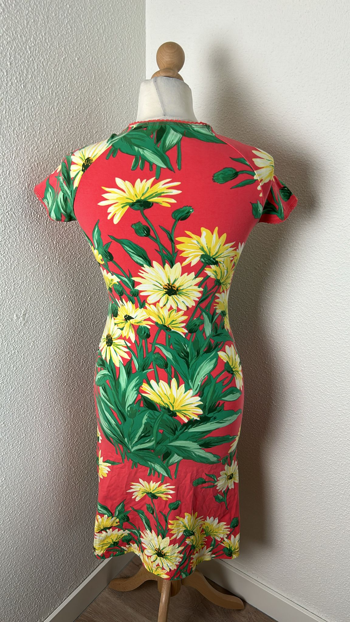 - Koraal-roze met retro bloemen print in geel zwart groen