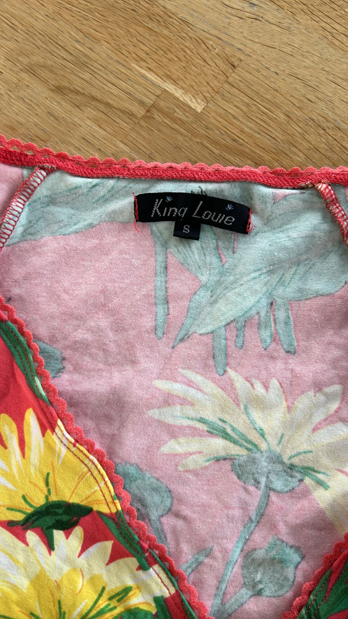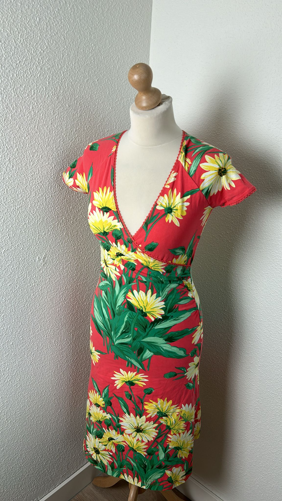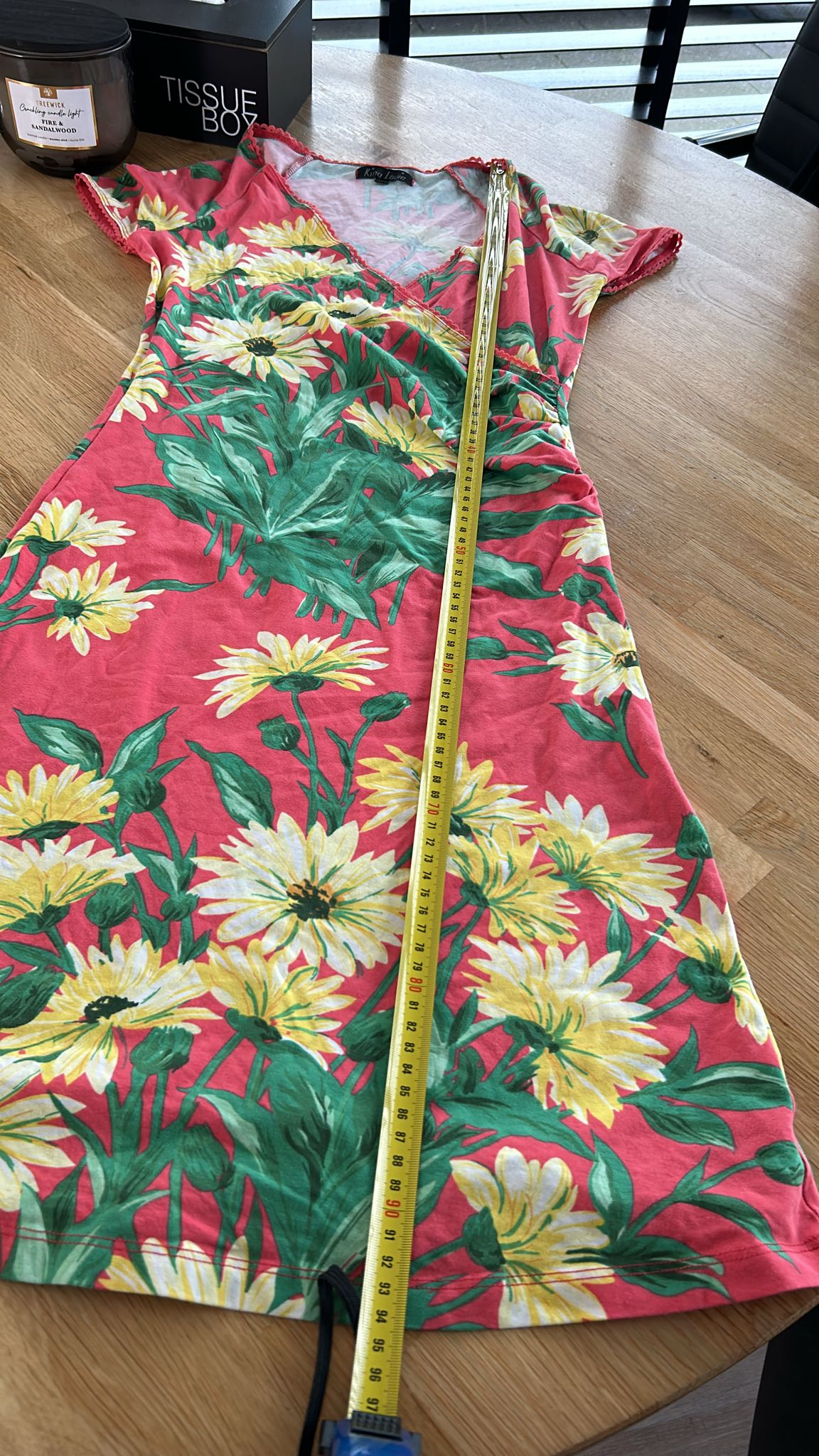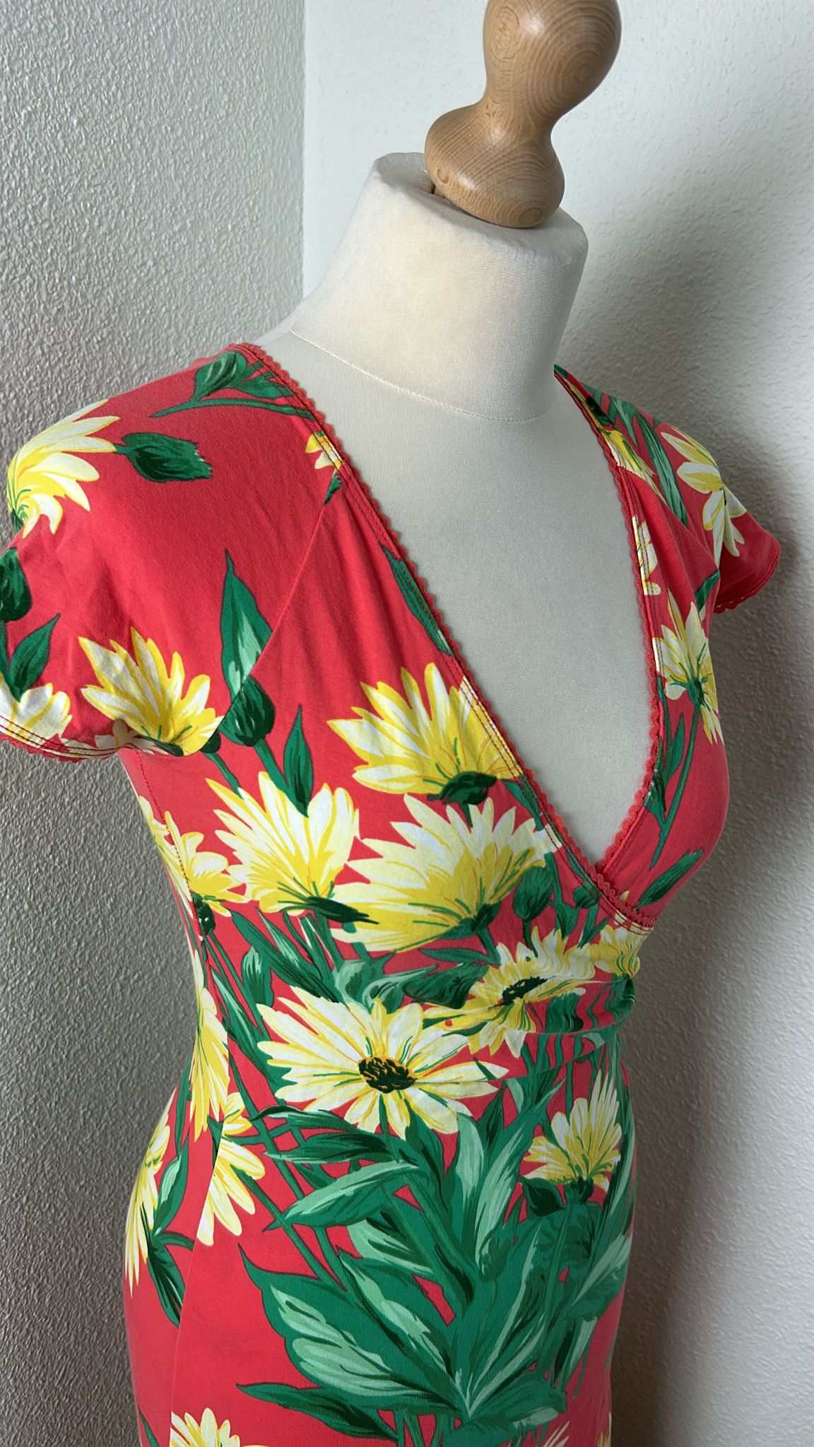 - Koraal-roze met retro bloemen print in geel zwart groen