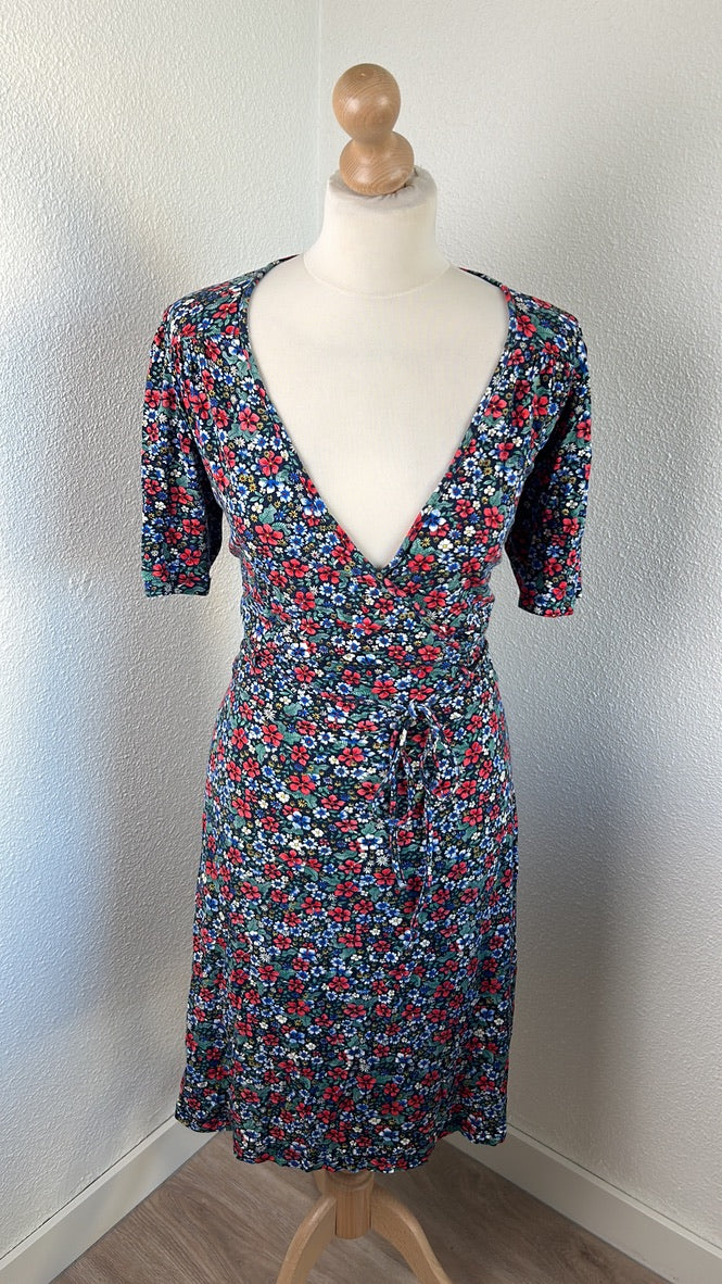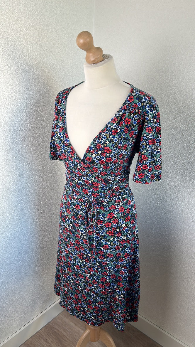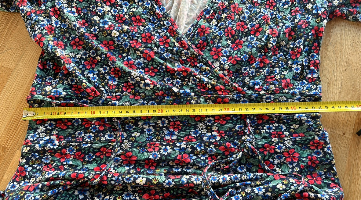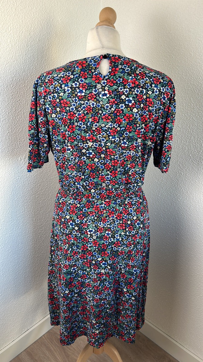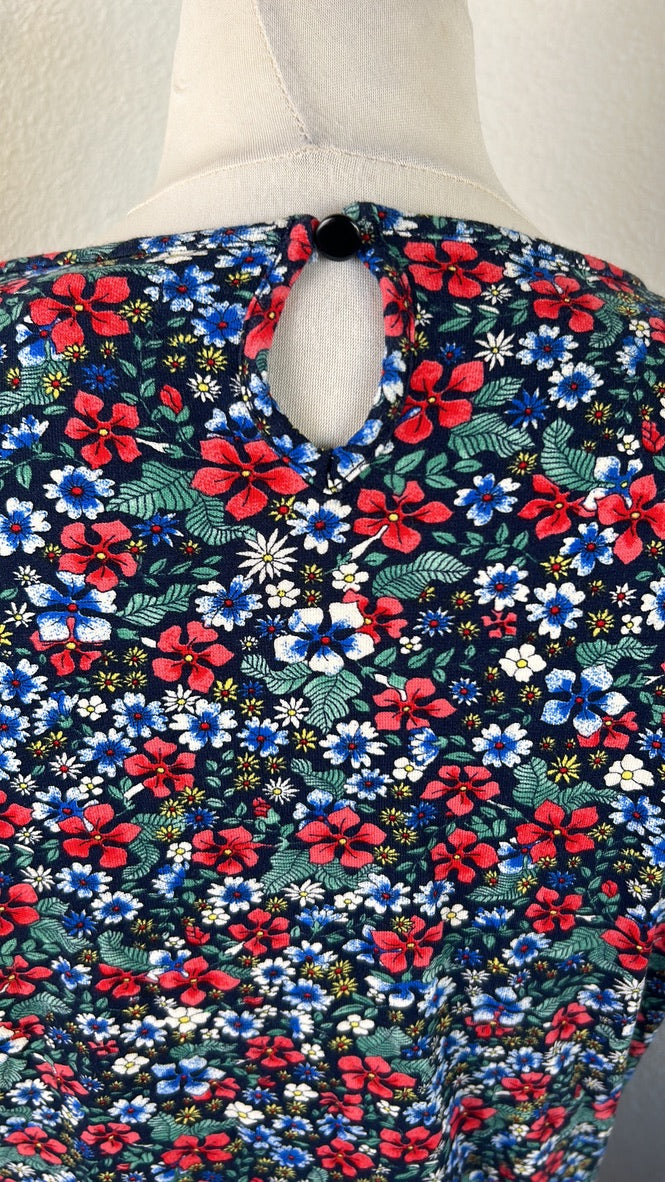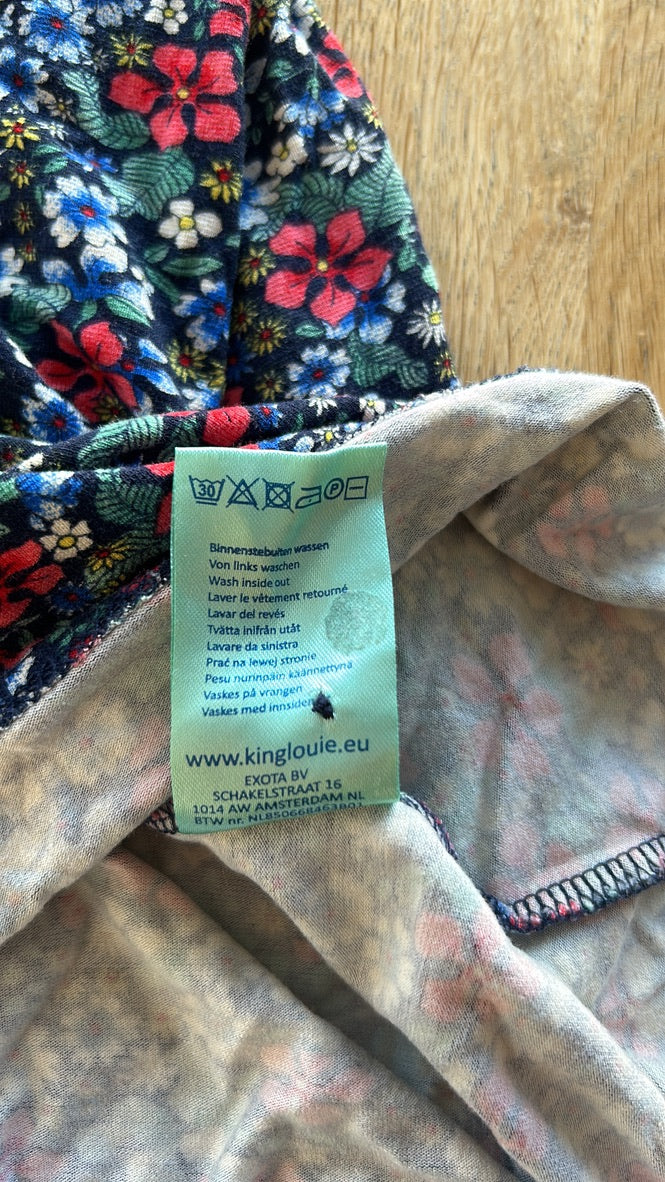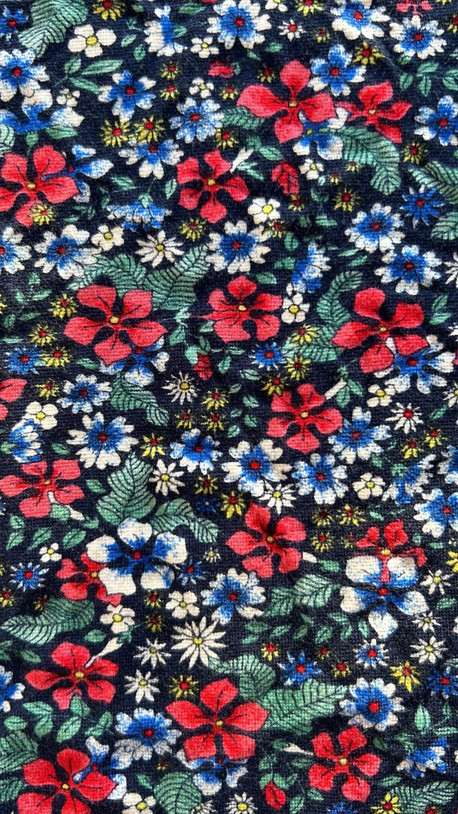 - Donkerblauw met gekleurde bloemen print in wit rood en groen