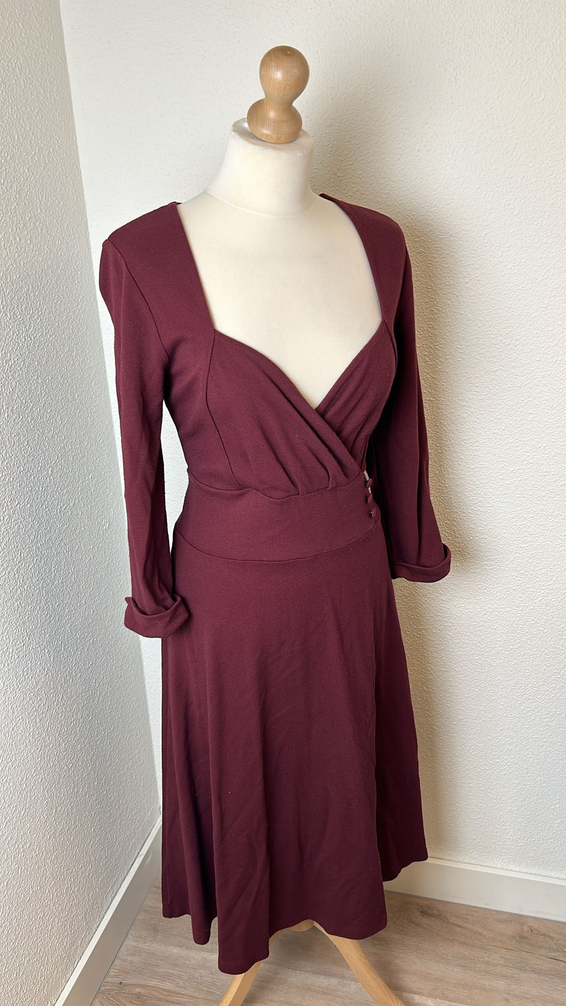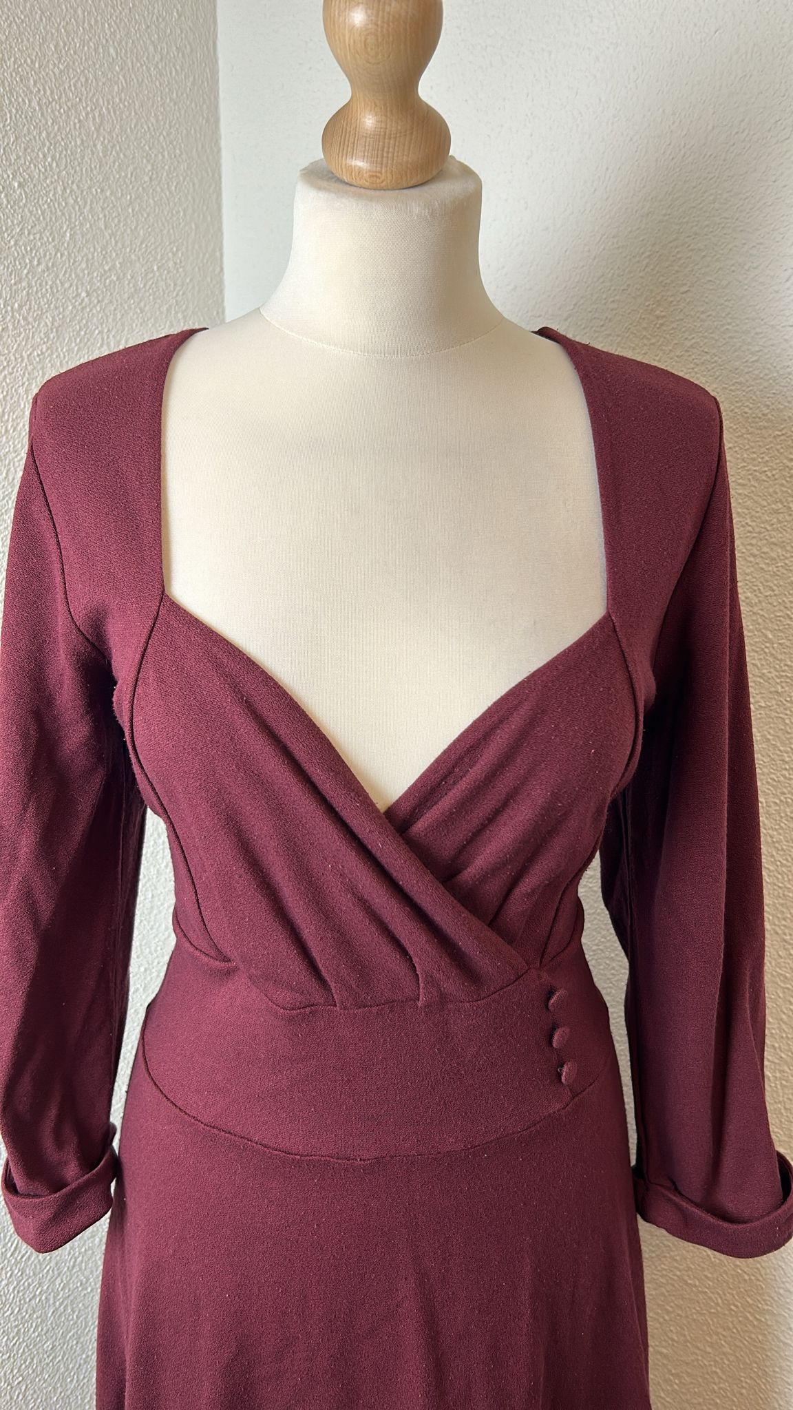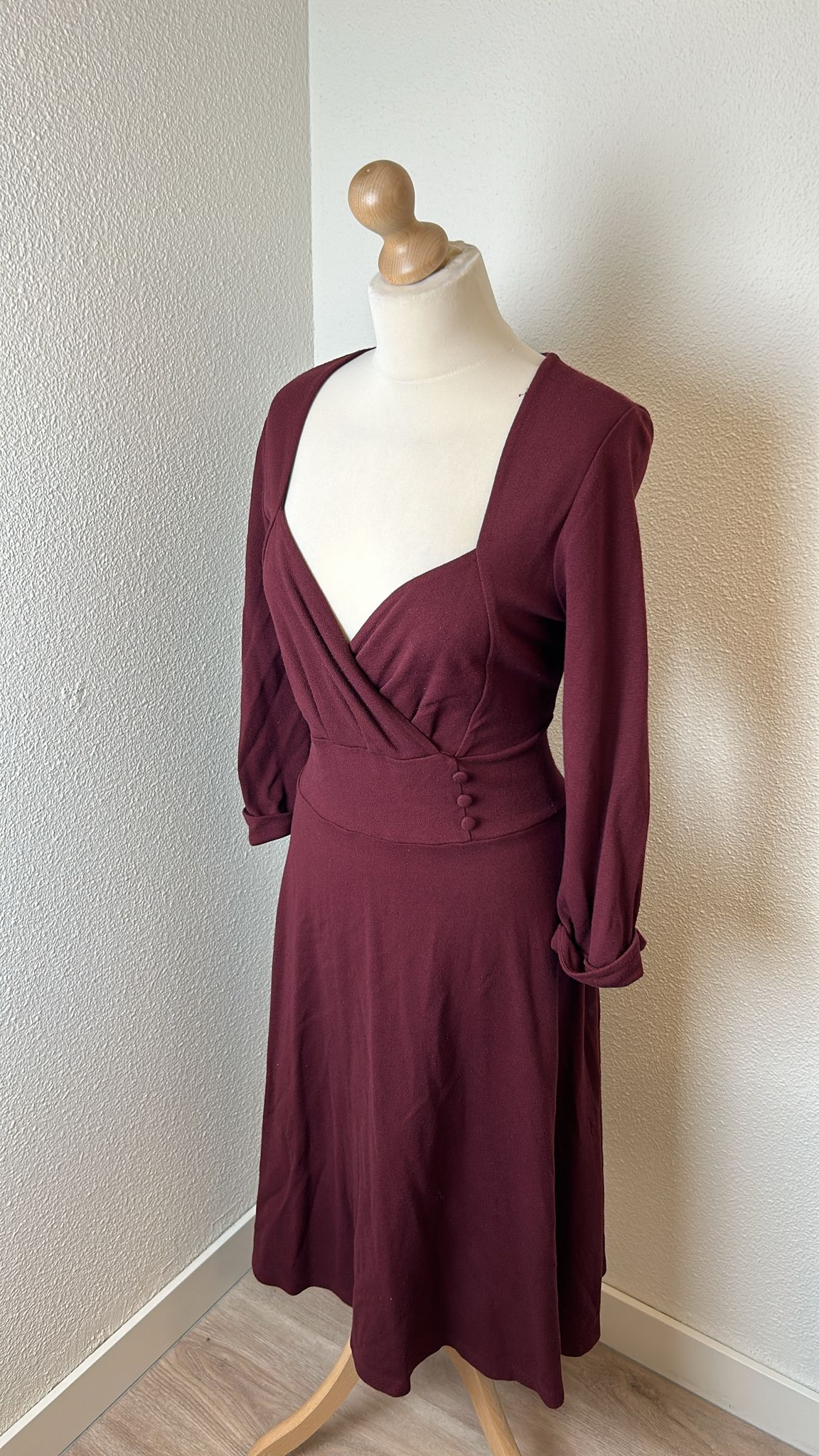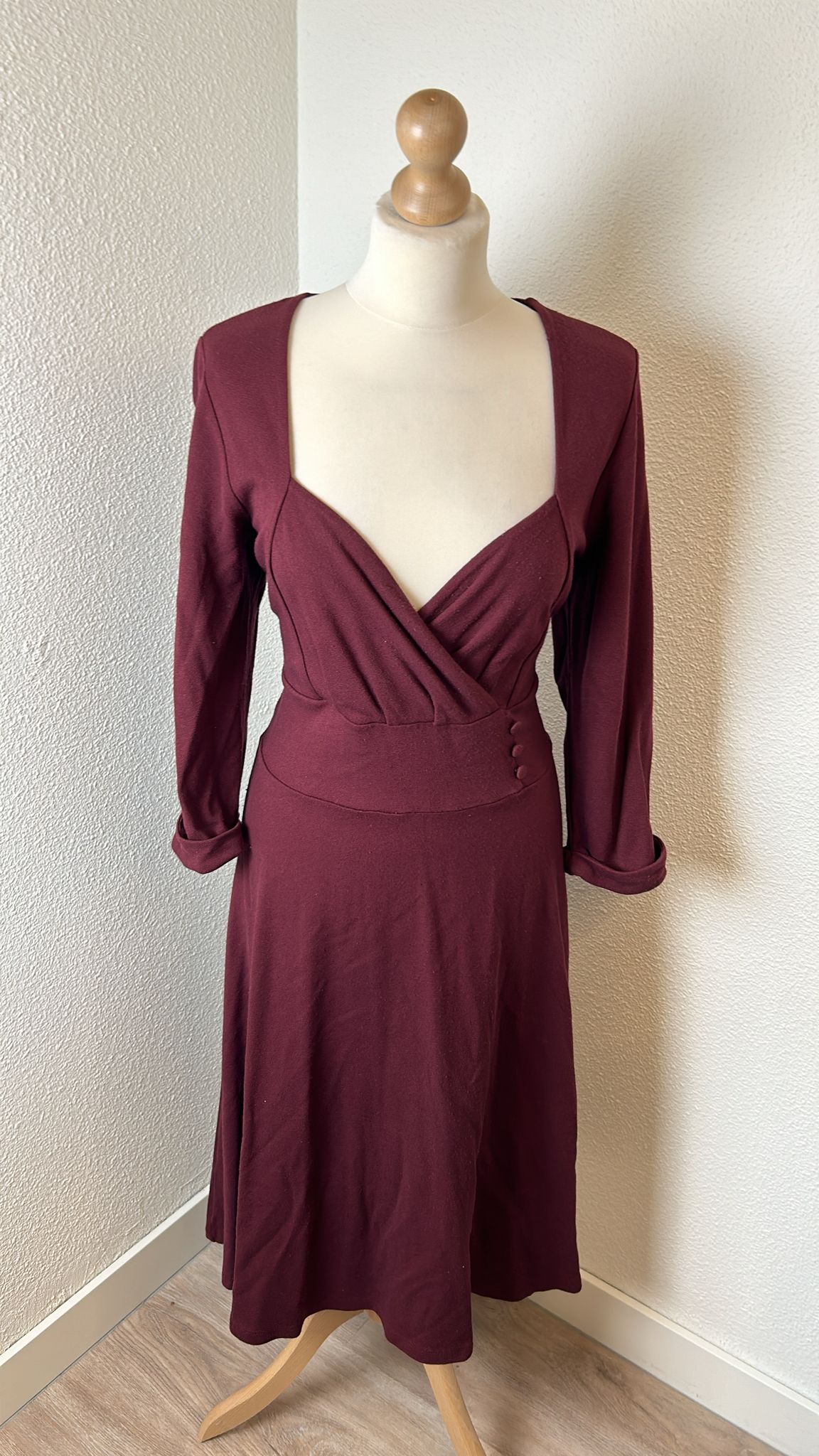 - Hartvormige halslijn, lange mouwen, taille met stoffen knoopjes