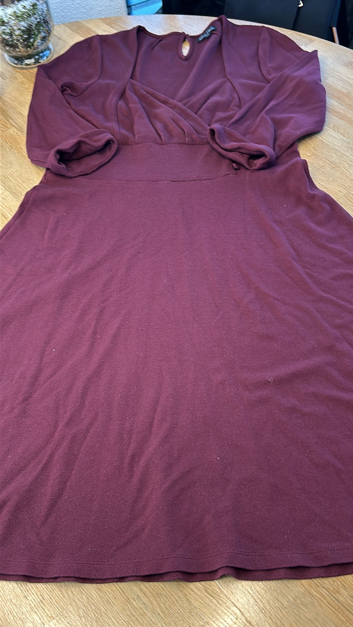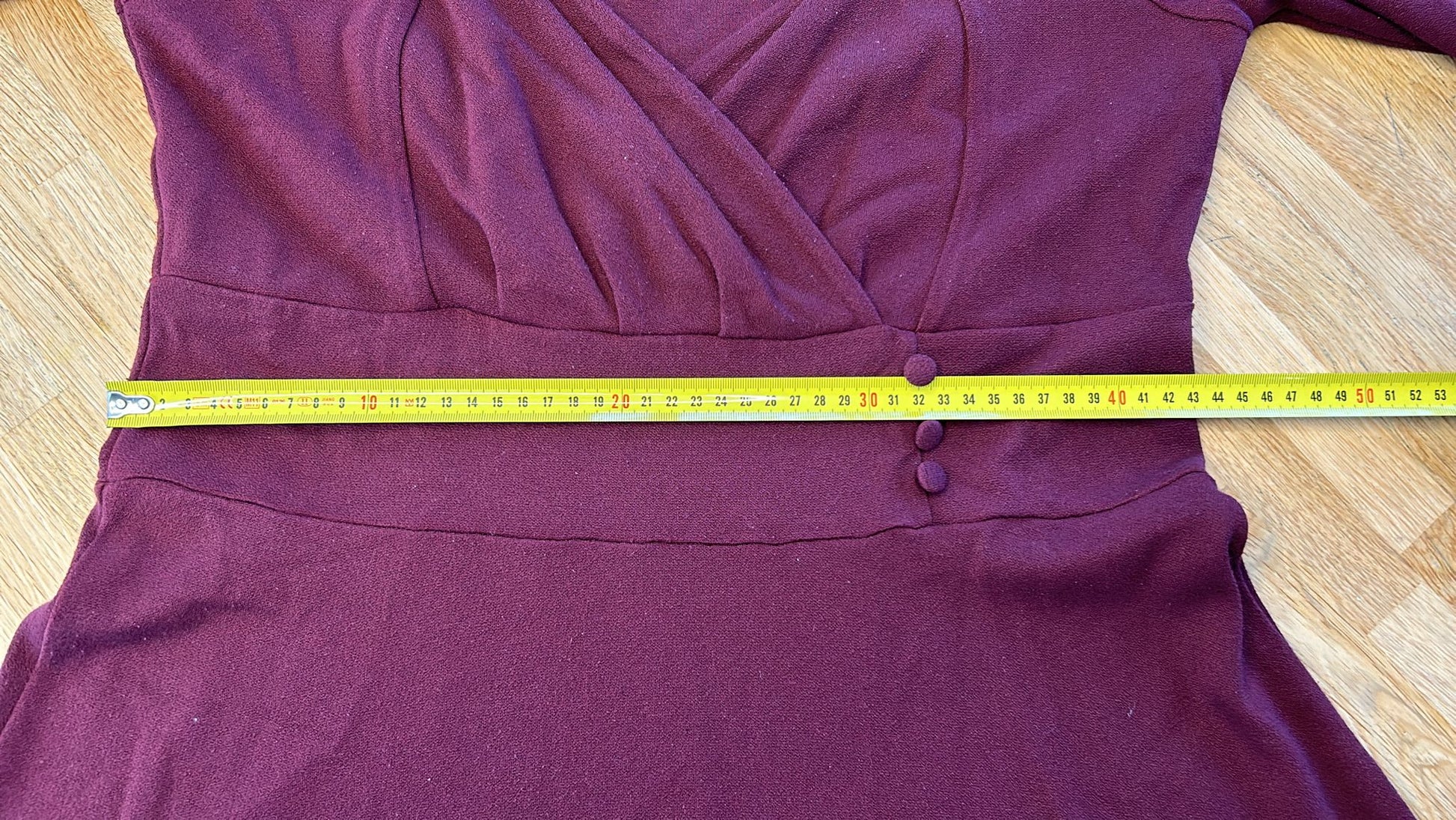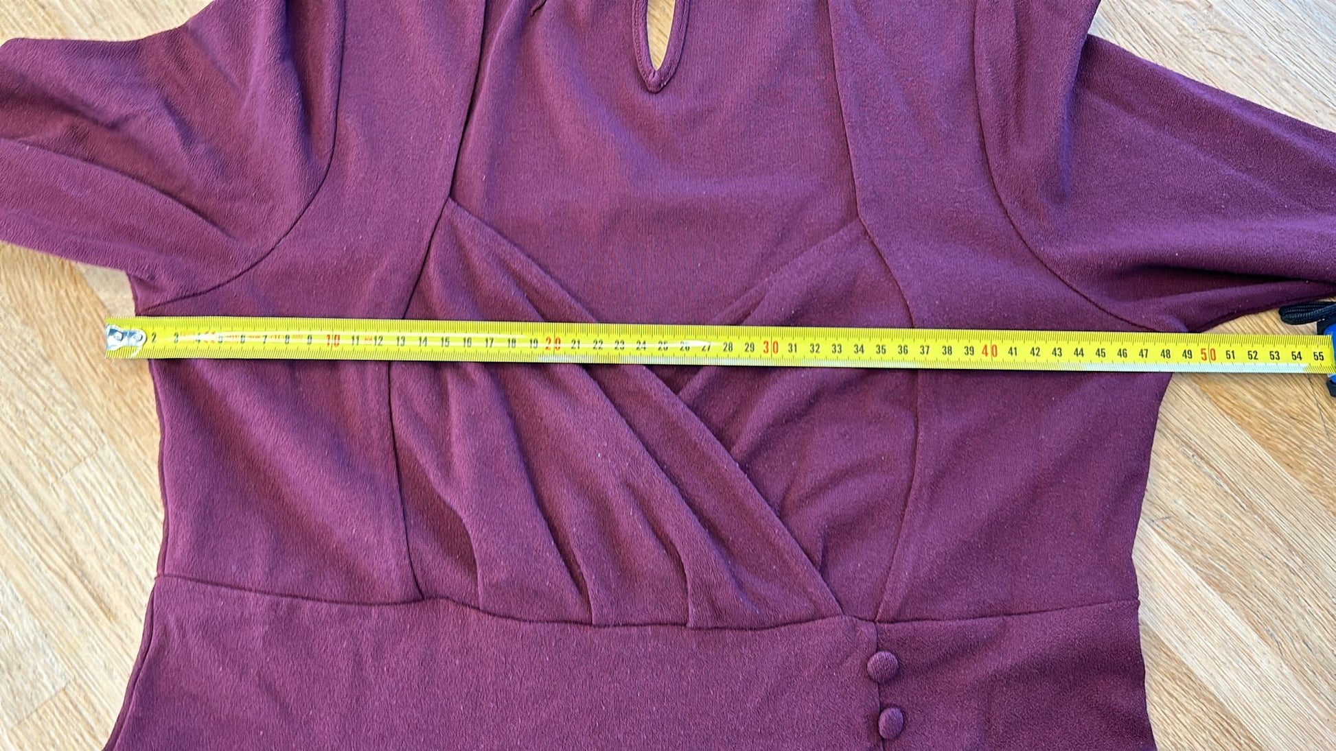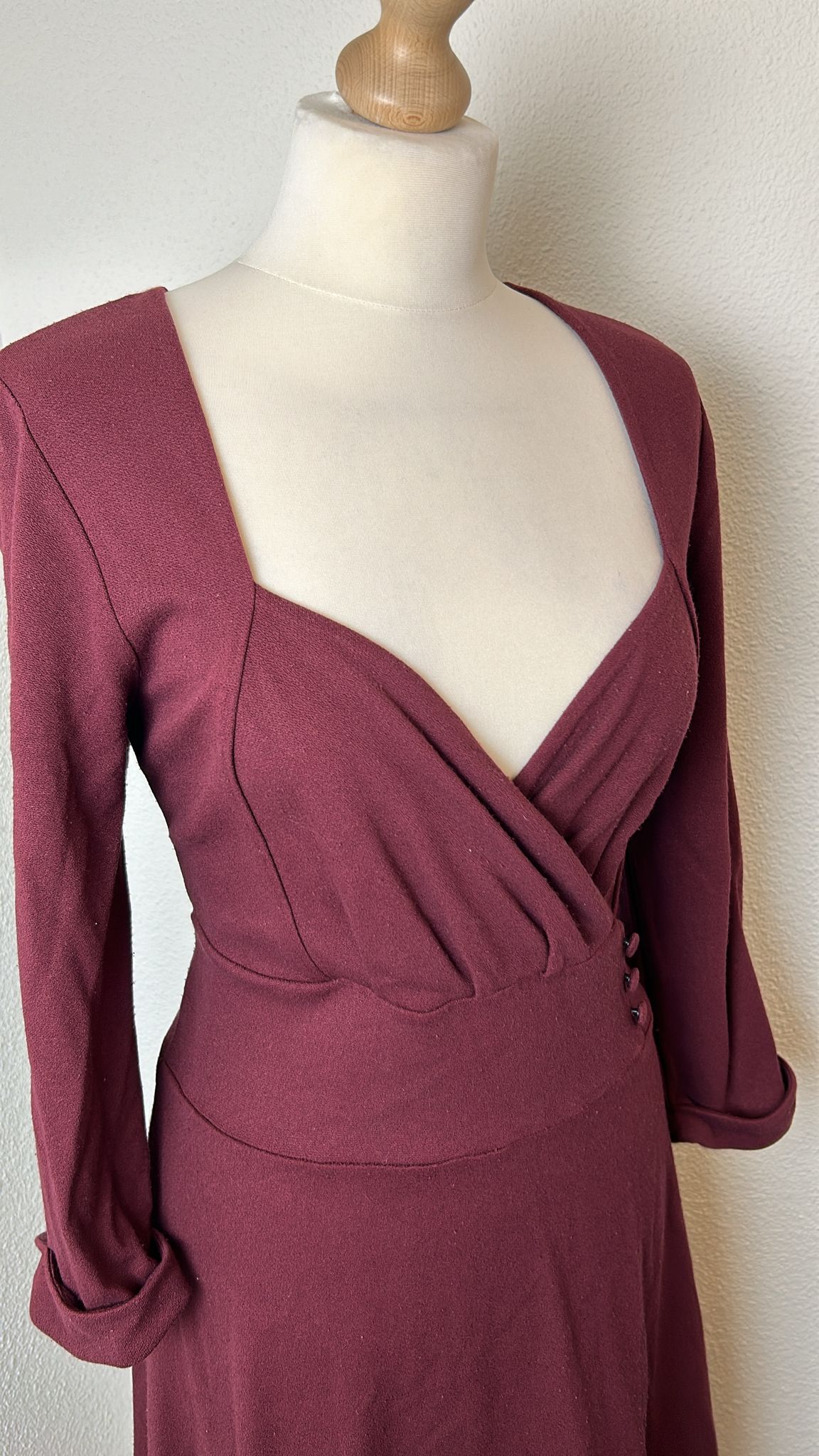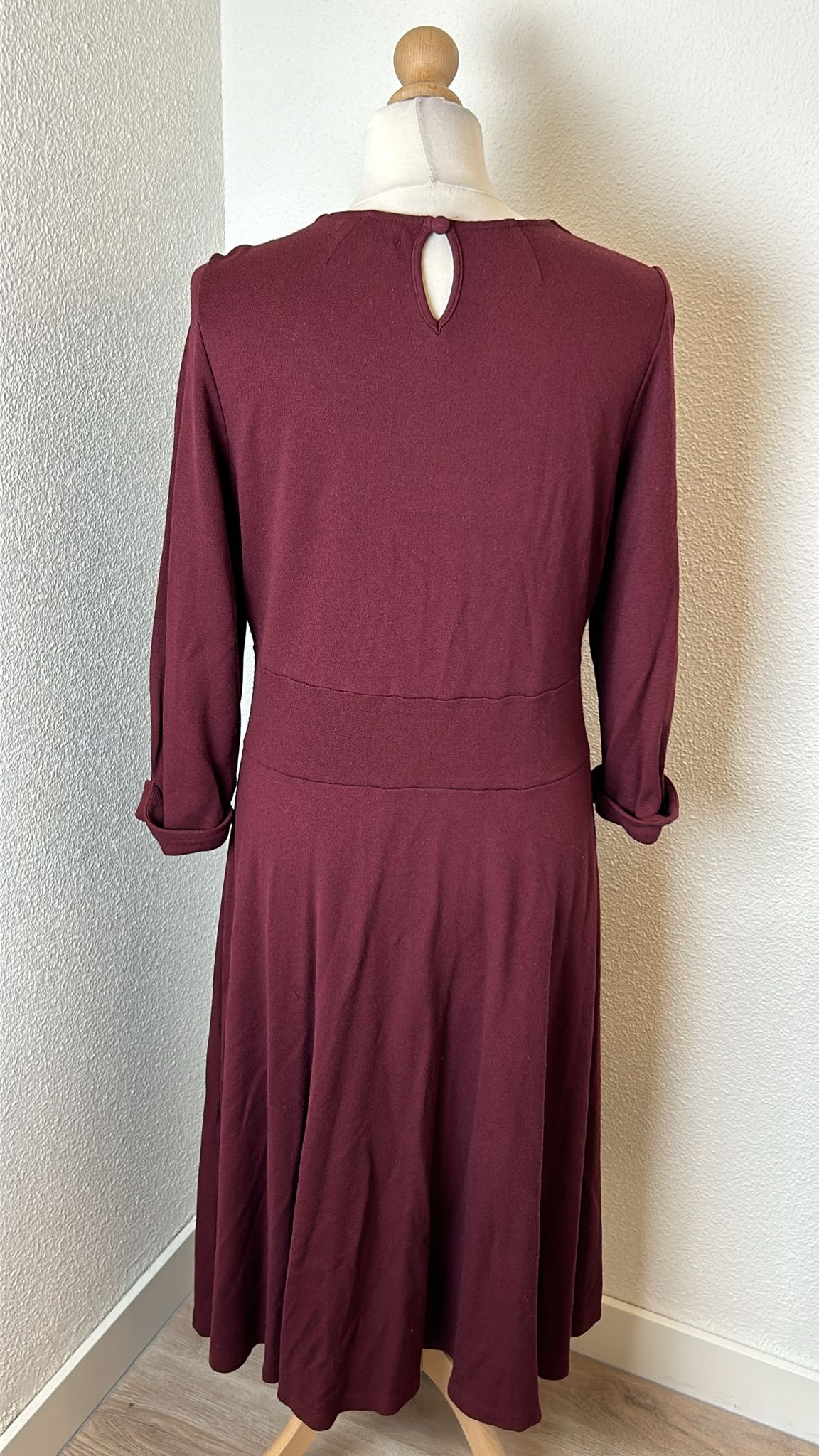 - Hartvormige halslijn, lange mouwen, taille met stoffen knoopjes