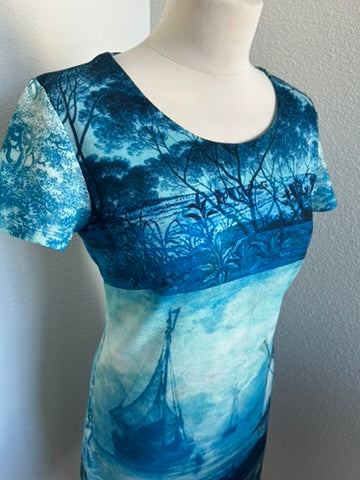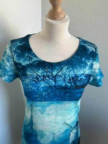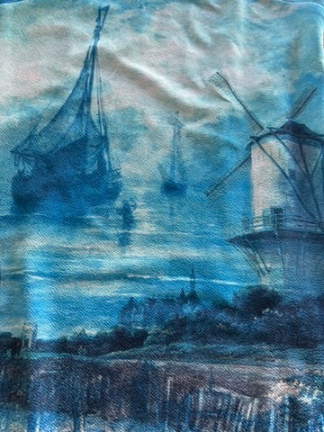 - Turquoise blauw met donkerblauw en lichtblauwe Hollandse print van boot en molen