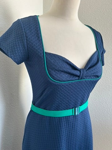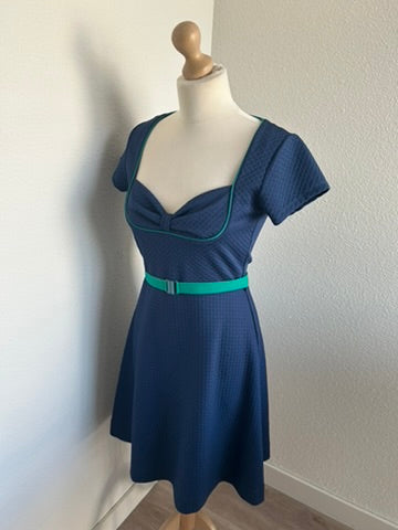 - Mooie hartvormige halslijn, korte mouwen, riempje rond het middel