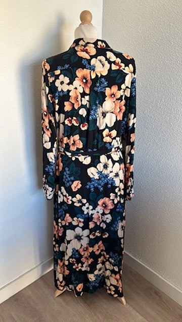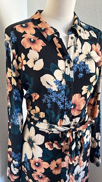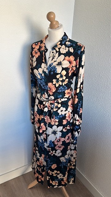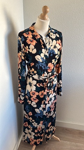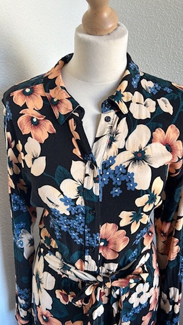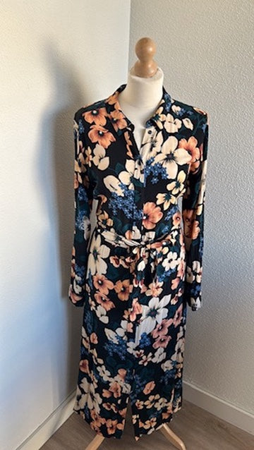- Blouse jurk met knoopjes tot onder, kraagje, lange mouwen, elastische taille met knooplint, steekzakken