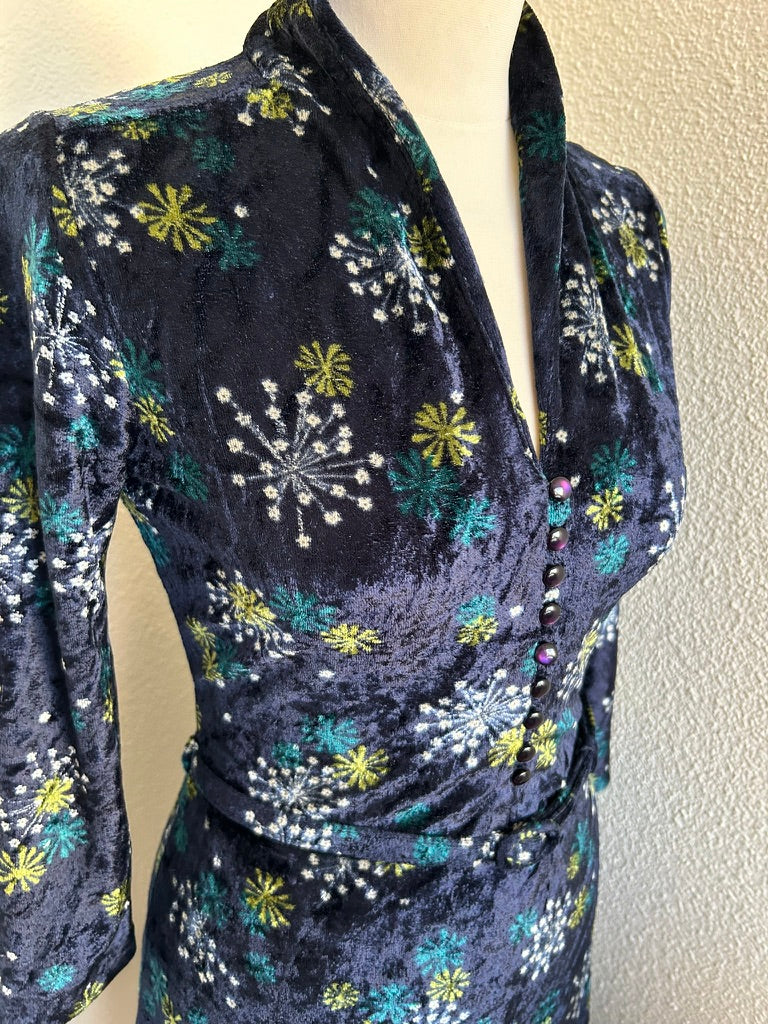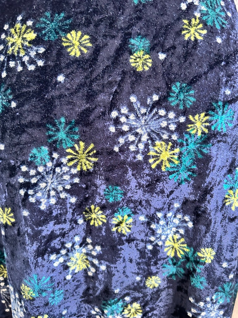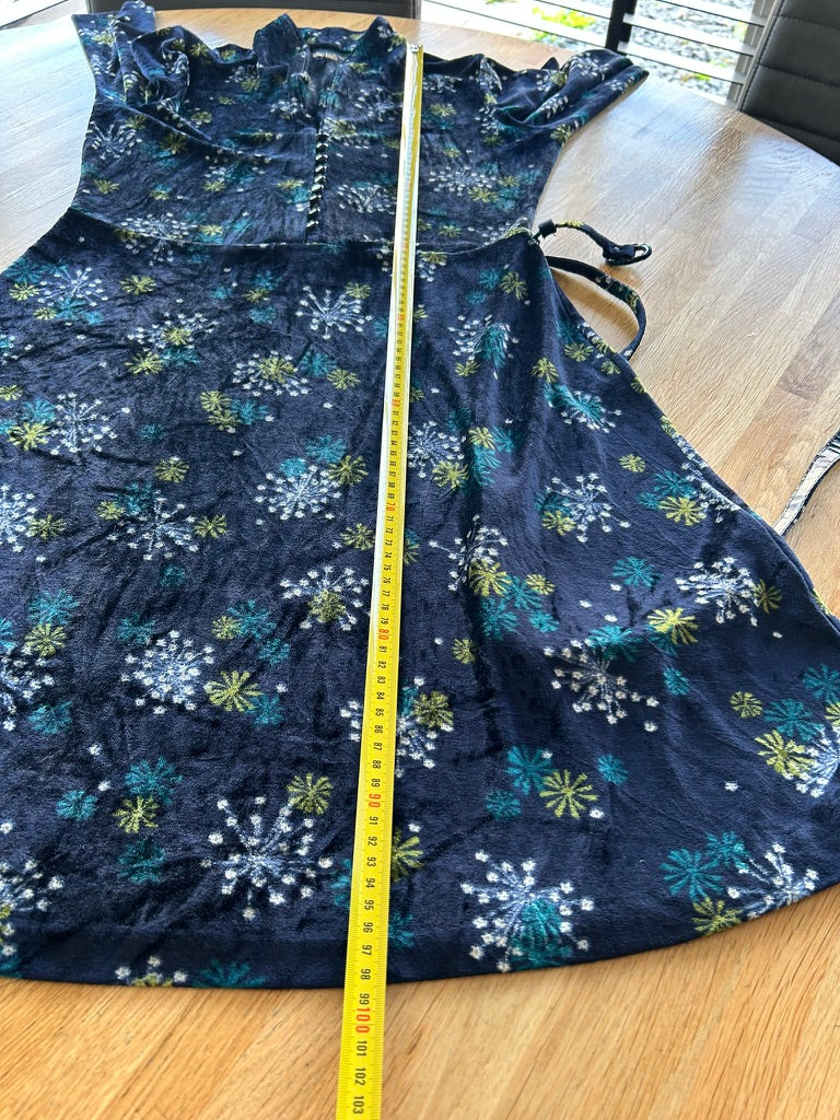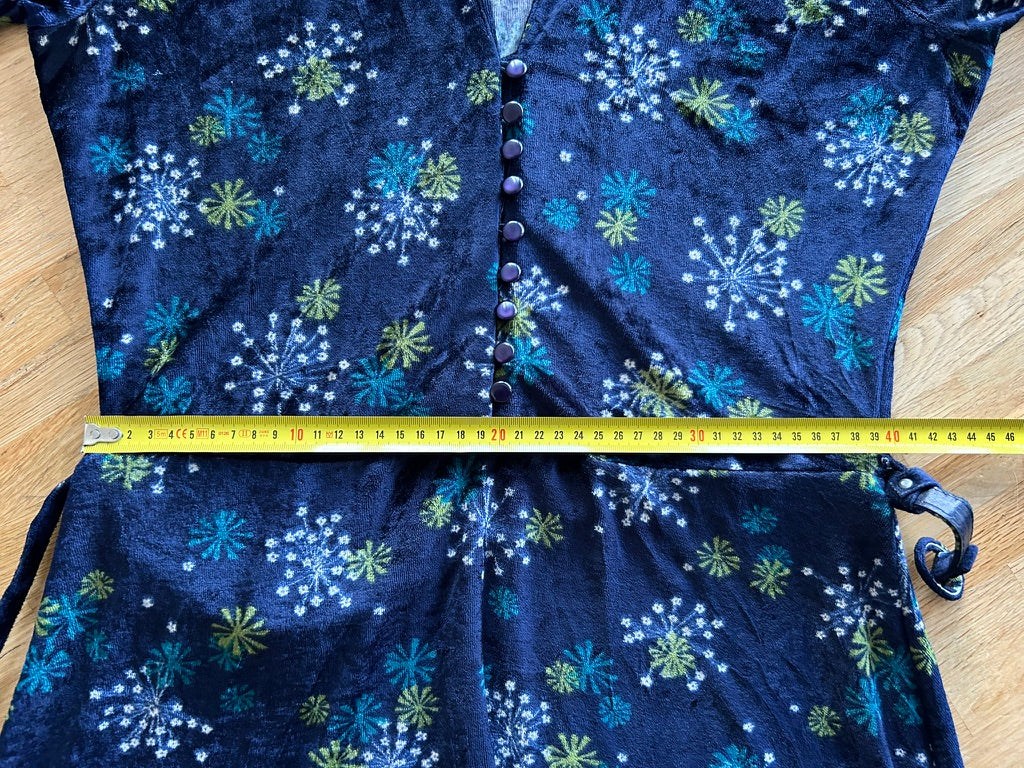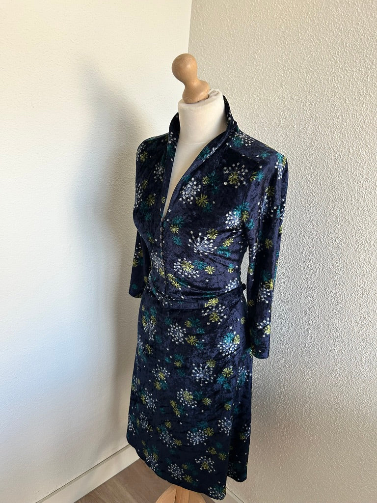 - Leuke jurk in donkerblauw/marine met bloemen/vuurwerk retro print in wit geel en blauw