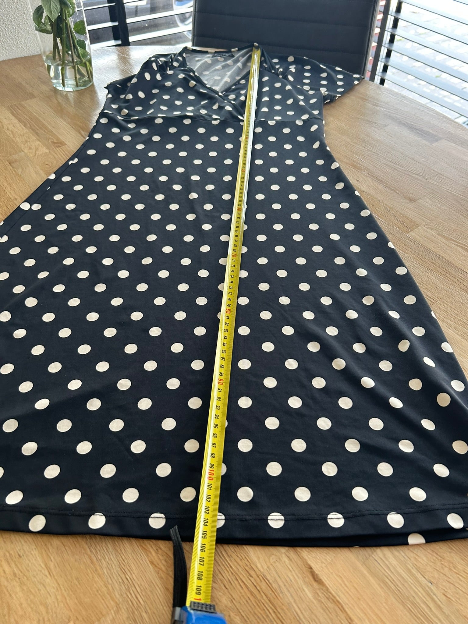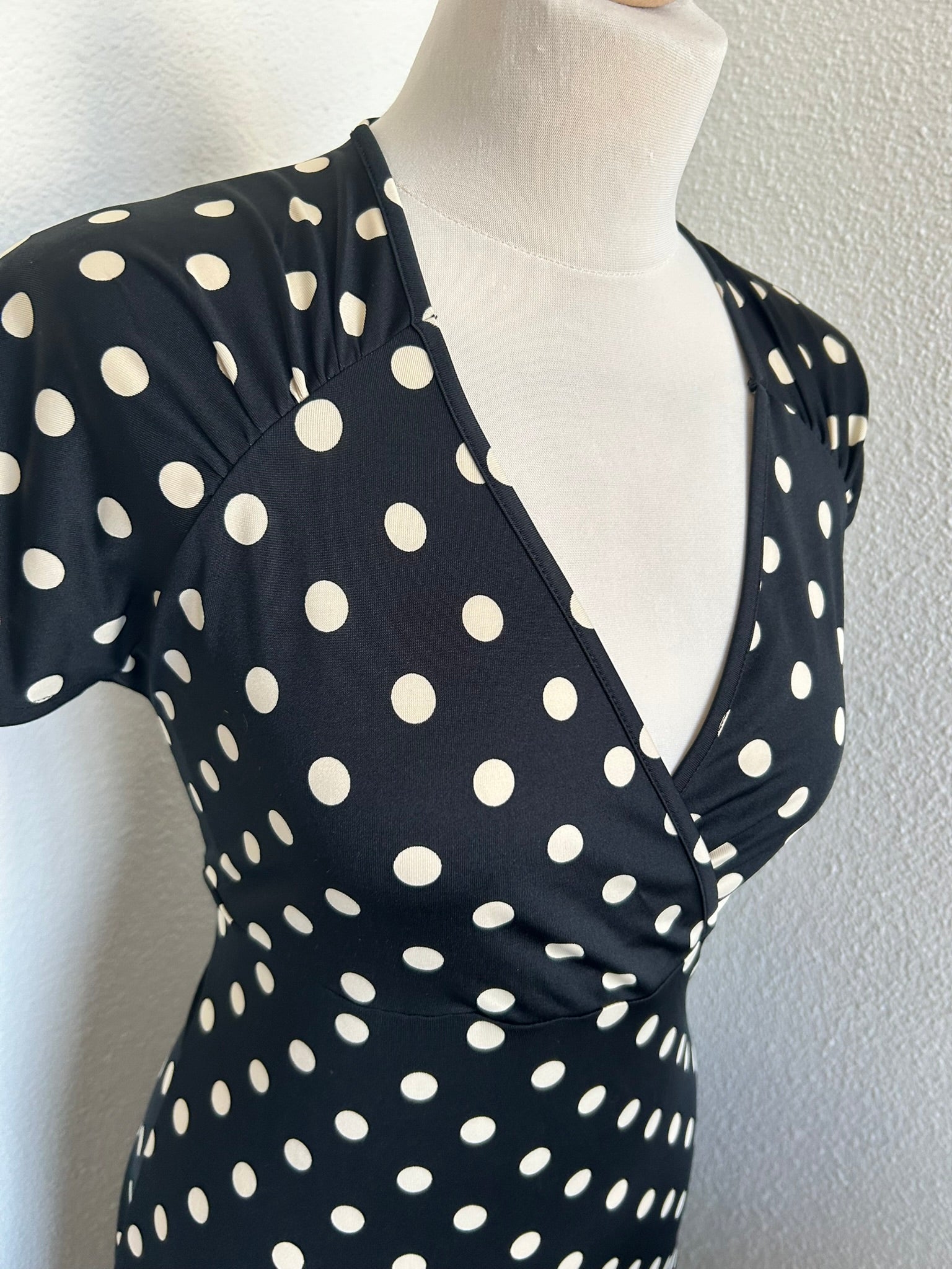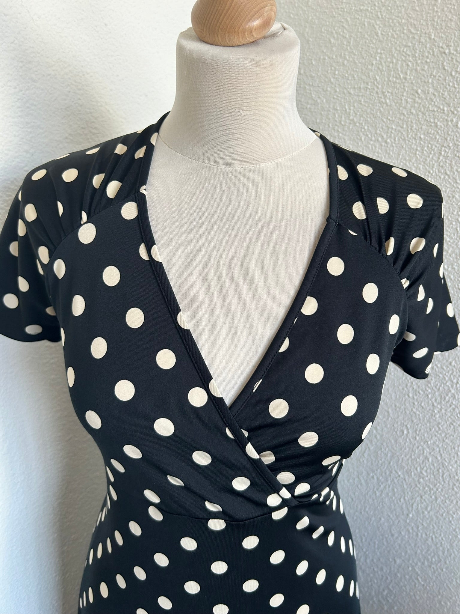 - Zwarte jurk met creme witte stippen print