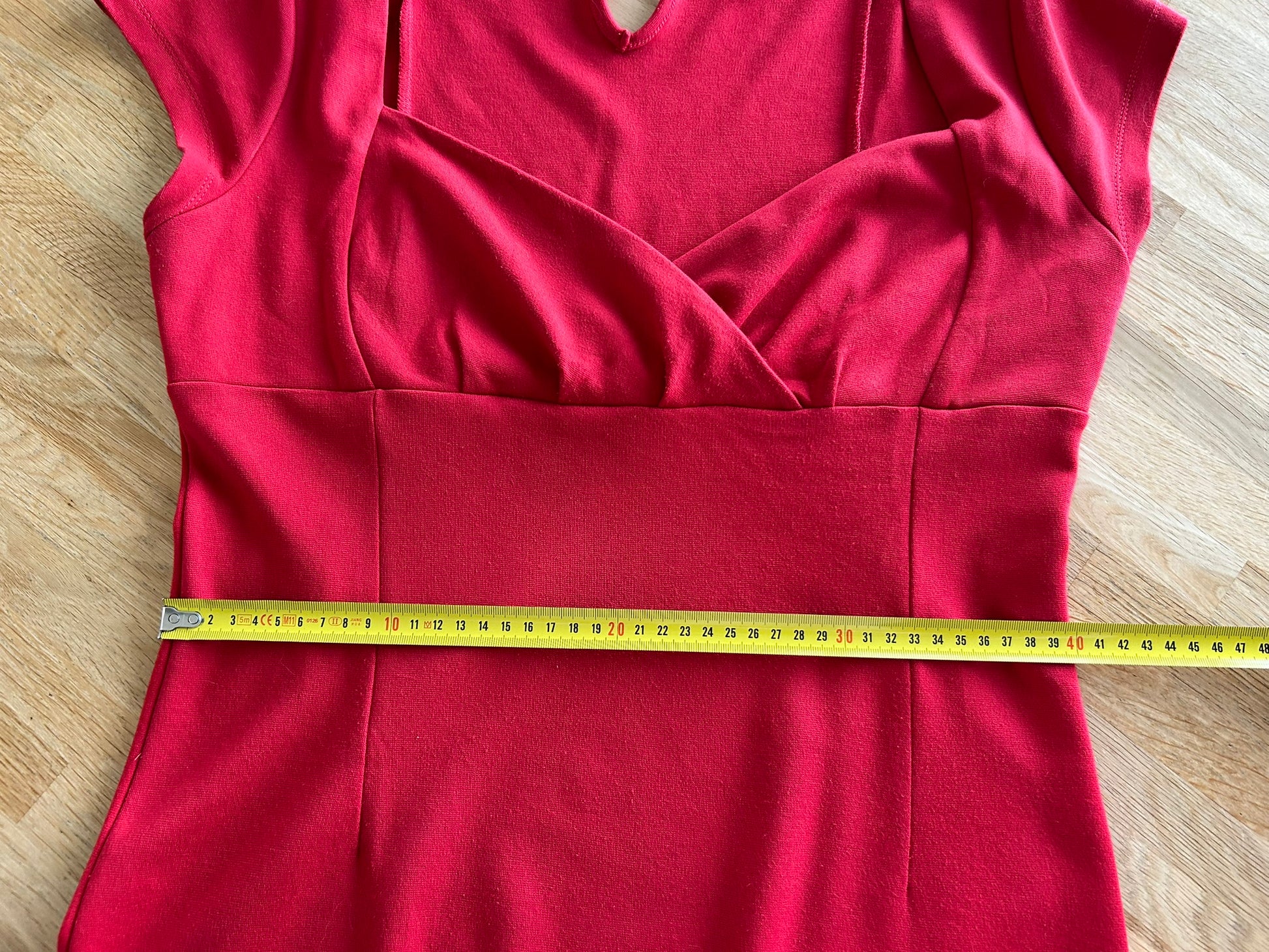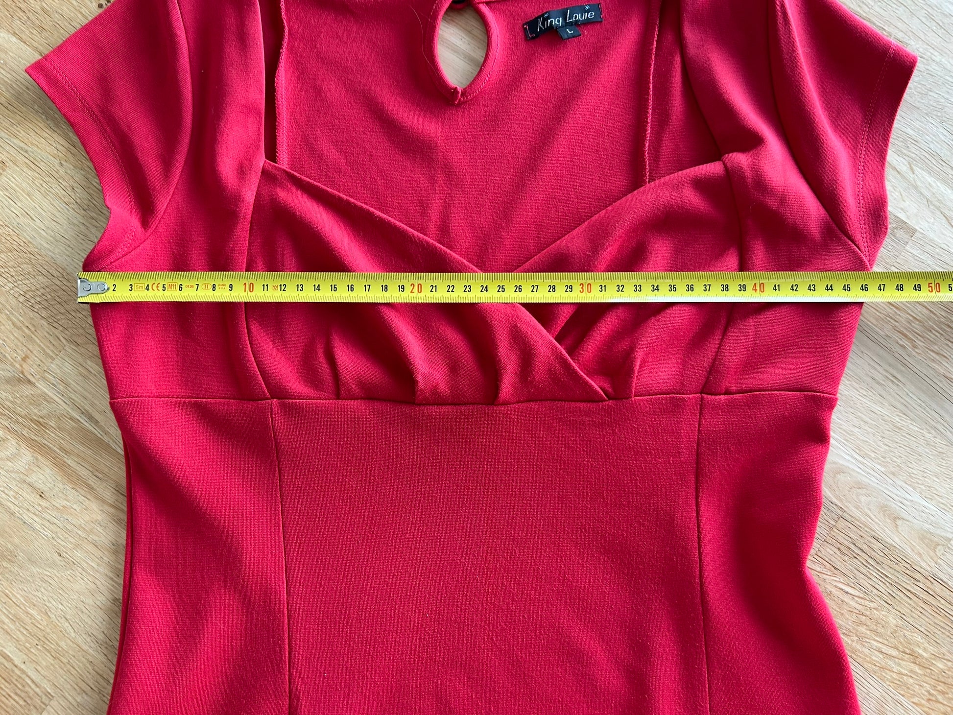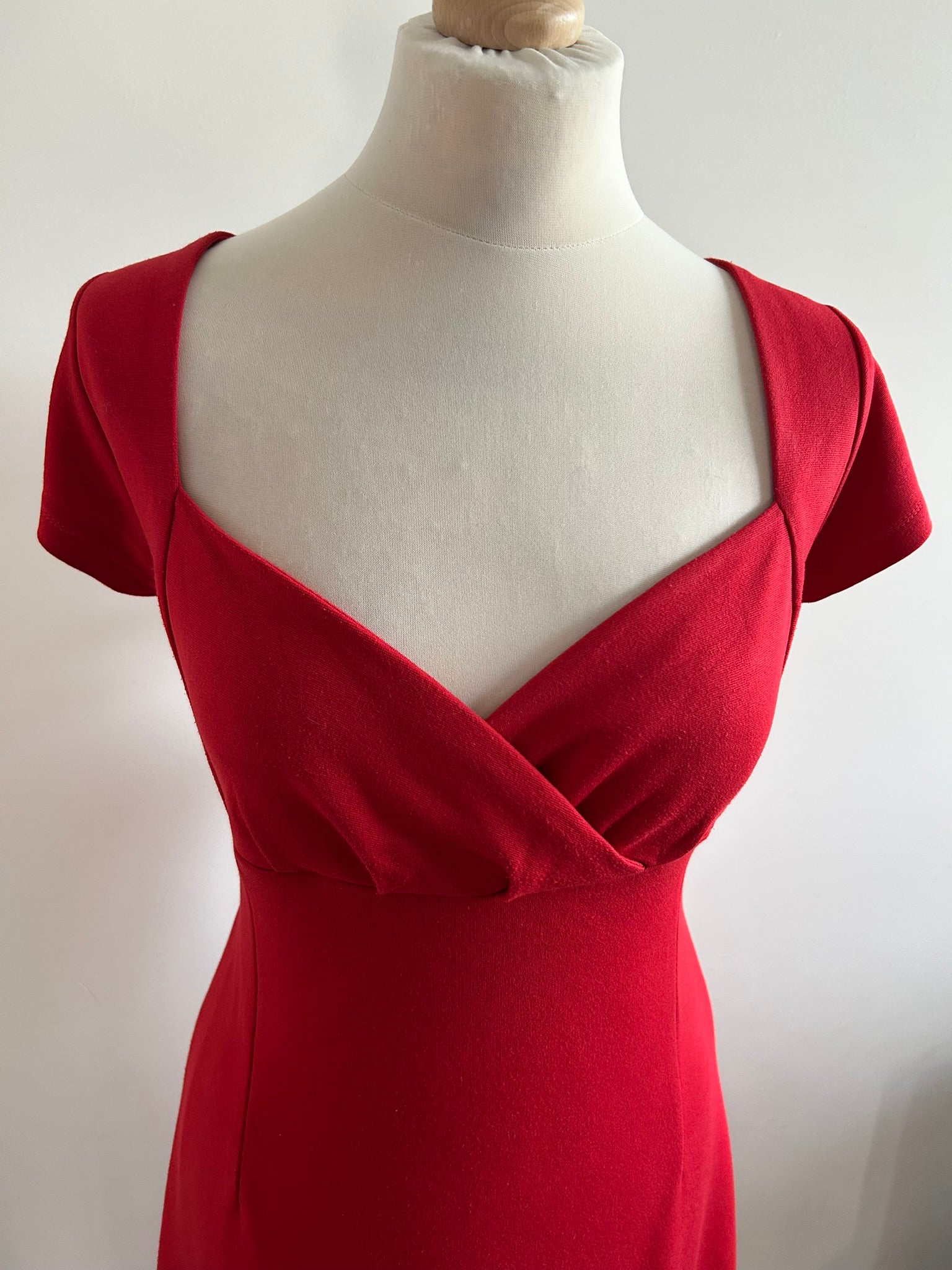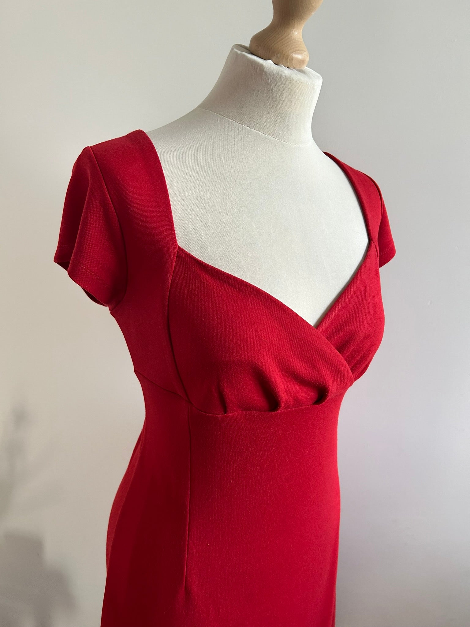 - Hartvormige overslag op de borst, korte mouwen, hoog getailleerd, lockhole met knopje in de nek