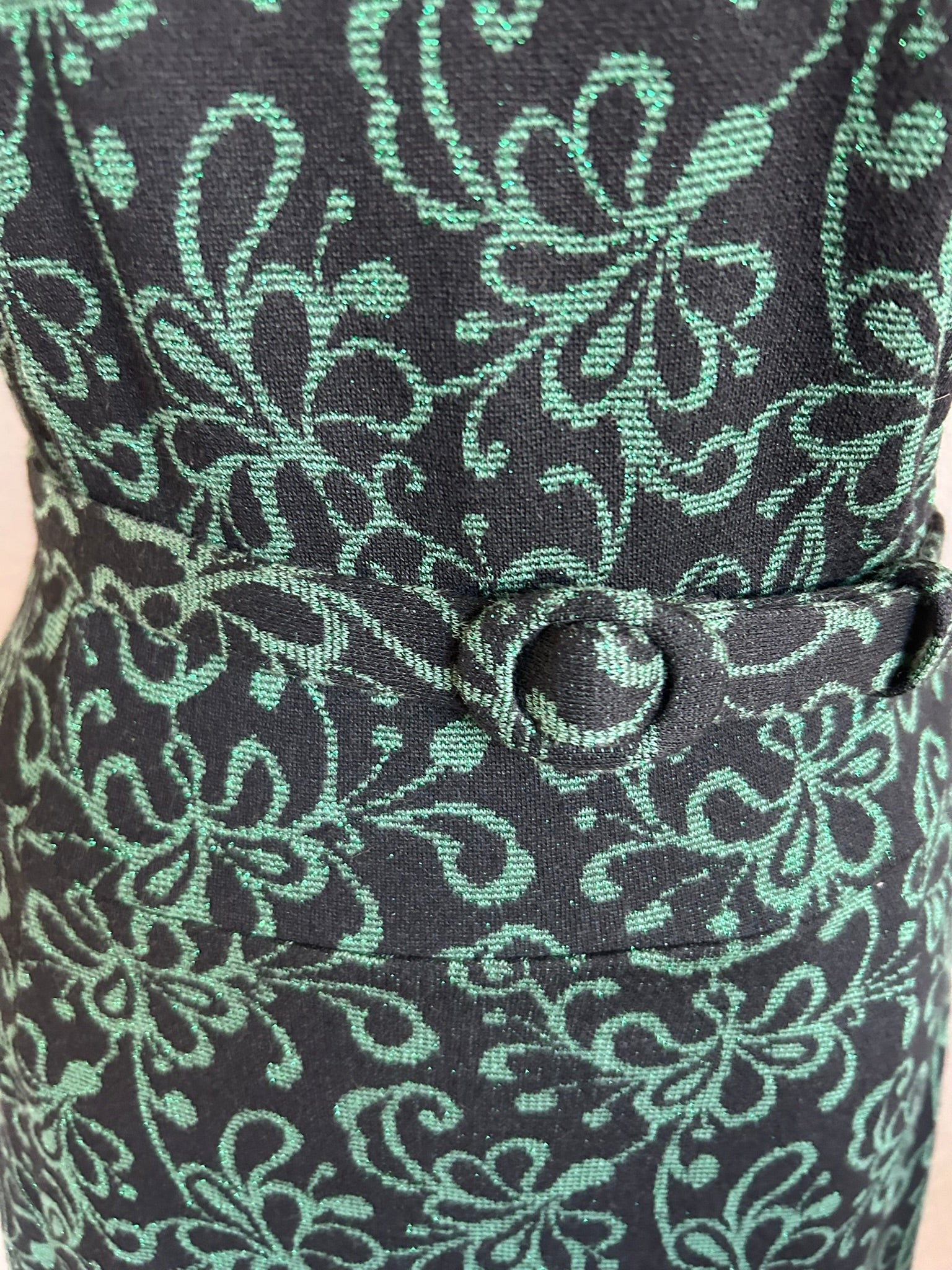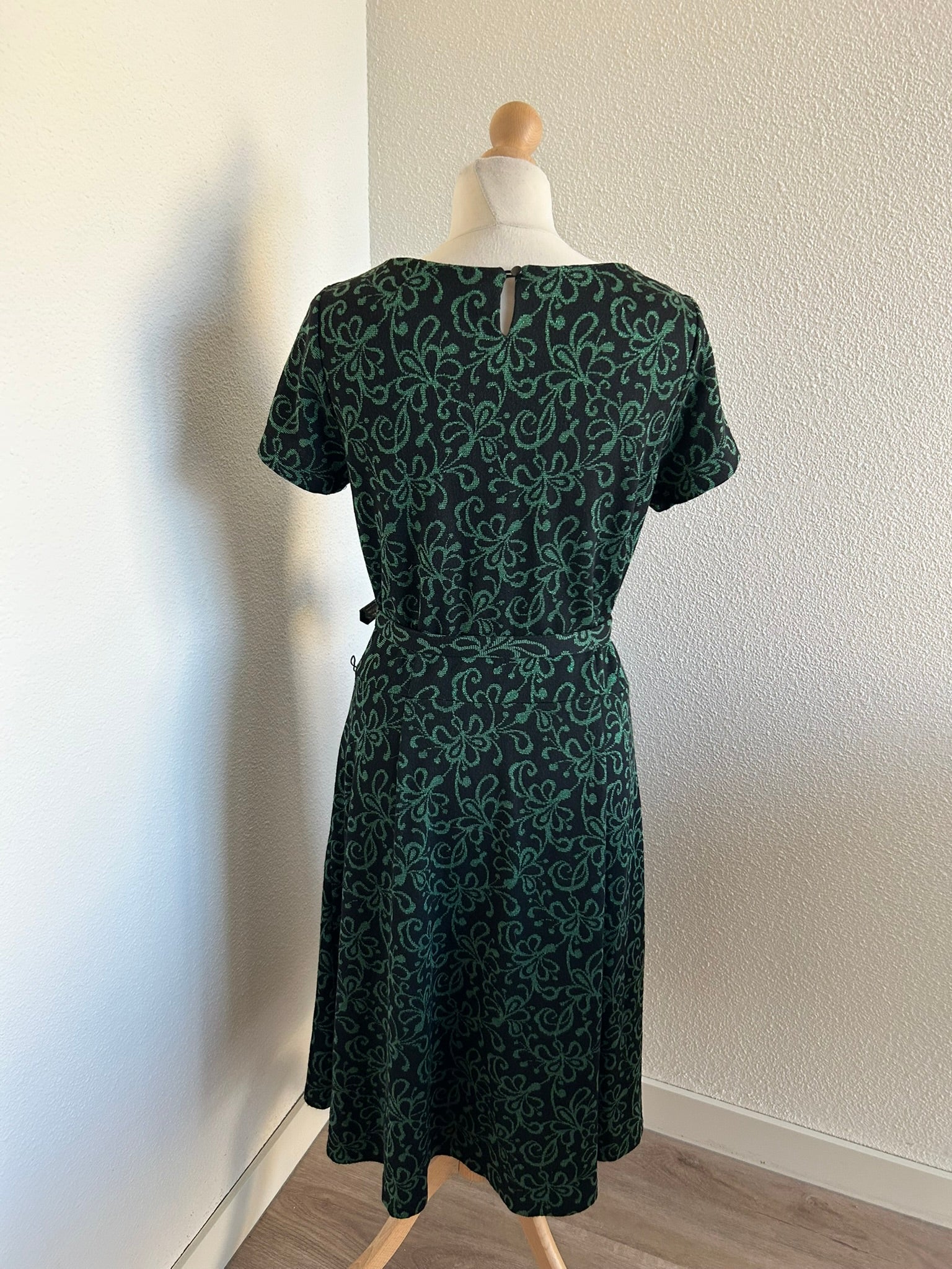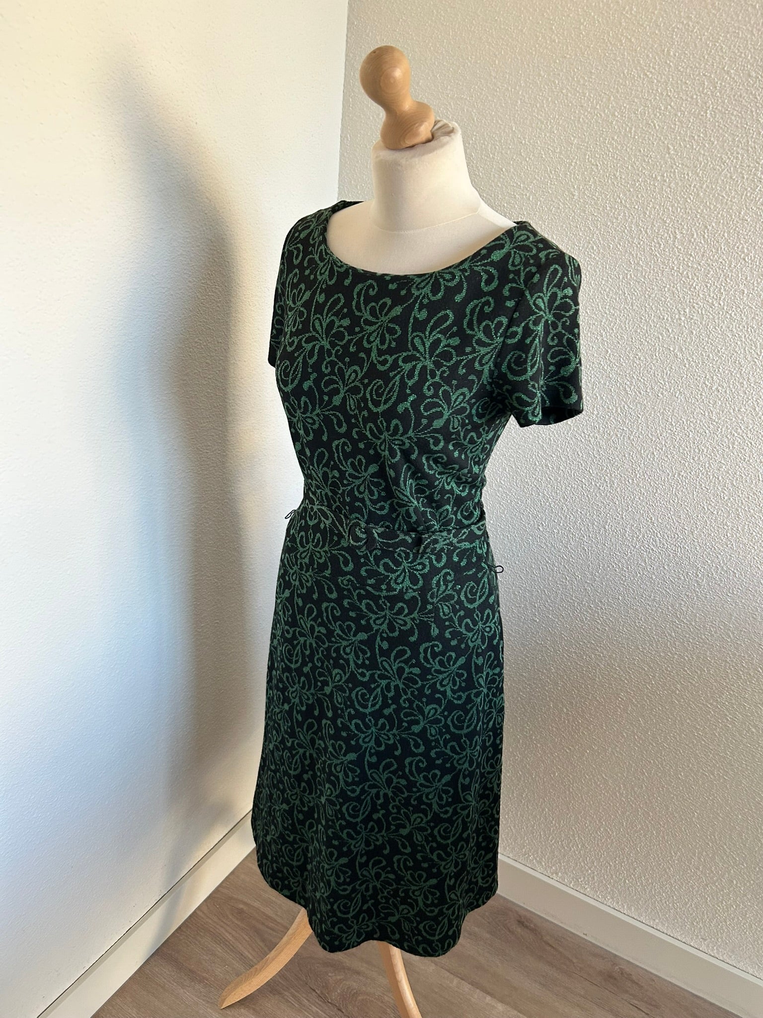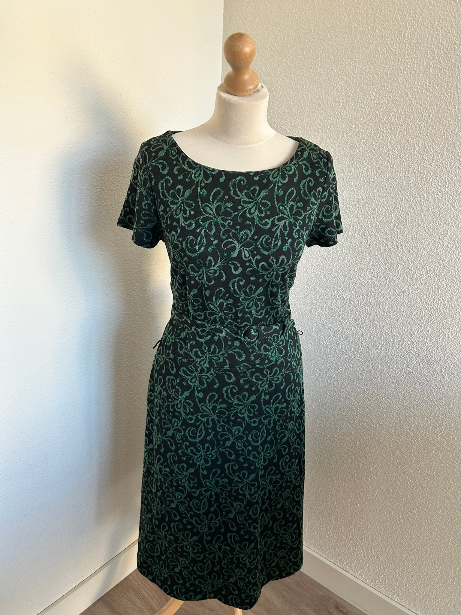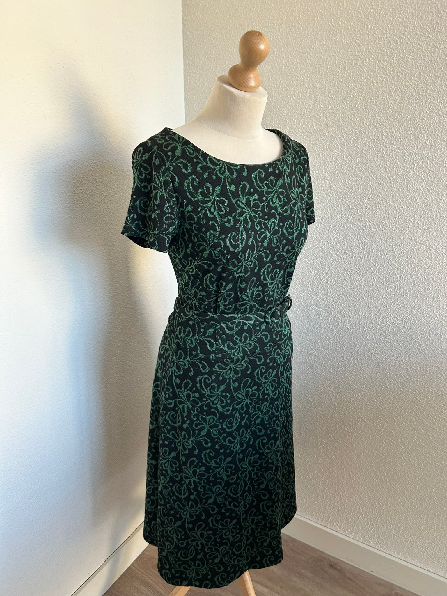 - Mooie boot-halslijn, lockhole in de nek met knoopje, korte mouwen, getailleerd met uitlopende rok en riempje