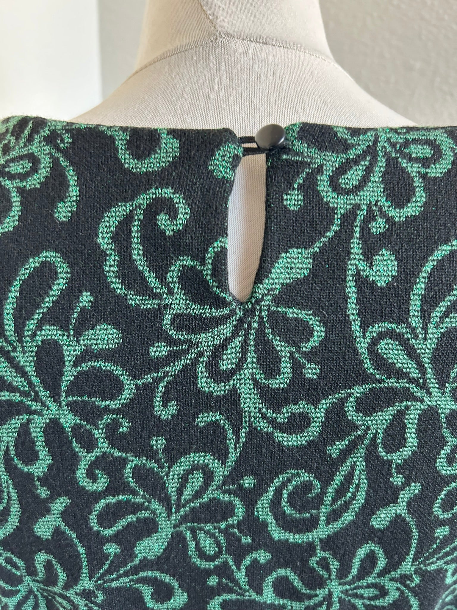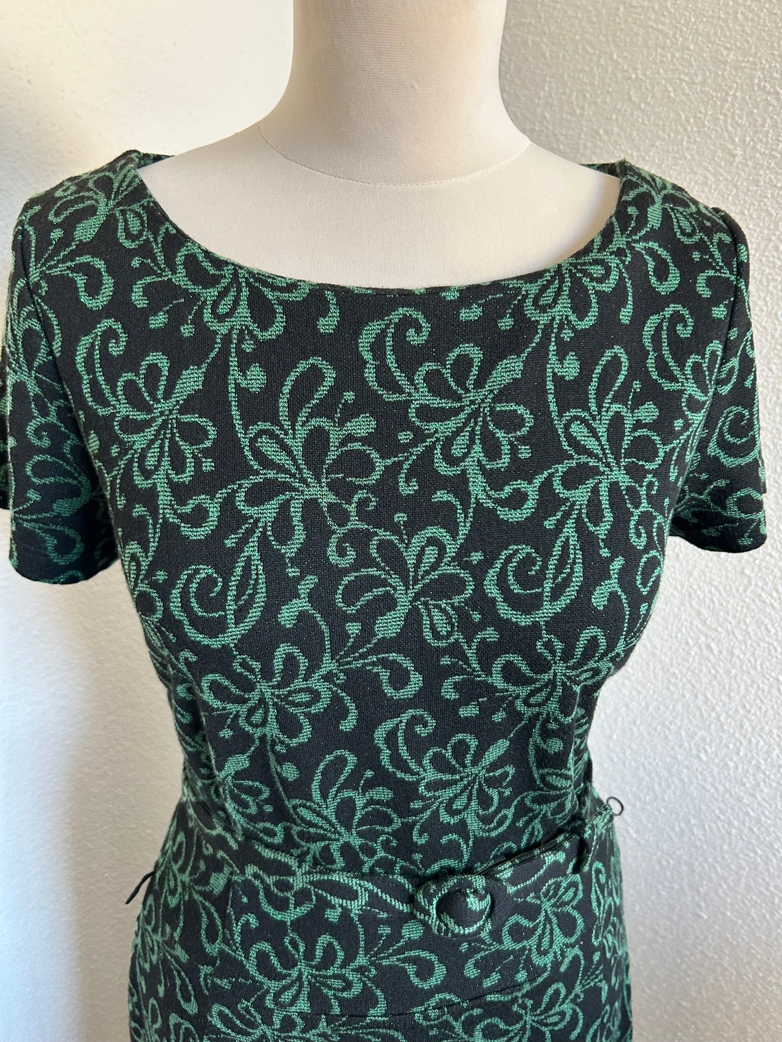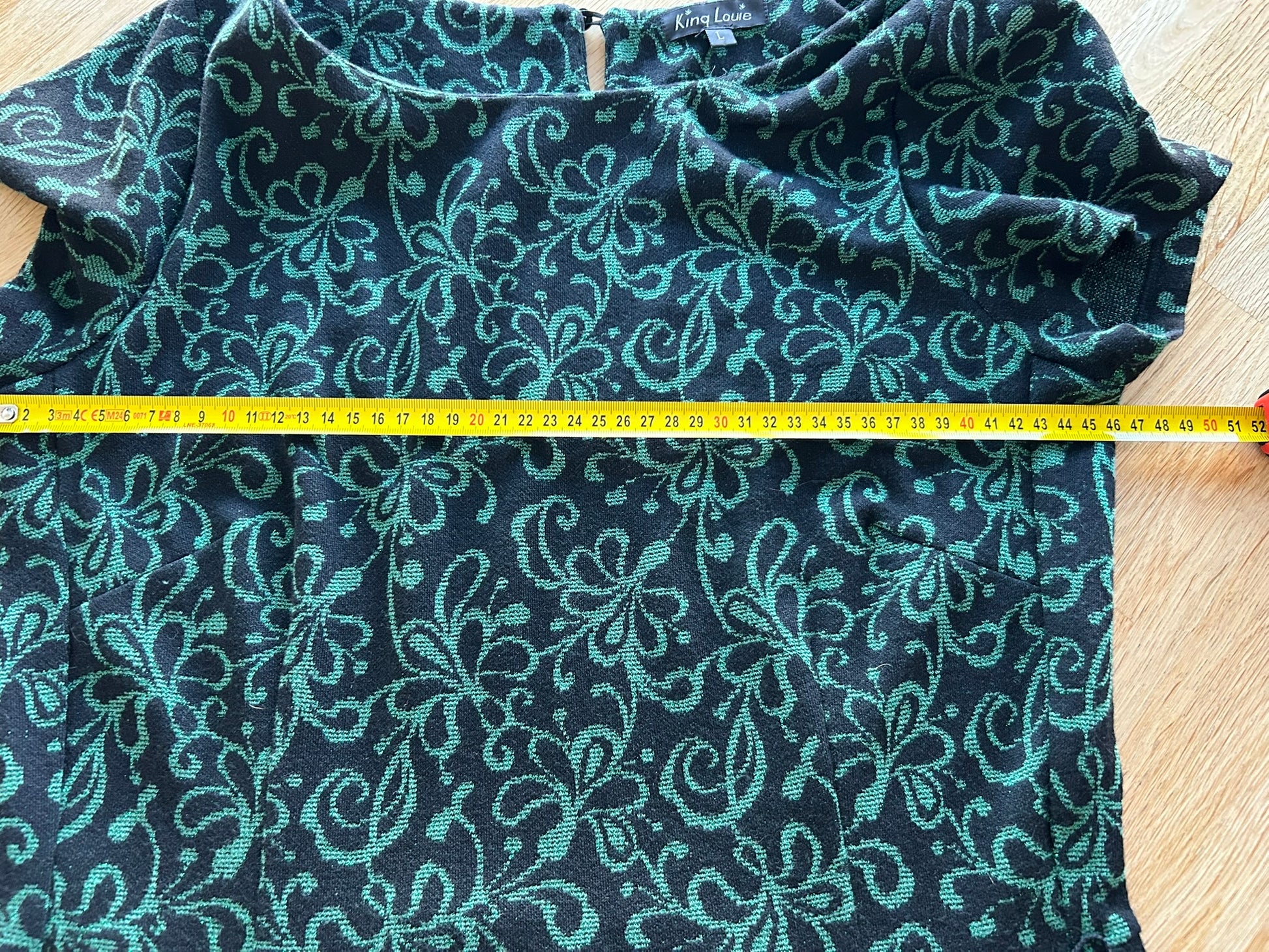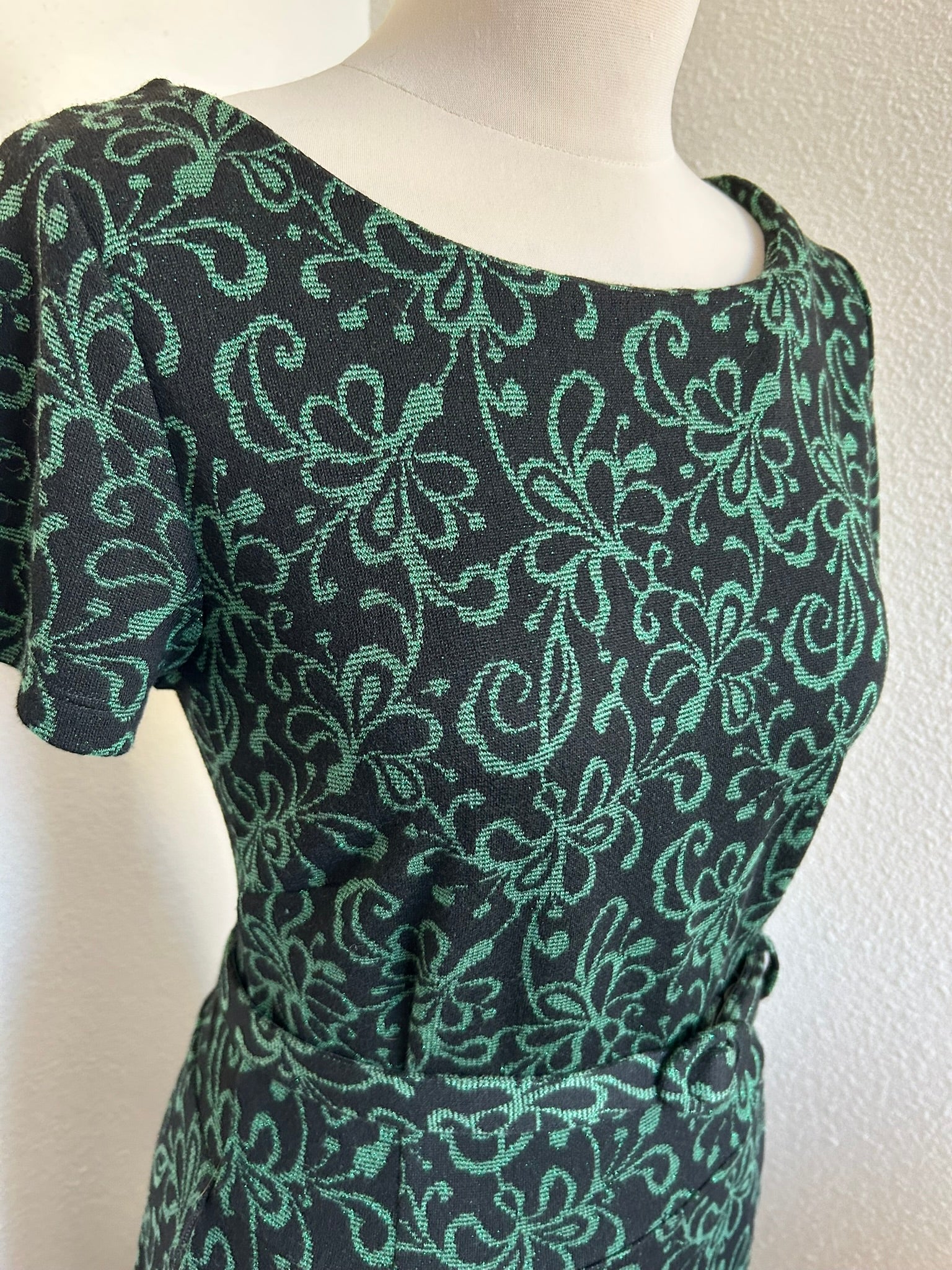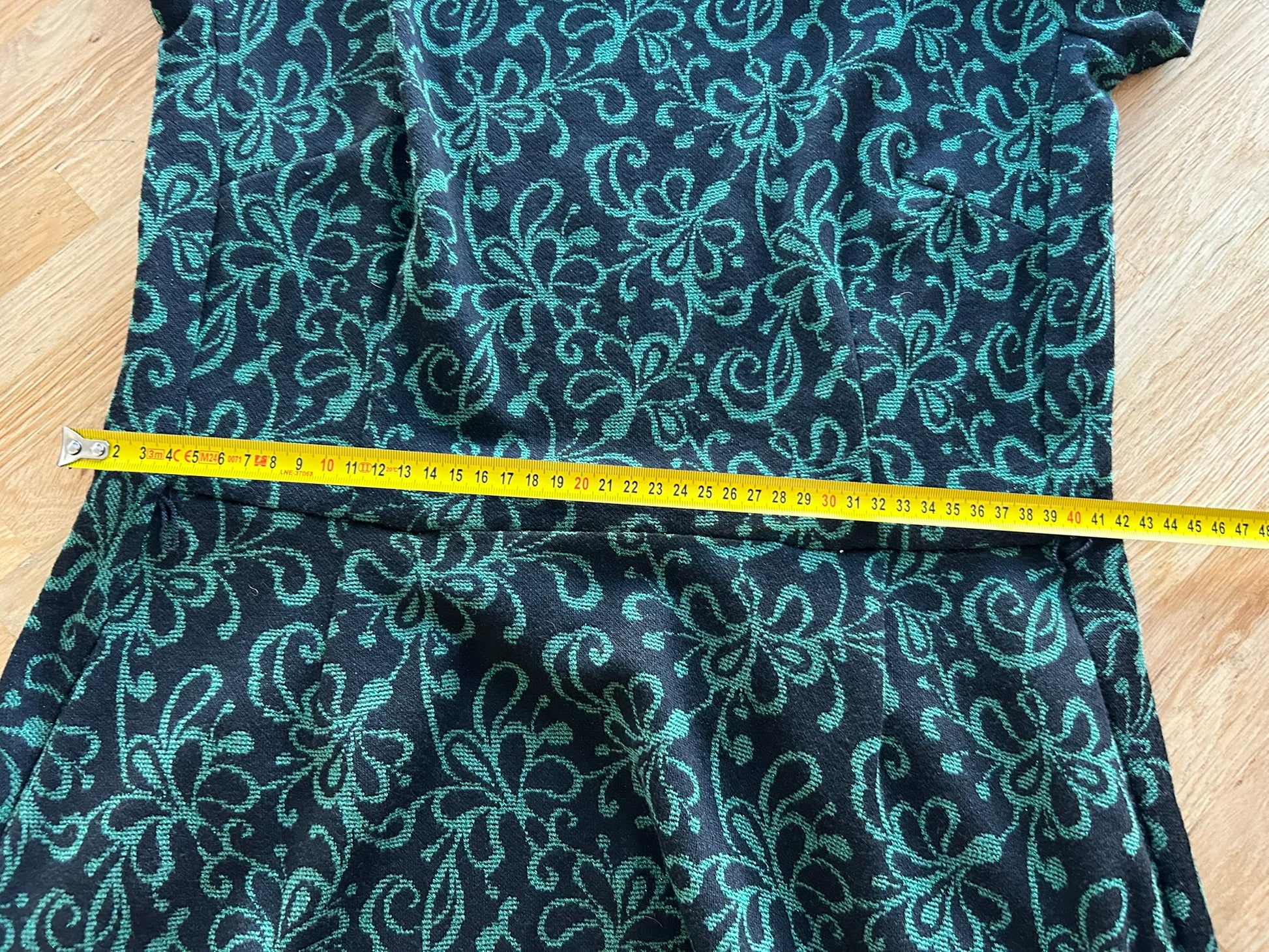 - Mooie boot-halslijn, lockhole in de nek met knoopje, korte mouwen, getailleerd met uitlopende rok en riempje
