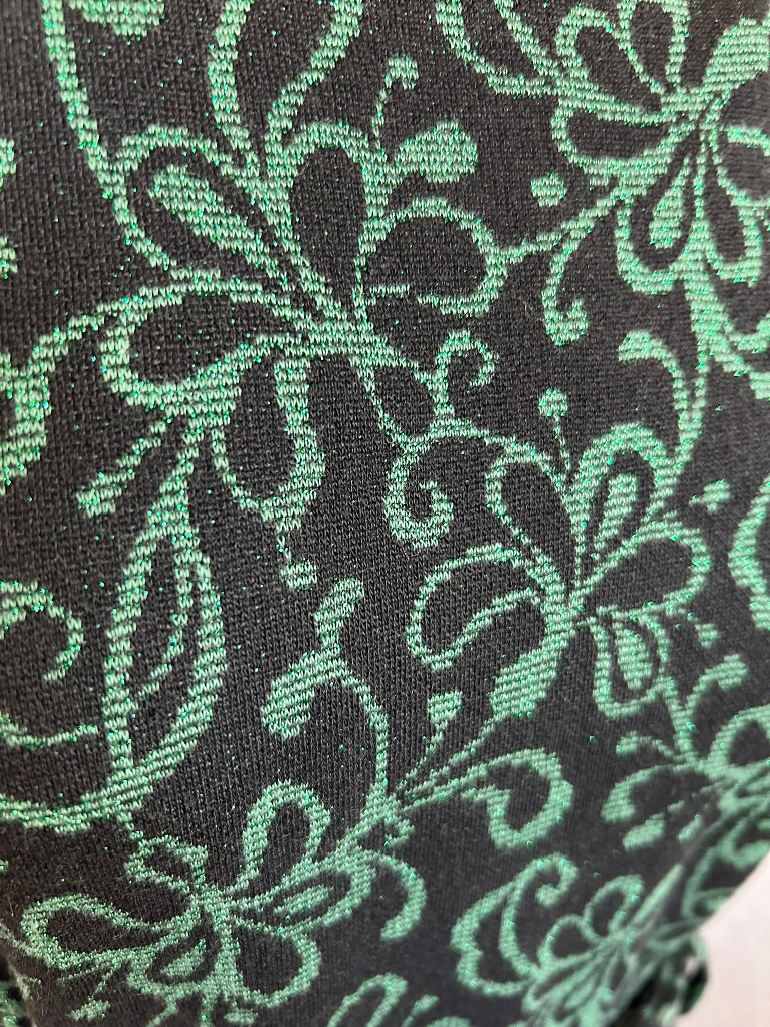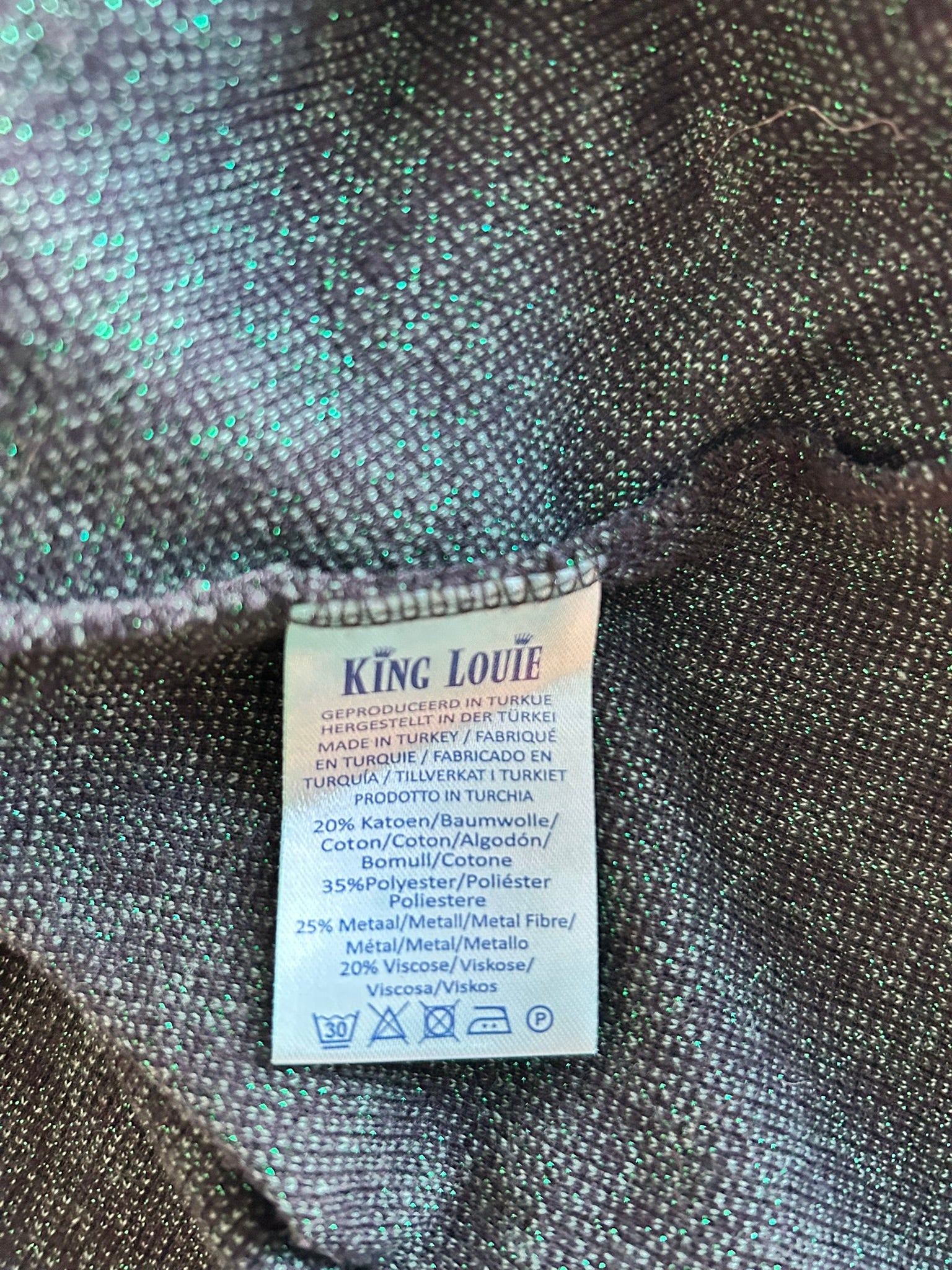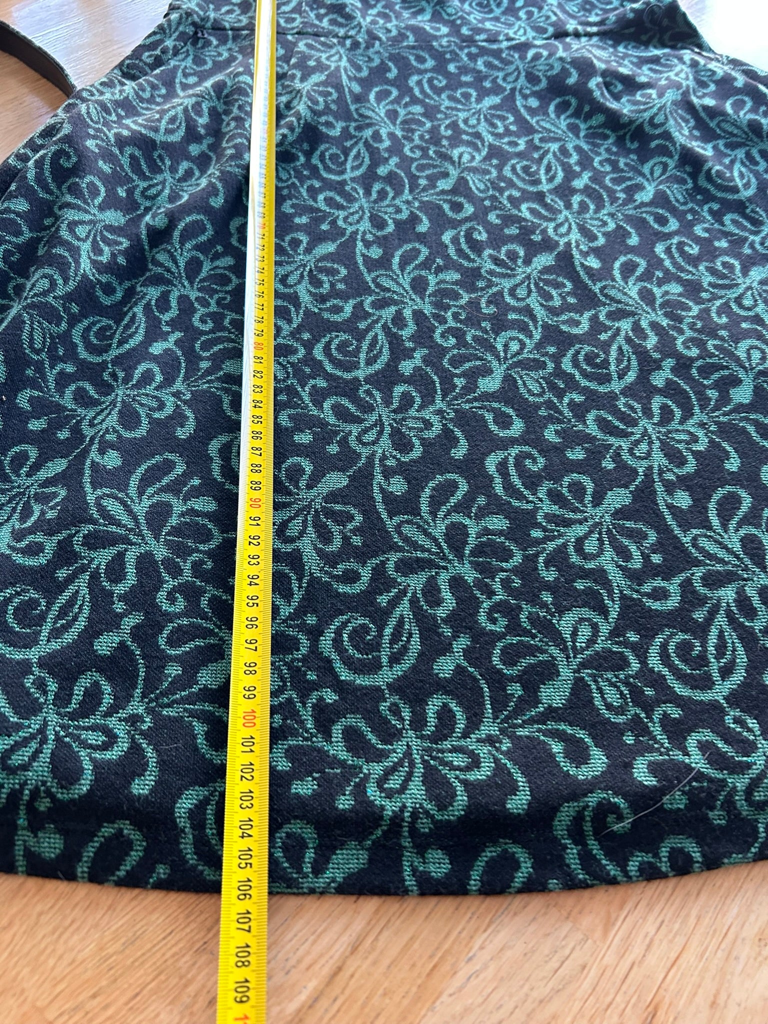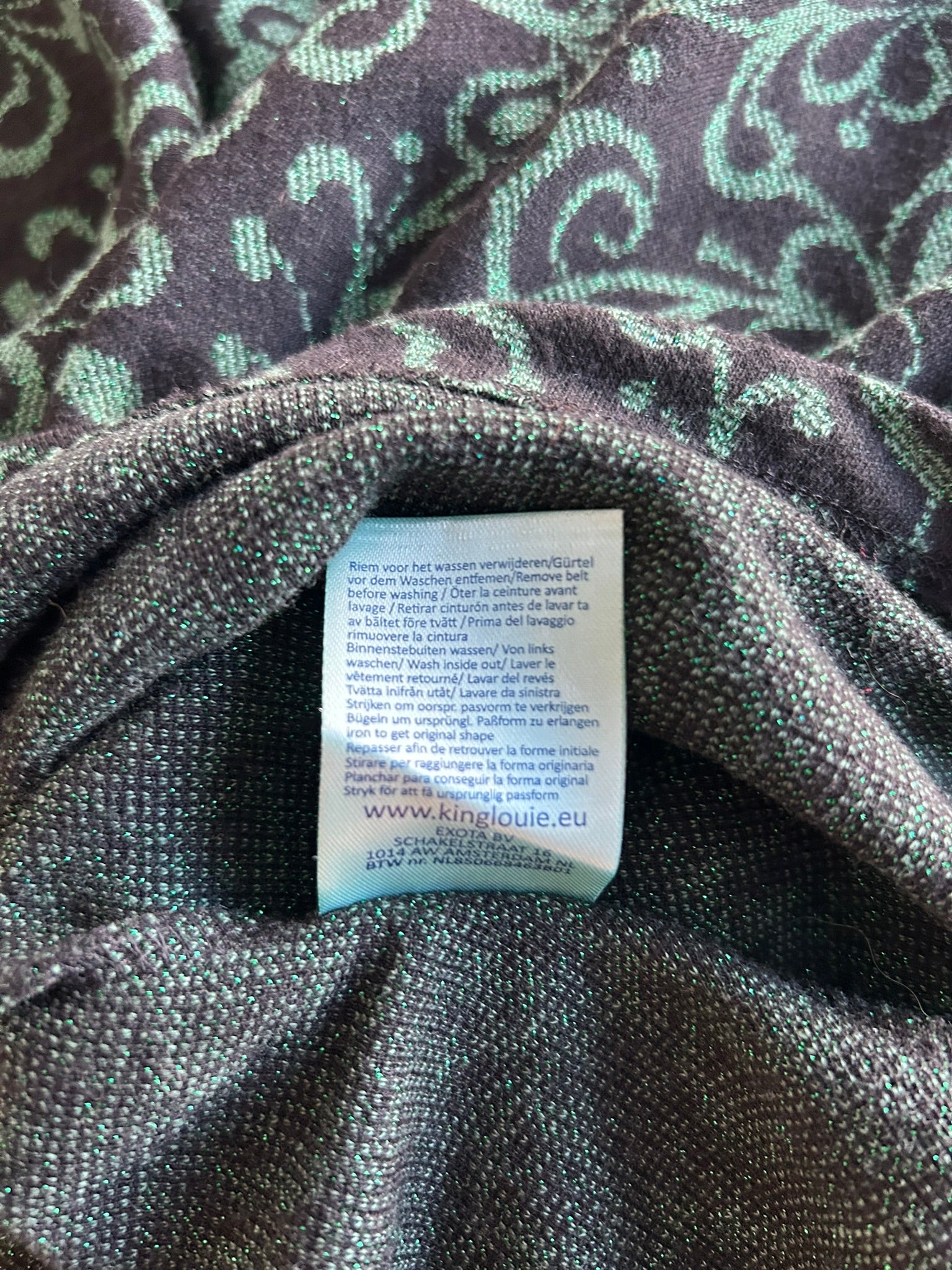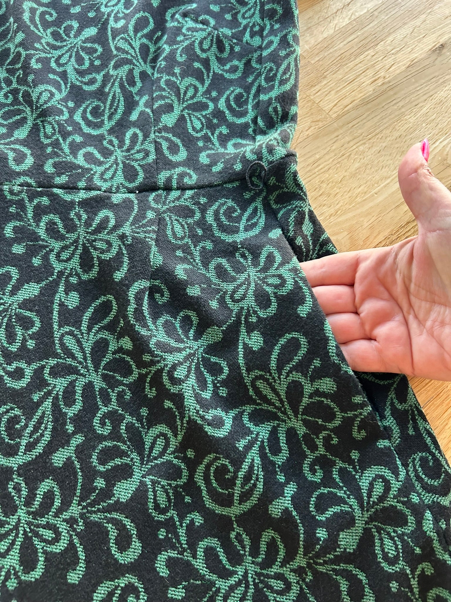 - Mooie boot-halslijn, lockhole in de nek met knoopje, korte mouwen, getailleerd met uitlopende rok en riempje