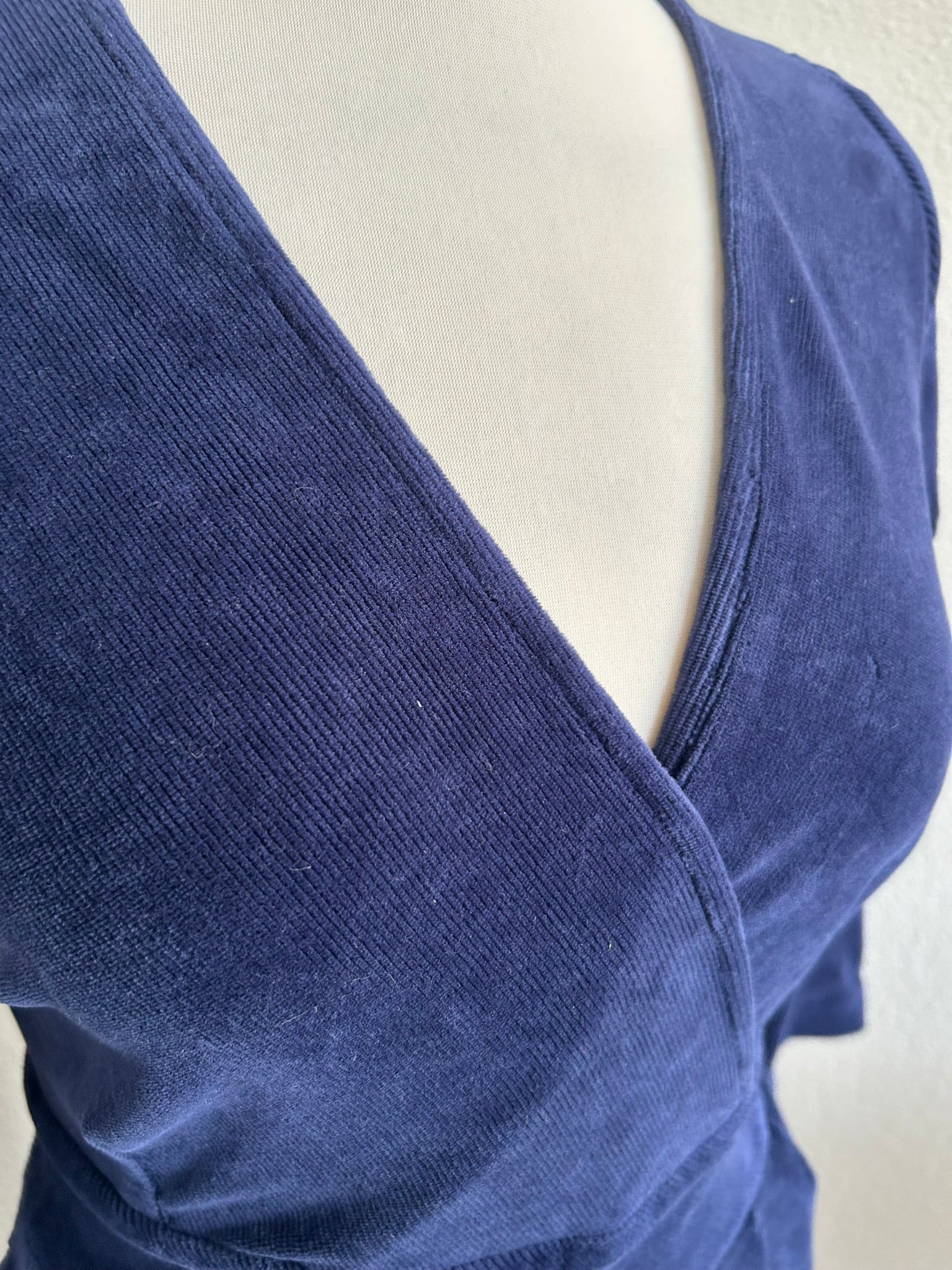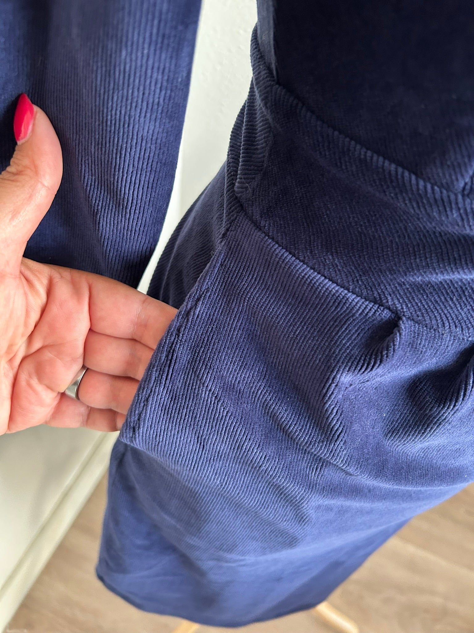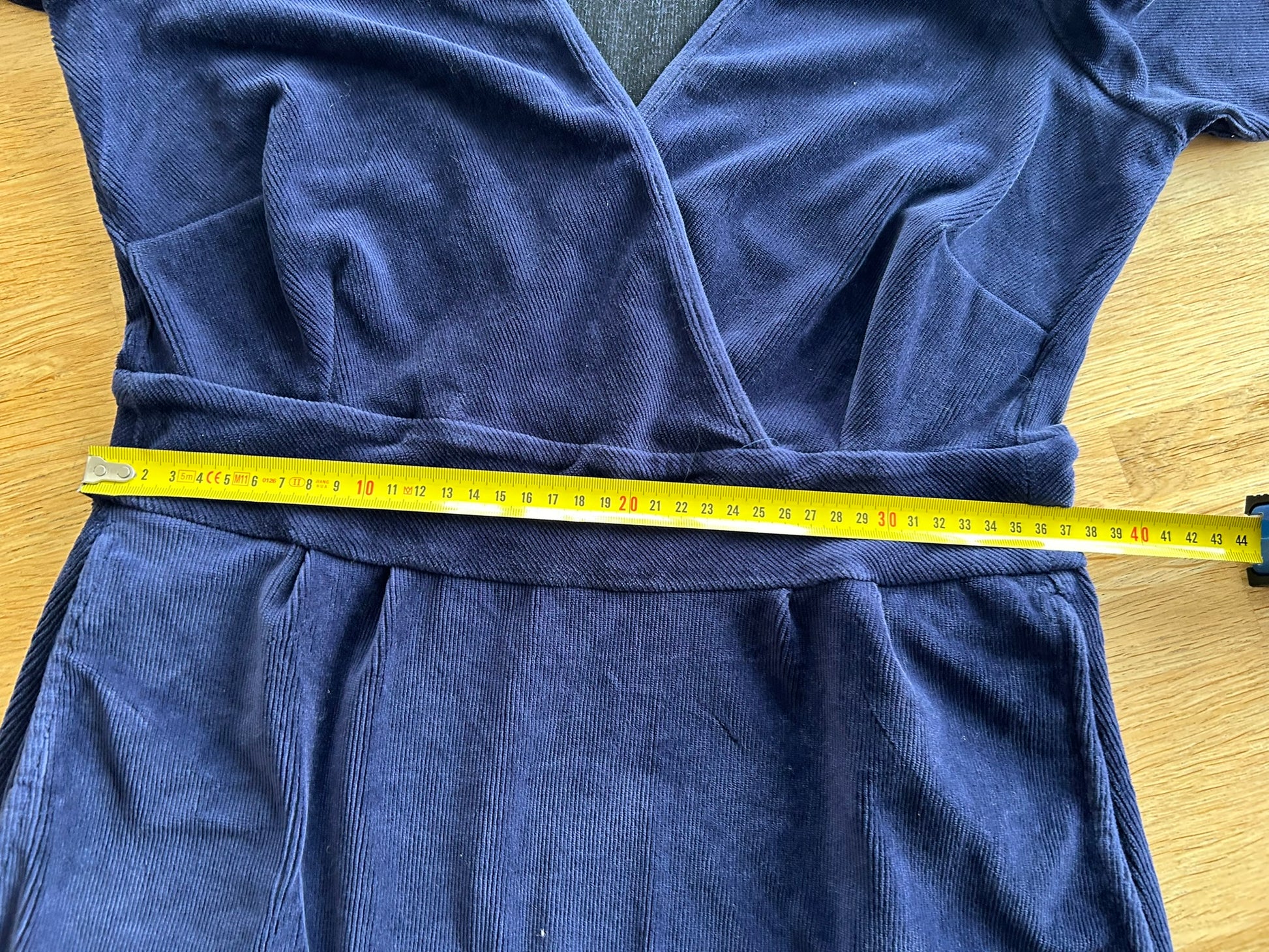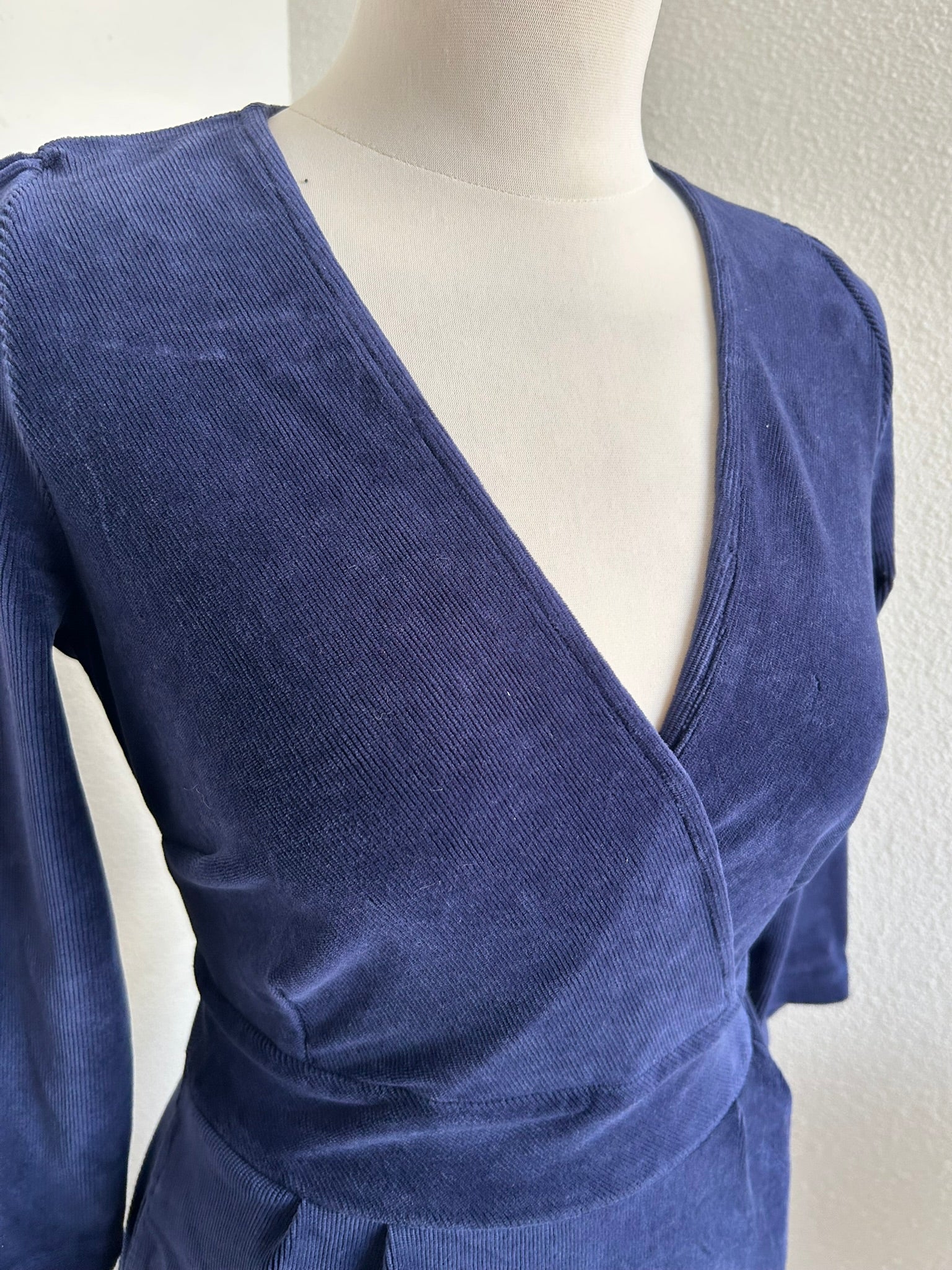- Mooie halslijn met overslag op de borst, lange mouwen, getailleerd door brede tailleband, steekzakken