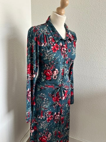 - Mooie halslijn met kraagje, knoopjes op de borst, lange mouwen, getailleerd door knooplint, steekzakken, midi lengte