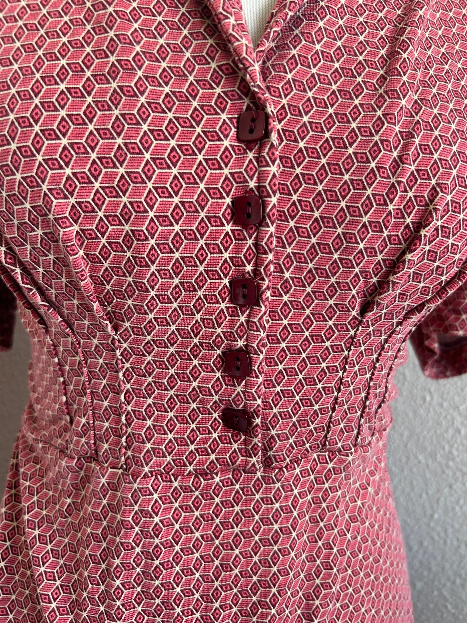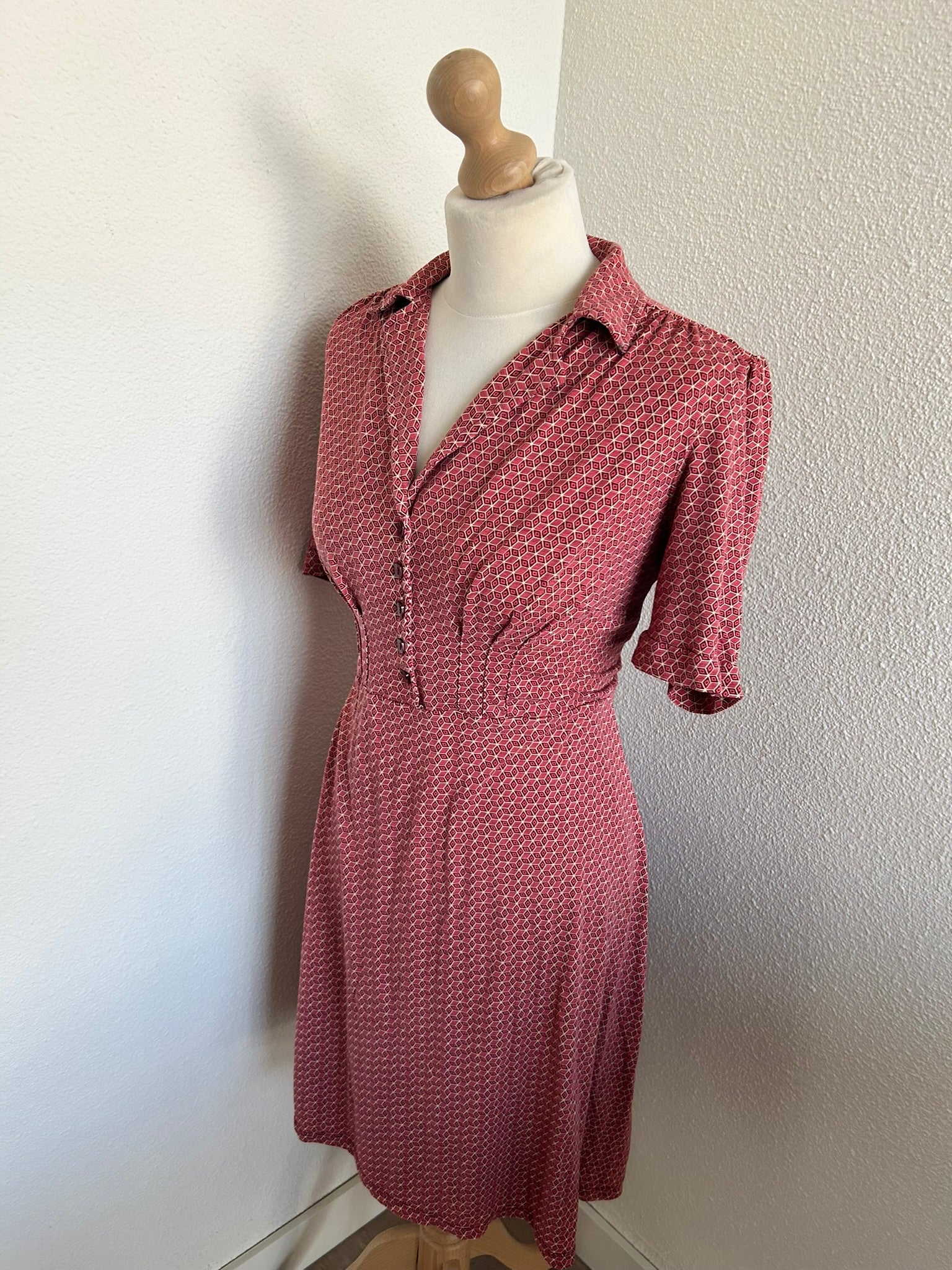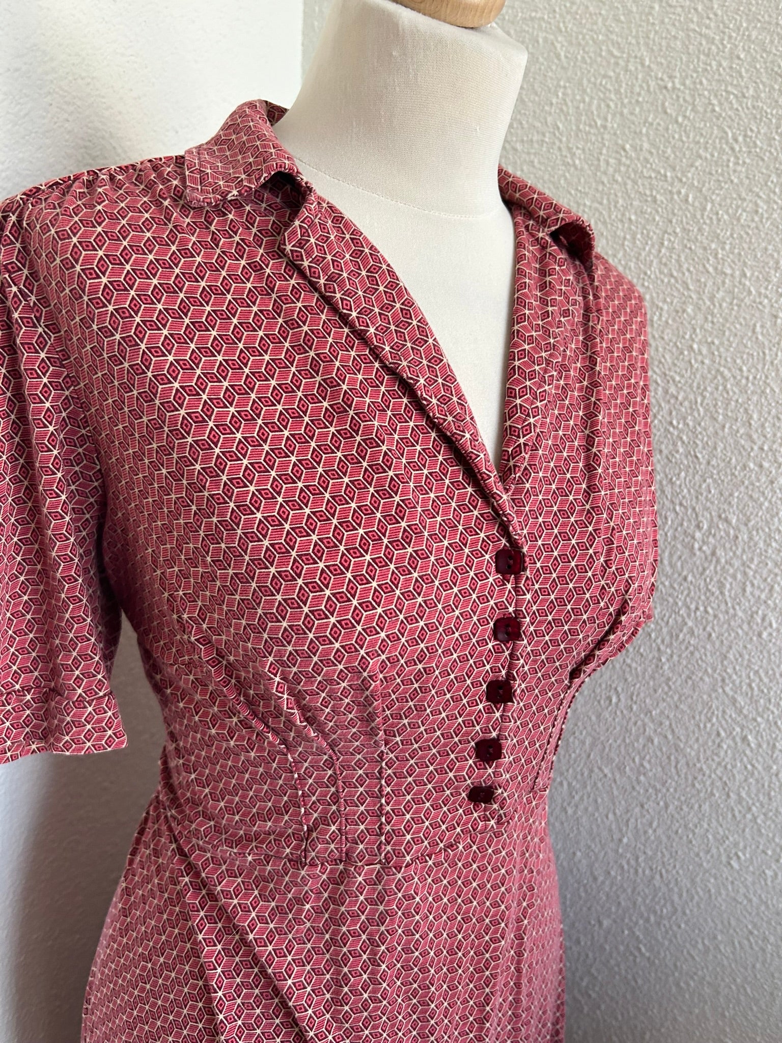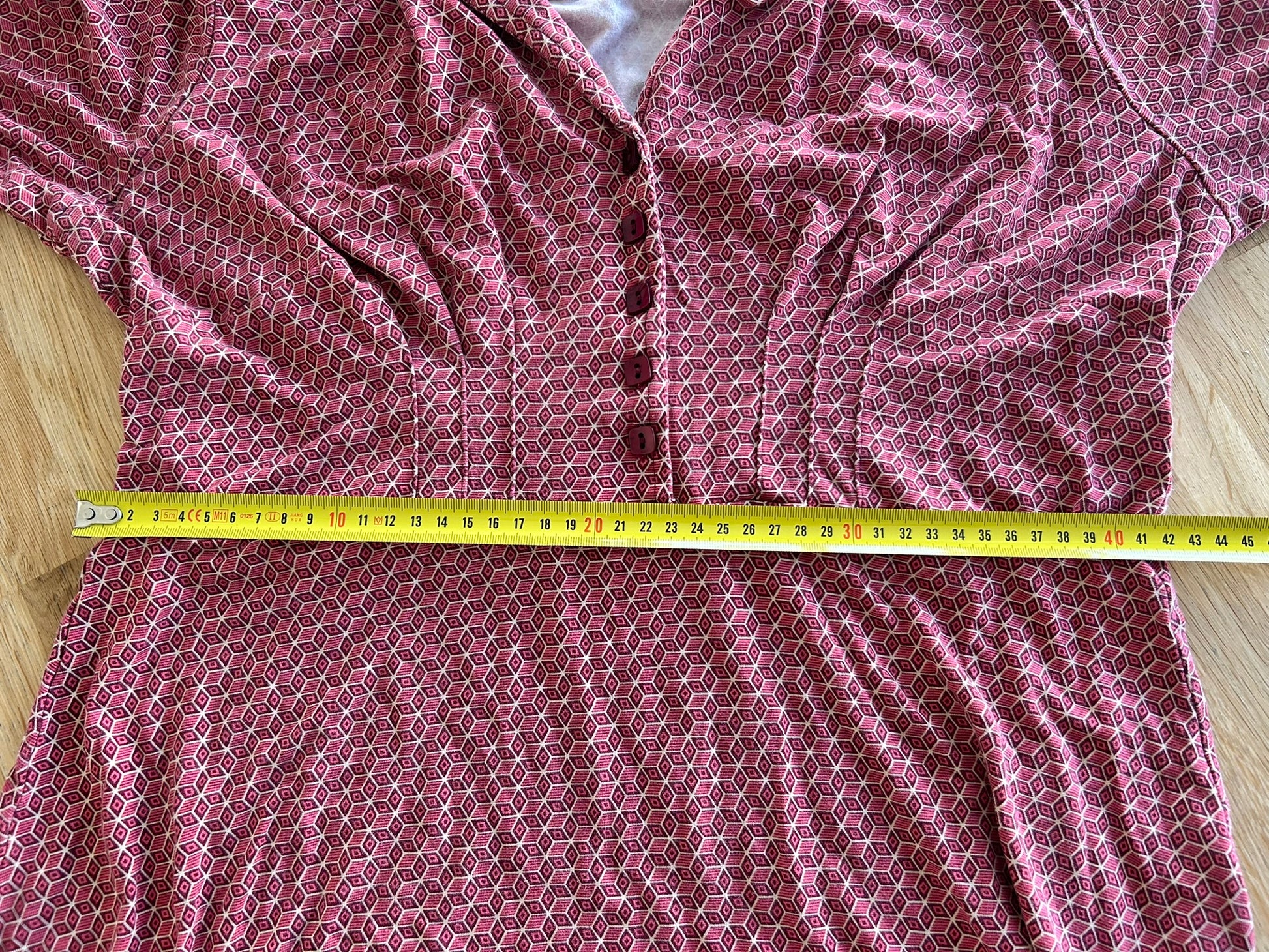 - Mooie halslijn met kraagje en retro vierkante knoopjes op de borst, korte mouwen, getailleerd