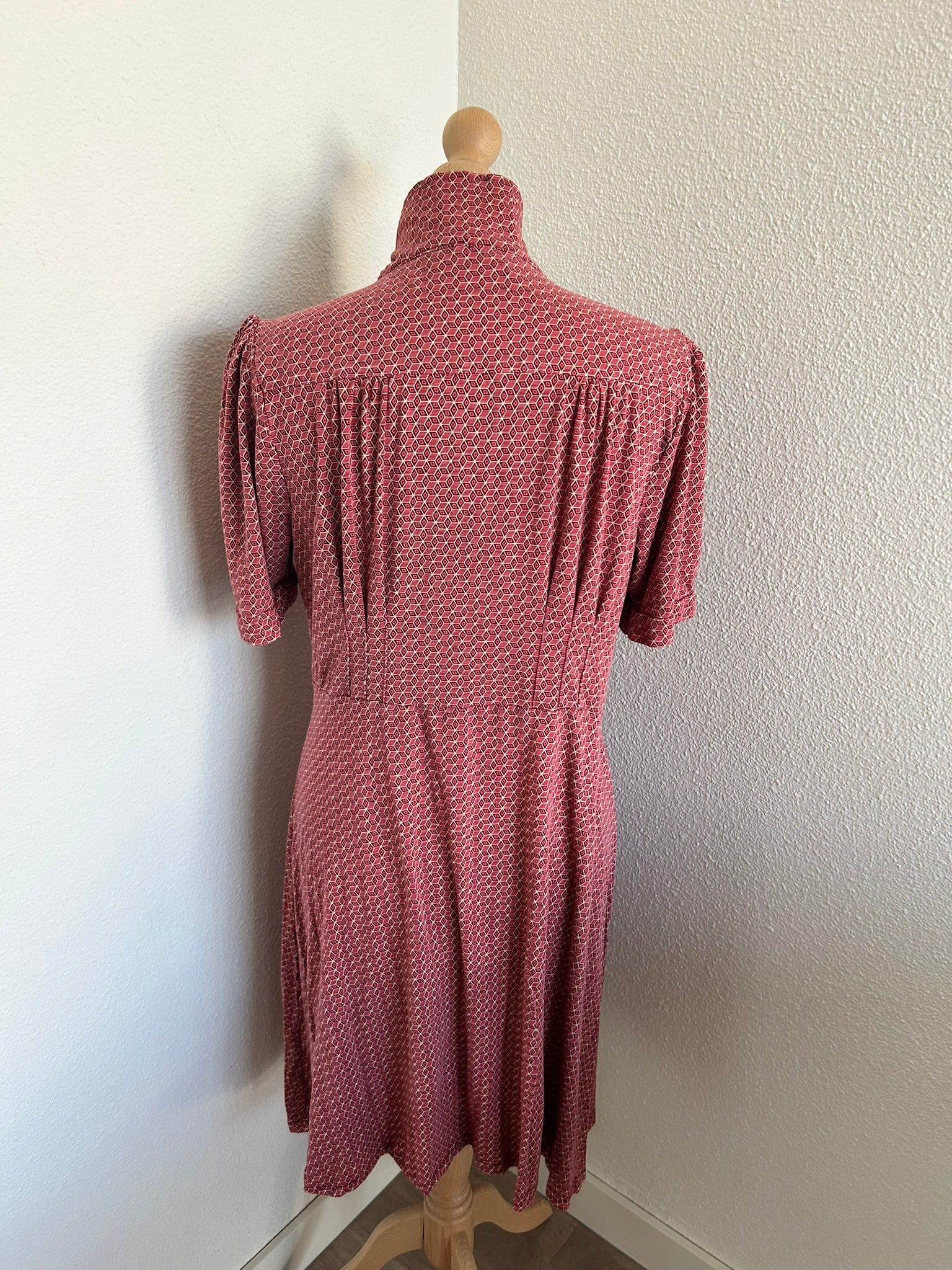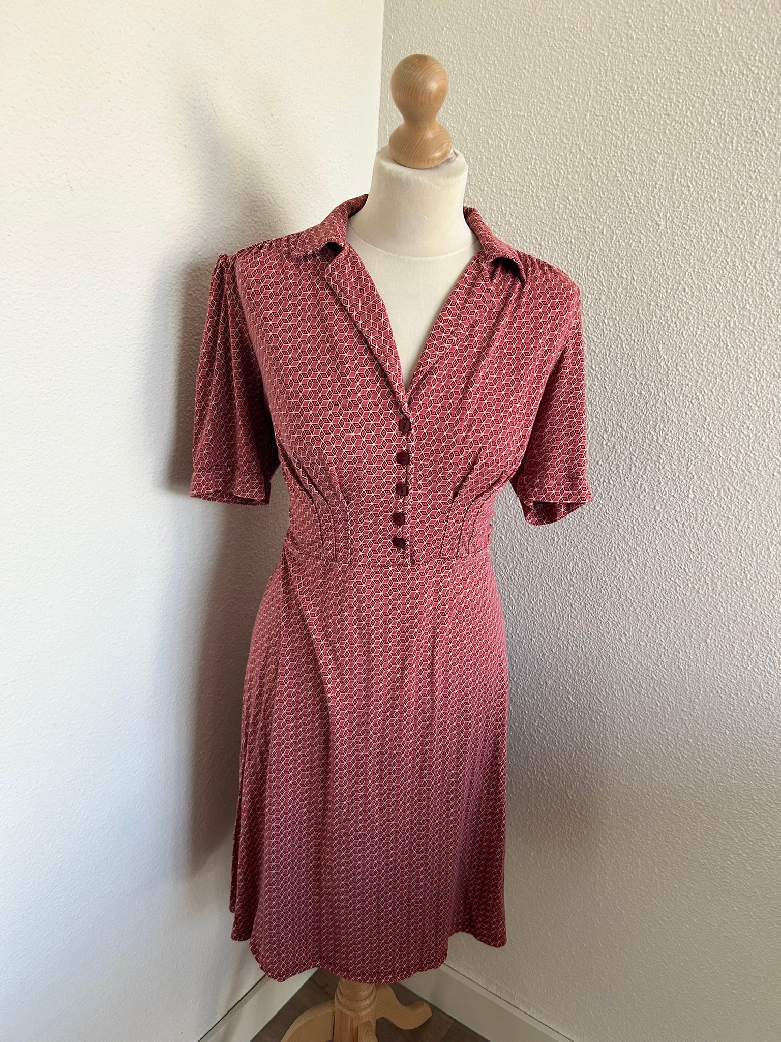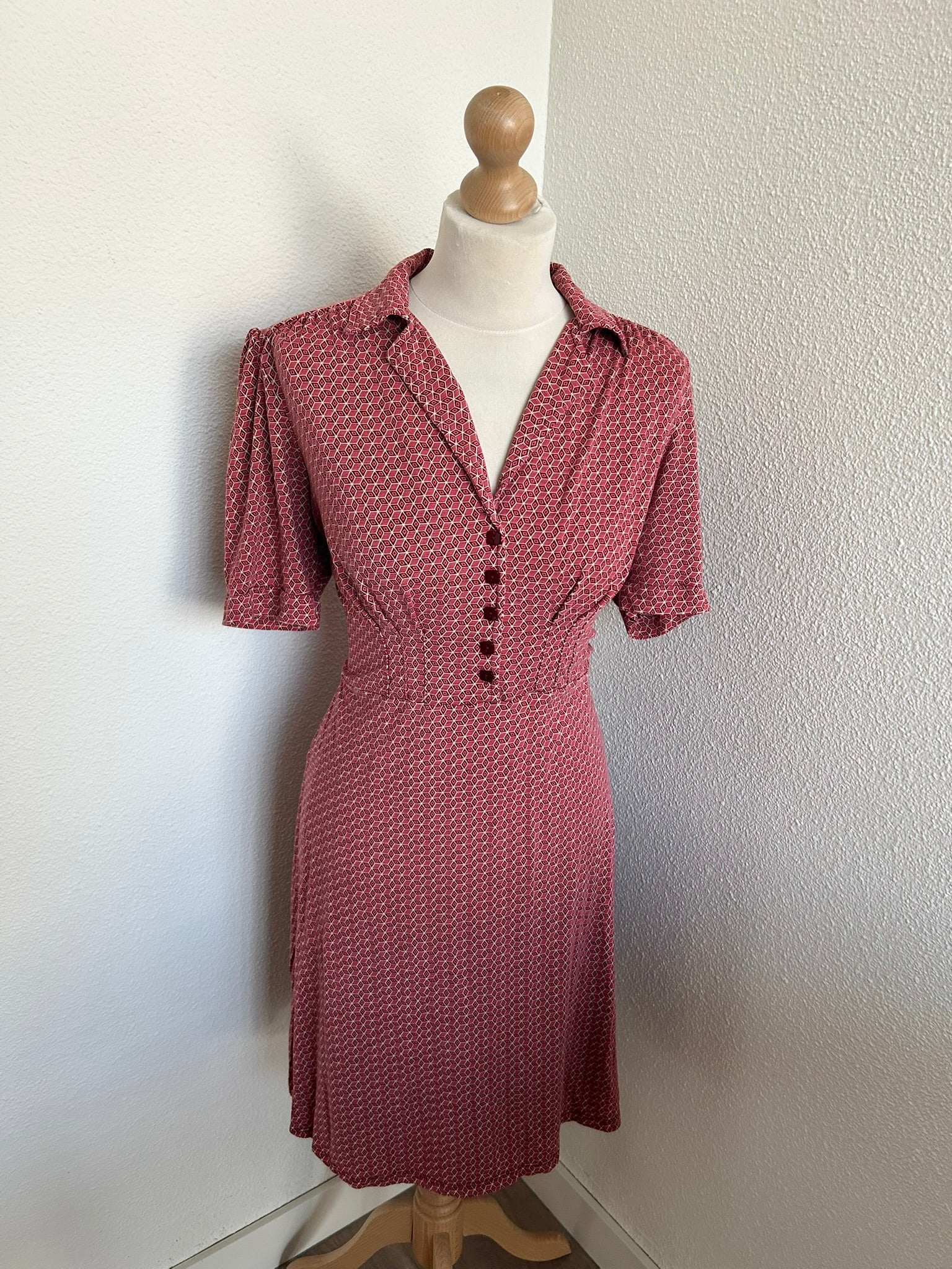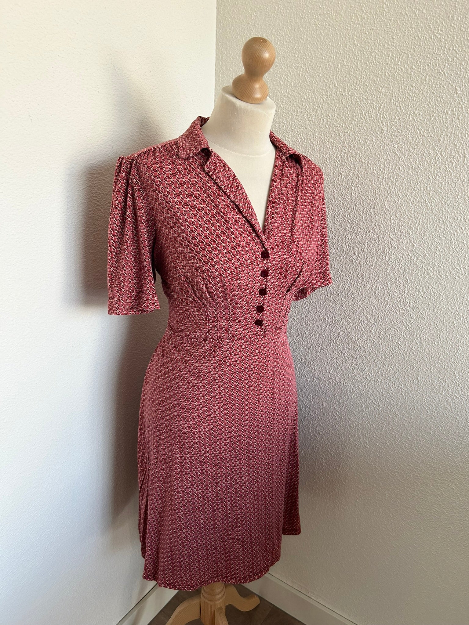 - Mooie halslijn met kraagje en retro vierkante knoopjes op de borst, korte mouwen, getailleerd